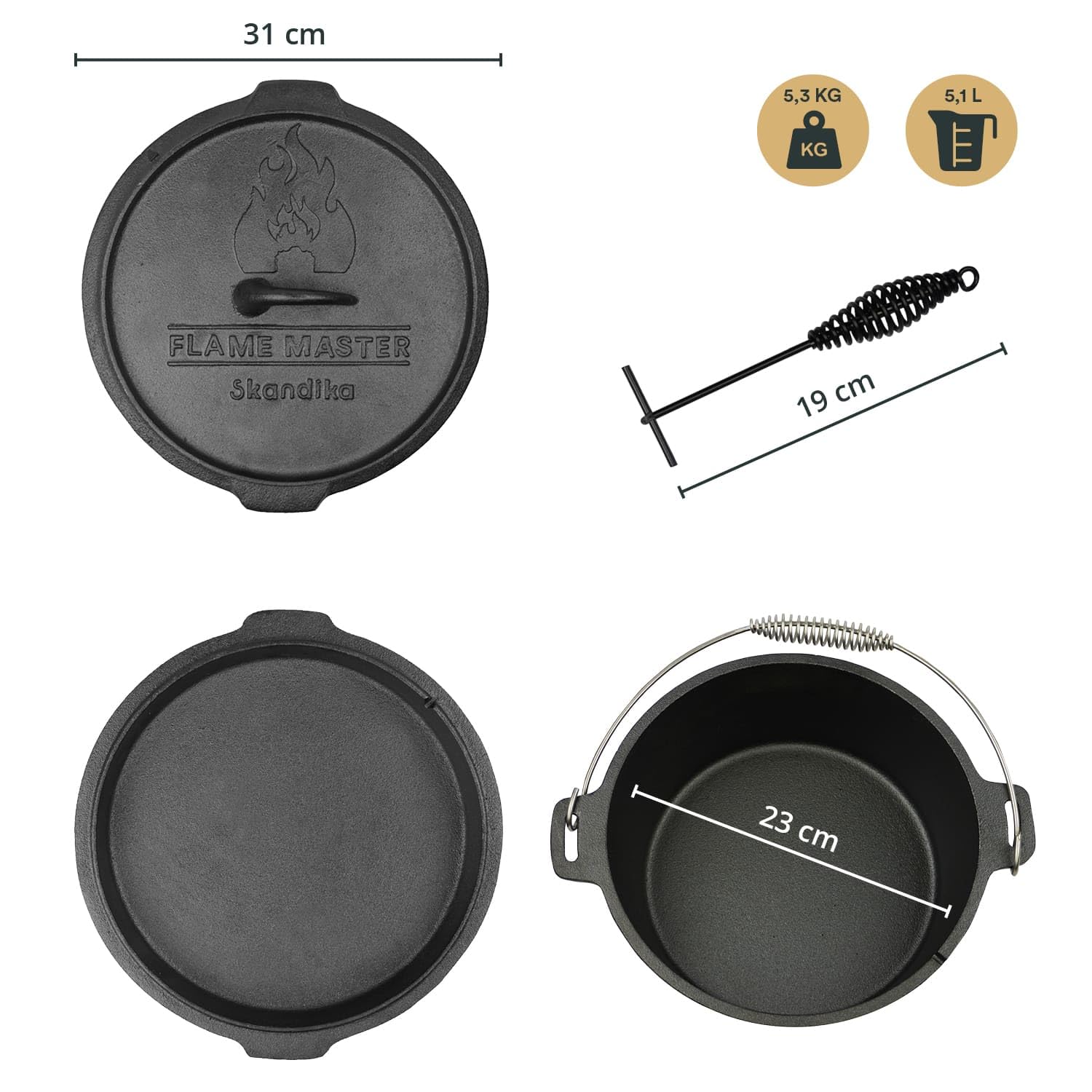 Skandika Dutch Oven Flame Master 5.1 L | Cast iron pot for cooking, includes recipe book by the Sauerländer BBCrew, pre-seasoned, without feet, lid lifter, carrying bag | Fire pot for grilling, camping
