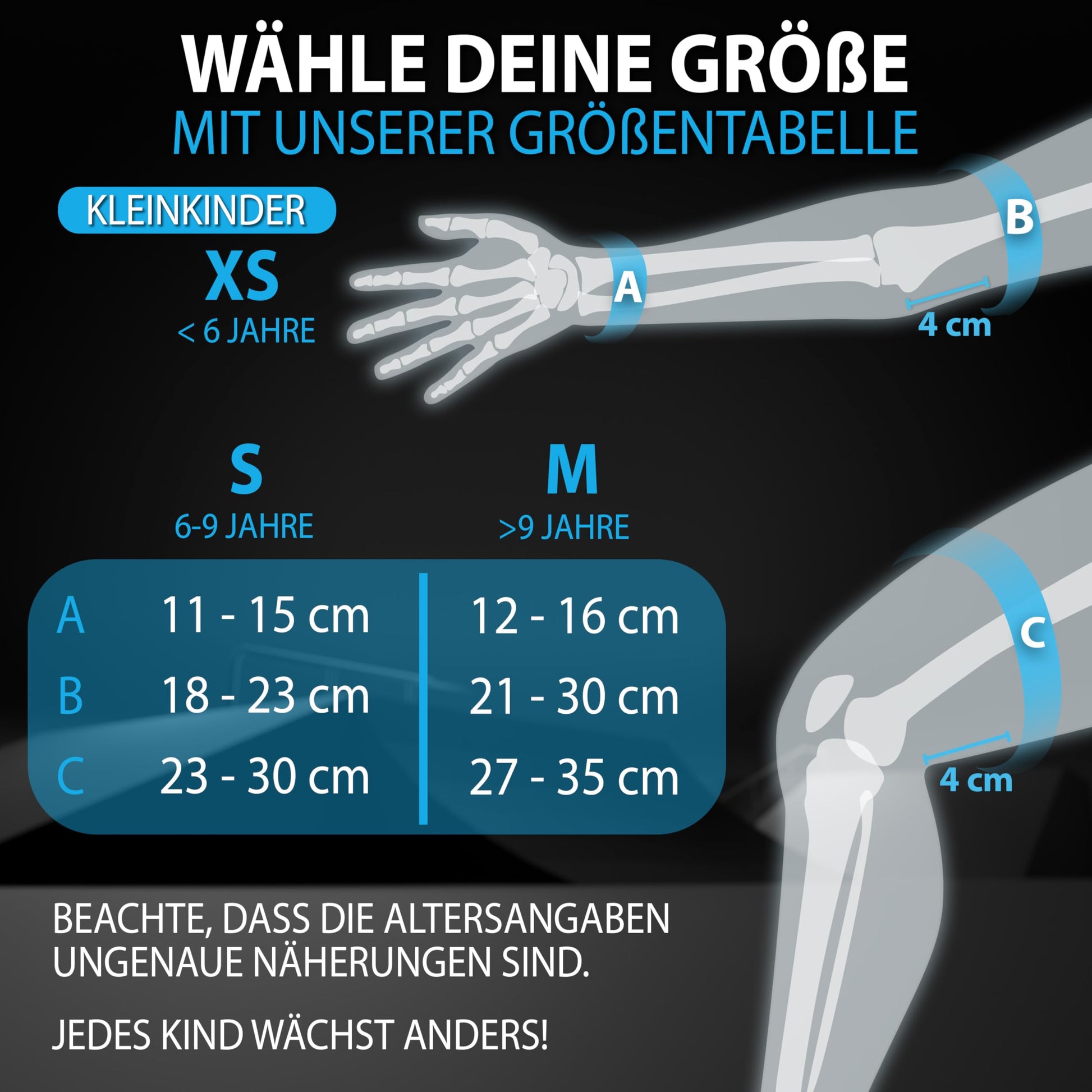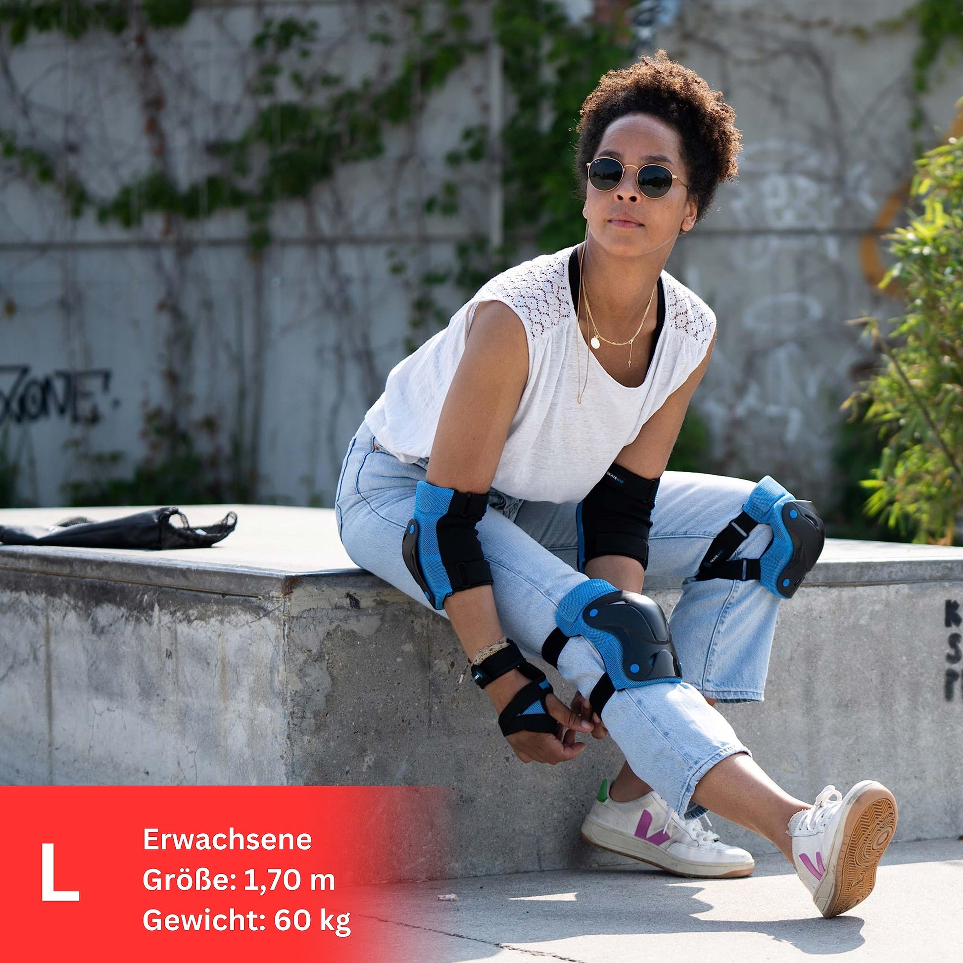["6-piece complete protection - knee, elbow & wrist guards for inline skating, skateboarding, roller skating, scootering. All-round safety for children & adults", "Optimal fit - Lightweight hard shells with cushioning EVA core, breathable materials, wide adjustable ranges, non-slip strap systems for secure hold", "Easy size selection - Children often wear size S (instead of XS), adults often fit size L. Age recommendations in size chart", "Easy to care for & practical - Dry brush or wipe with damp cloth, no washing necessary. Includes carry bag and instructions for immediate use", "Developed in Hamburg - And of course tested according to EN 14120:2003+A1-2007 (by SGS) - Available in blue, pink-white, black"]