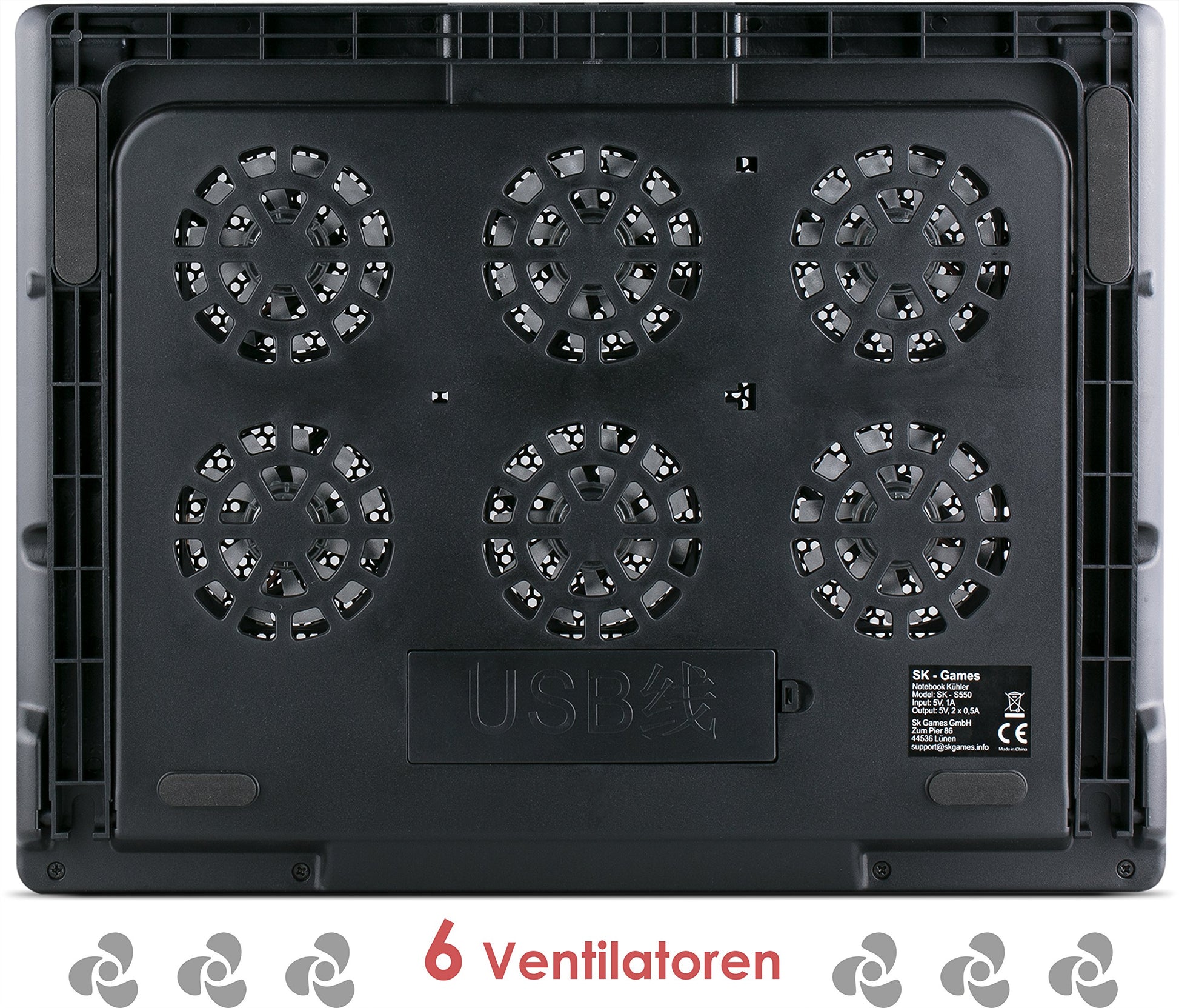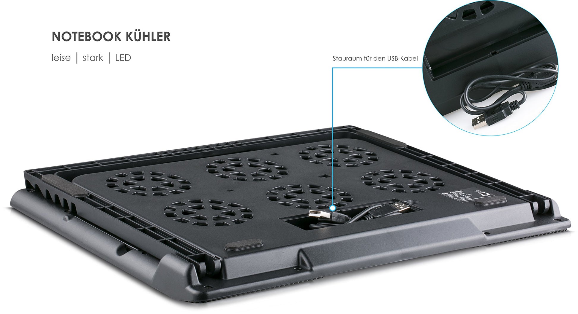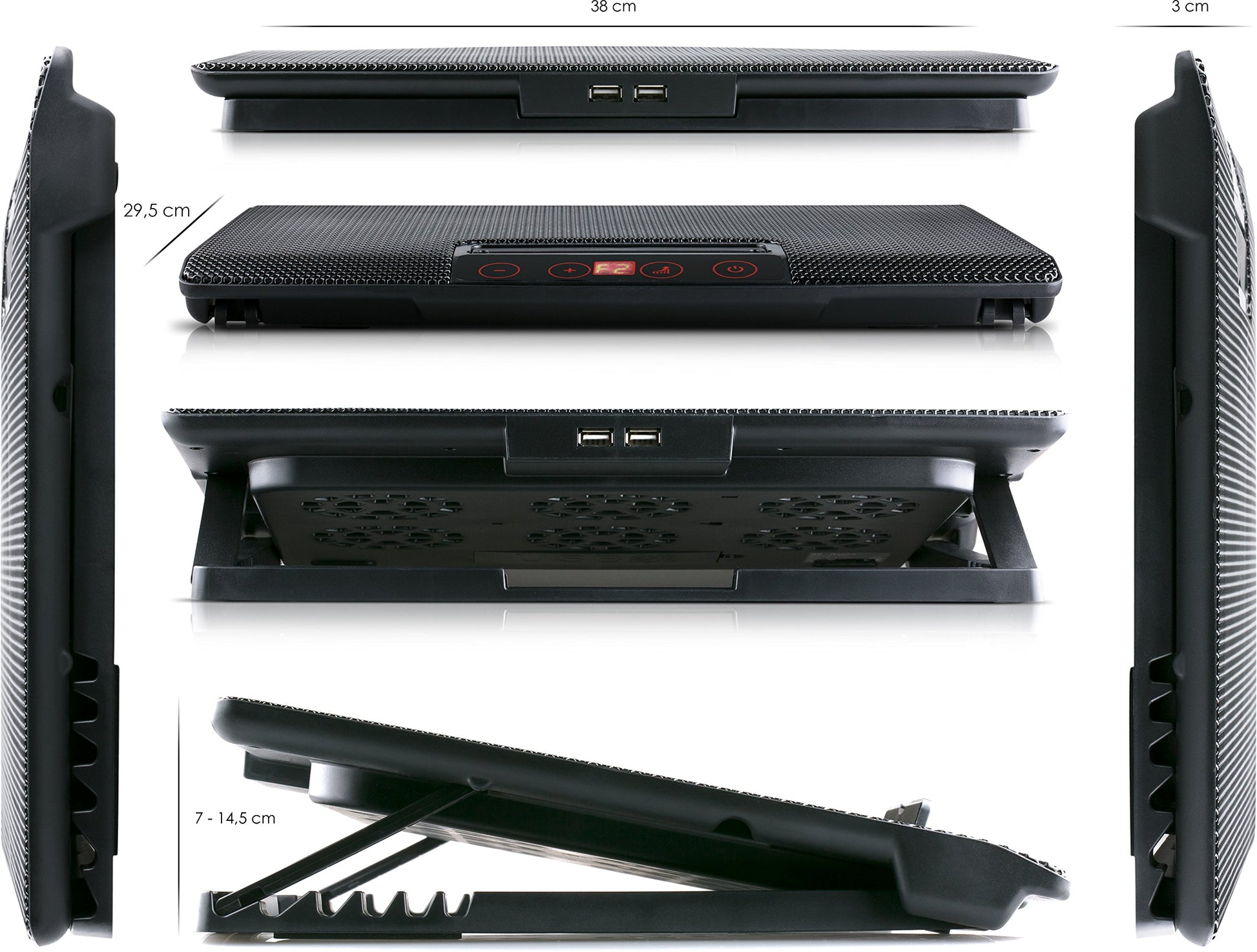 ["6 BLUE LED FANS: The 6 blue illuminated 70mm fans, push a lot of air and cool your notebook optimally. Due to the distribution of the fans, it is particularly effective and very quiet.","FLEXIBLE FAN CONTROL: Thanks to the LCD fan control, you can control the 6 fans individually. You can choose between different cooling programs and switch the fans on and off as needed. You can also adjust the fan speed.","OPTIMAL ALIGNMENT: The adjustable stand allows for a 5-step height adjustment, so you can position your notebook at the ideal angle for you, ensuring optimal alignment of your notebook. Thanks to the foldable anti-slip protection, the notebook stays securely in place.","2 PORT USB-HUB: The notebook cooler is powered by the included USB cable. You do not need an external power supply or adapter. Thanks to the built-in 2-port USB hub, no additional USB port on your notebook is used up.","PRACTICAL METAL GRID: The metal grid on the top of the notebook cooler optimizes airflow for the quick dissipation of the large amounts of heat produced by the notebook. The heat-conducting properties of the metal help cool the notebook and maintain a constant temperature." ]