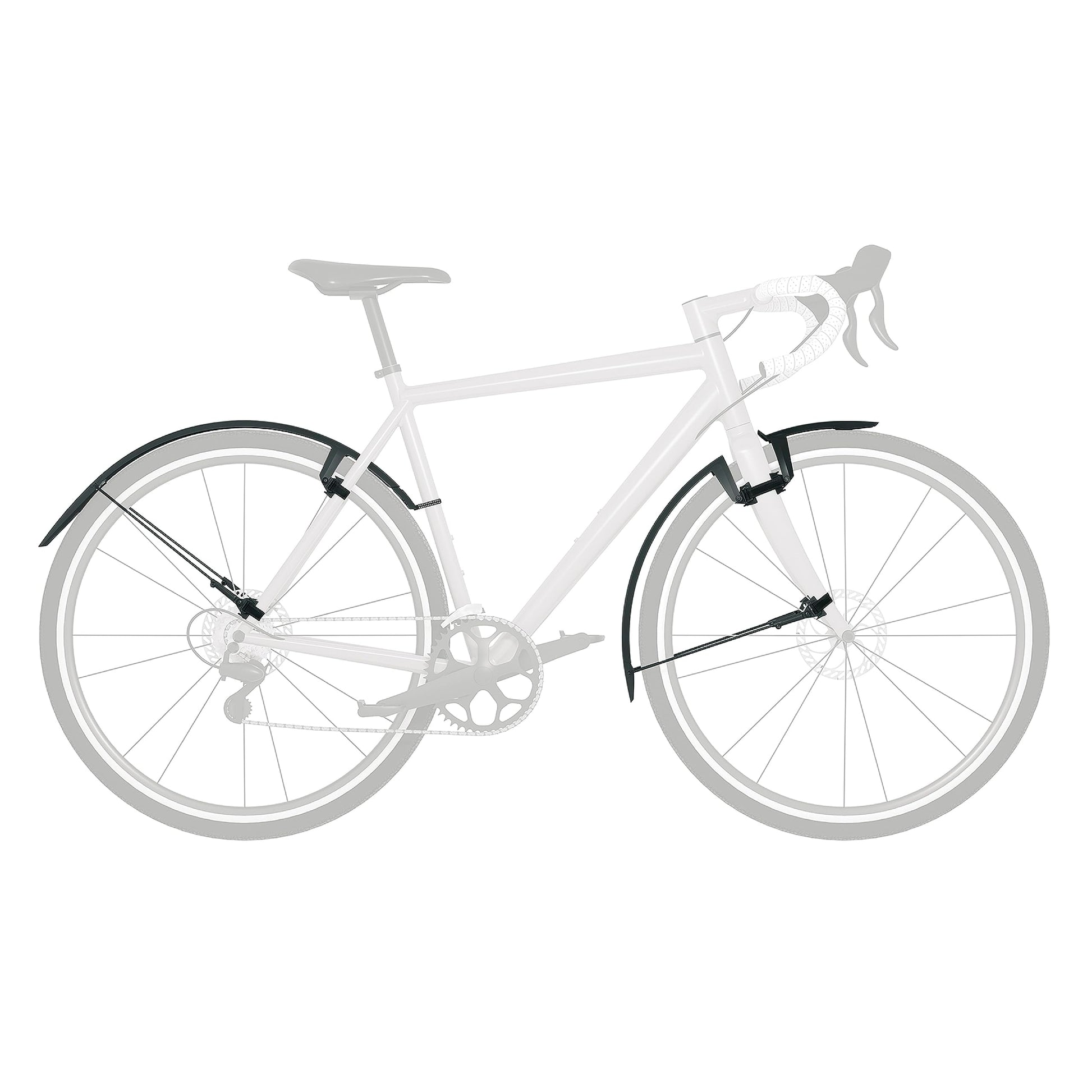 "Optimal splash protection: The mudguard set for gravel bikes, cyclocross bikes, and road bikes with disc brakes offers effective protection against spray water and dirt thanks to the double spoiler function on the front wheel and extendable extension profile on the rear wheel.