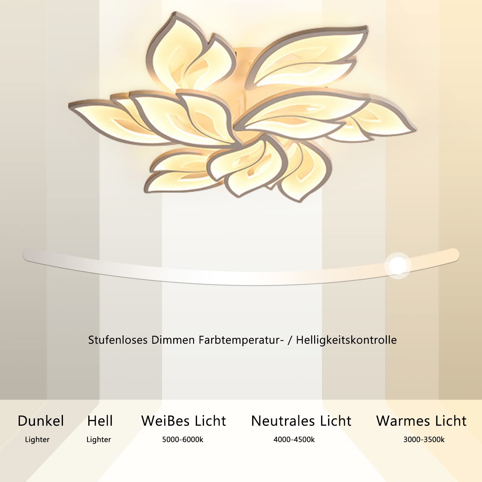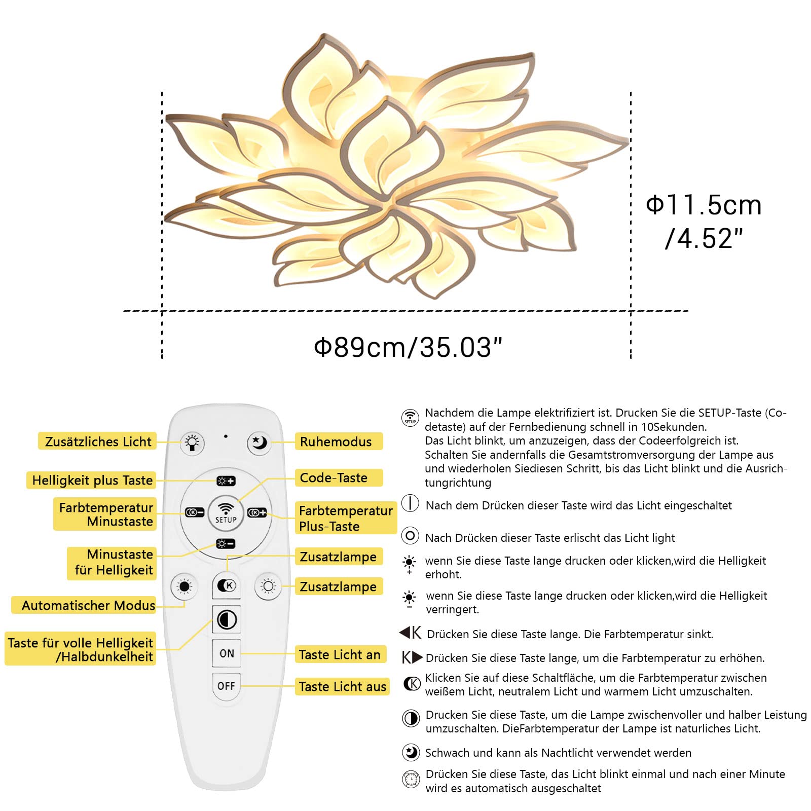 ["【Modern Design】12 Heads Petal Ceiling Light. 360 ° ambient lighting can illuminate the entire room, is your first choice for lighting decoration. The ceiling light made of high-quality iron frame, stable, durable, load-bearing does not deform.","【Energy saving】The ceiling light has a new built-in LED light source, energy saving and environmental protection, low power consumption saves energy and electricity costs. which is 80% more energy efficient than traditional light sources and has a life span of about 50,000 hours.","【Size】35.04*4.53 inches. Material: Iron, Acrylic. Power: 155W. Voltage: AC220-240V. Lumen: 12000lm. Color temperature: 3000-6500K. Illumination area: 20-25㎡. The brightness can be adjusted through the remote control (3000K-6500K). You can enjoy the brightness and temperature brought to you by its convenience.","【Remote Control】Our living room lamp can be controlled not only via wall switch, but also via remote control. The dimmable LED ceiling light has 3 color temperatures, With the remote control, you can adjust the light from 10% to 100%, get a different experience than the usual dimmable LED ceiling light!","【Applicable occasions】suitable for installation in living rooms, bedrooms, kitchens, dining rooms, balconies, and children's rooms. If you have any problems during use after receiving the ceiling light, please feel free to contact us. We offer you perfect after-sales service."]