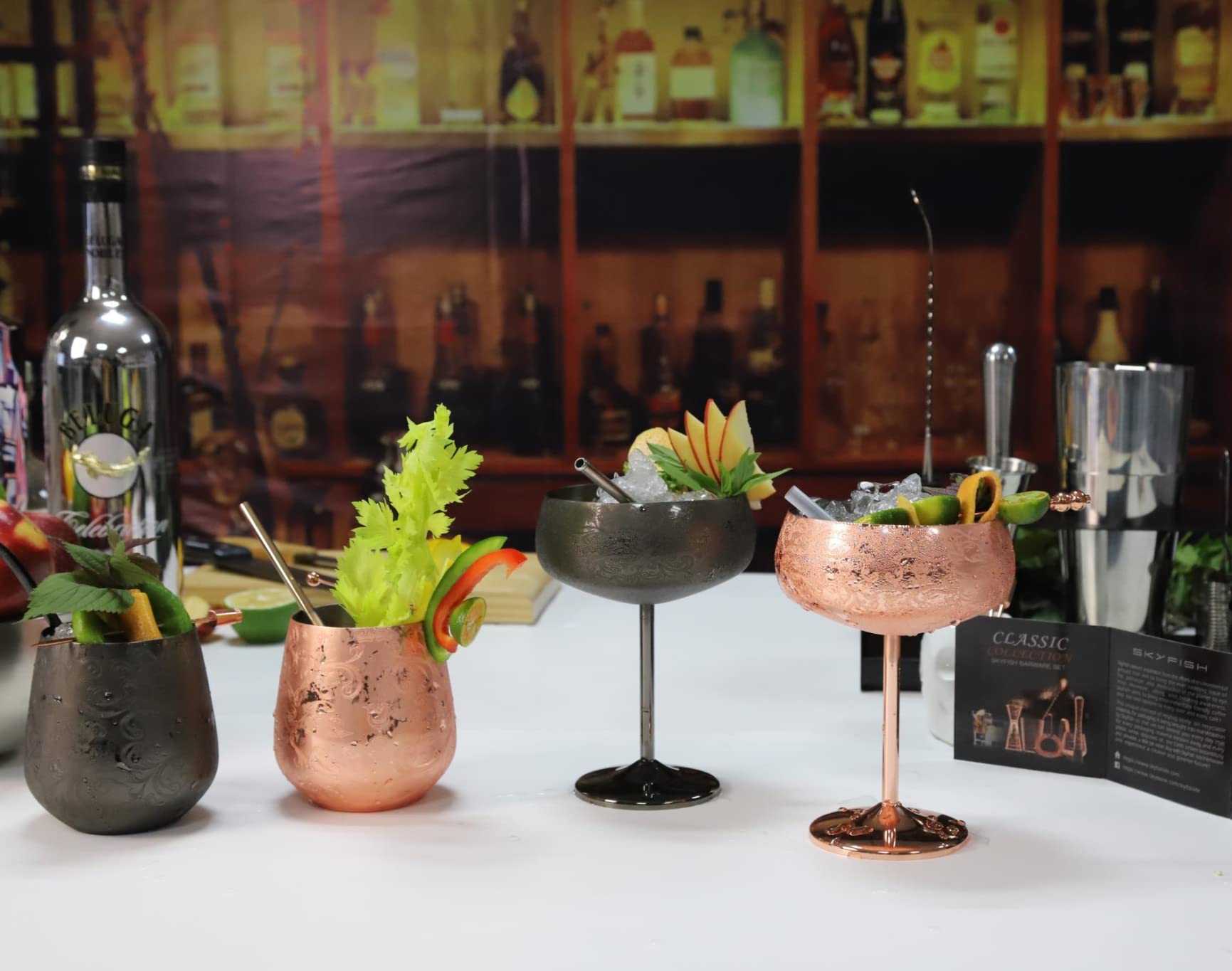 ["UNIQUE DESIGN: The dark knight series bar set with black galvanization and etching pattern takes you back to medieval Europe and brings out the hero in you. Its appearance and feel are absolutely top-notch, speaking of elegance and grace in every way. This bar set is definitely a beautiful addition to your kitchen","7-PIECE ALL-INCLUSIVE COCKTAIL SET: Our Boston Shaker Set includes 26 oz/16 oz shakers; cocktail strainer; Japanese jigger 1 oz/2 oz; European-style bar spoon with spiral handle; ice muddler & tongs","WEIGHTED PREMIUM SHAKER TINS: Made of high-quality food-grade 304 stainless steel. The two shaker tins are carefully designed to provide an excellent waterproof seal when shaking cocktails and easy to break with a light tap","PERFECT GIFT: Our high-end shaker set comes with a premium package, making it a great gift for anyone interested in the science of mixology. Buy it as a gift for a wedding, birthday, housewarming party, Thanksgiving, Christmas gift, Valentine's Day gift, and any other special occasion","Excellent Customer Service: We strive to ensure our customers' satisfaction. Feel free to contact us anytime for any inquiries or support. We are here to provide excellent customer service"]