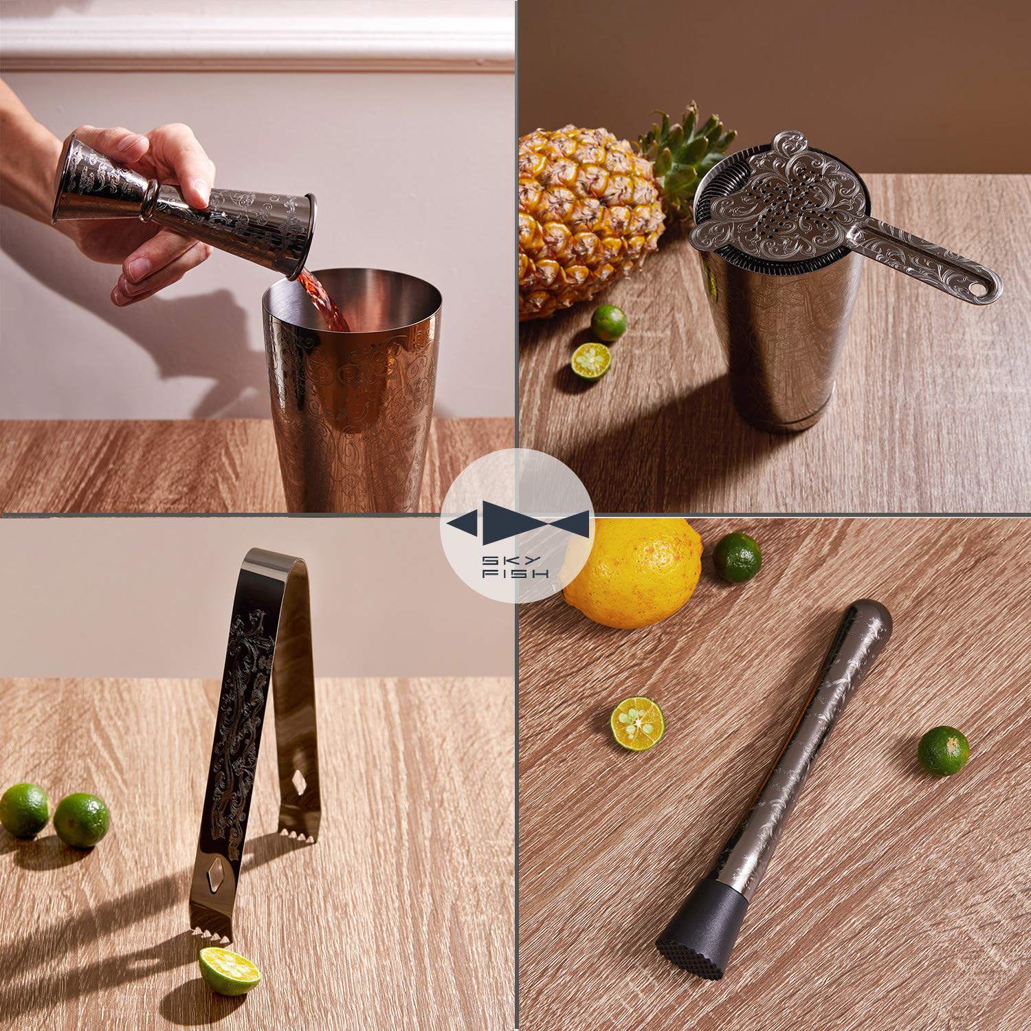 Sky Fish Cocktail Shaker Set, Etched Cocktail Shaker Kit in Gift Box 7 Piece Set, Hand wash only. (Black)