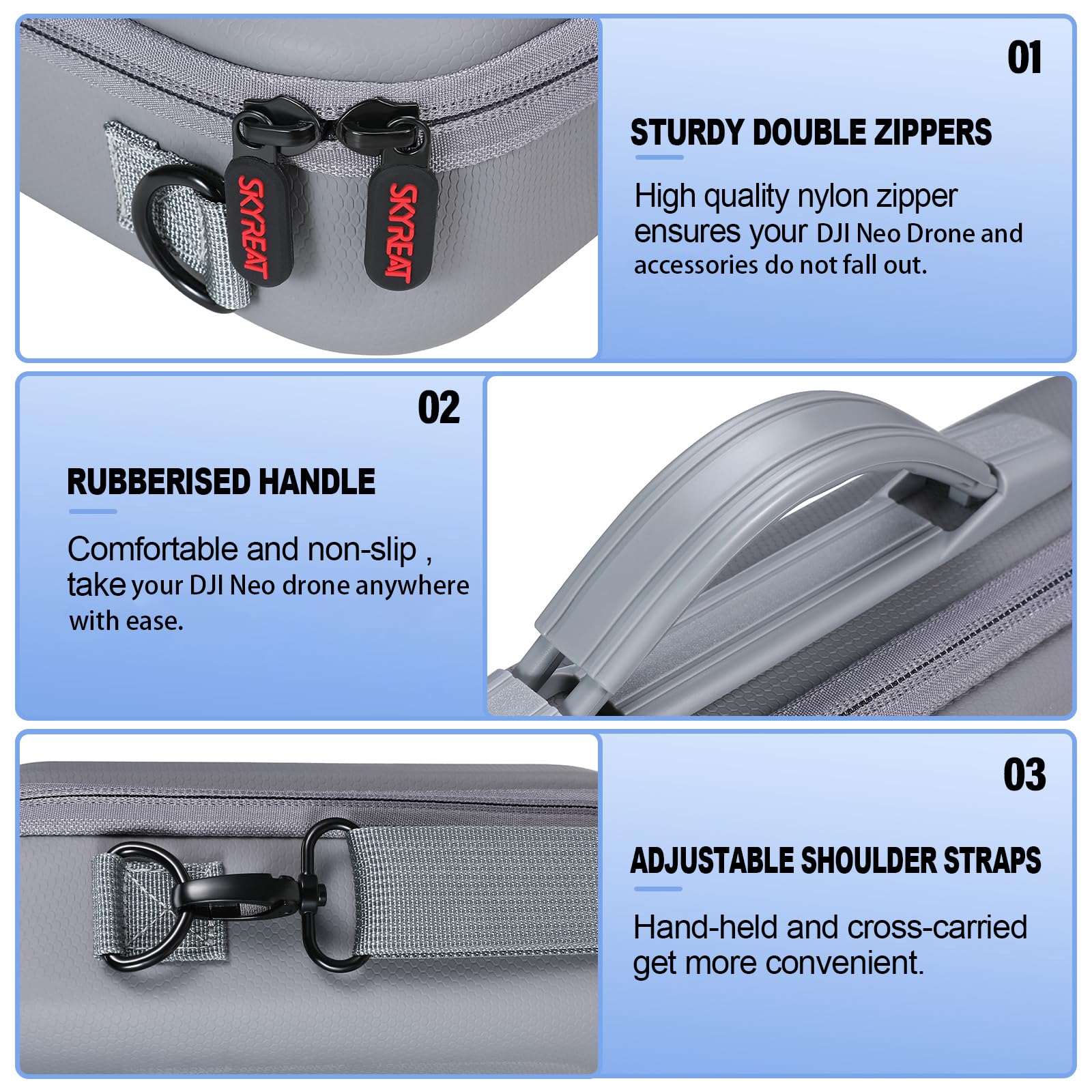 ["【Premium Materials】This portable bag is made of unique PU-Nylon leather material. It fits perfectly with dji neo fly more combo drone, dji rc-n3 remote control, and other accessories.","【Comprehensive Protection】This storage bag provides dustproof, scratch-resistant, collision-proof, shockproof, and rainproof safety protection for dji neo fly more combo during storage and transportation. You don't have to worry about squeezing. Sturdy and durable.","【Large Capacity】Each compartment is tailored for dji neo fly more combo. It can store dji neo drone (with gimbal protector), dji rc-n3 remote controller, 4 x intelligent flight battery (3 included in the charge hub), Two-Way Charging Hub, spare propellers, type-c to type-c pd cable, screwdriver, spare propeller screw, rc cable (sub-c connector), power adapter, control joysticks, and other accessories.","【Easy to Carry】This portable case with a non-slip handle and an adjustable shoulder strap can free your hands. It's an ideal choice for outdoor travel and home storage. You can take it anywhere.","【Package List】1 x dji neo carrying case (for dji rc-n3 remote controller), 1 x shoulder strap. (Note: Only case, drone, and other accessories are NOT included.) Size:31.5*22.5*8cm/12.4*8.9*3.2in, Weight: 0.6kg/1.3lb."]
