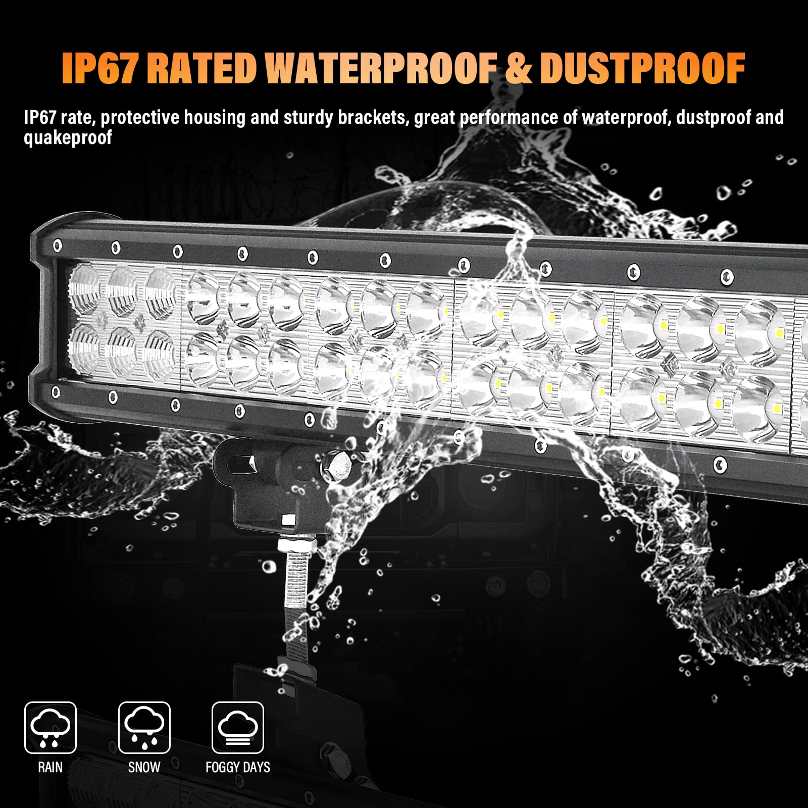 ["High brightness: The LED work light uses powerful LED chips, emitting 6000K bright white light. Flood spot beam combination, The LED bar 12v 24v can provide you with a long irradiation distance and a wide field of view.", "IP67 Waterproof: These SKYWORLD LED Light Bars have a waterproof IP67 rating, dustproof, earthquake-proof, explosion-proof. Rust and corrosion-resistant aluminum housing and mounting bracket make it more durable.", "Better Heat Dissipation: Made of an aluminum die-cast alloy housing and high-quality heat-conducting silicone gel. It can maximize the surface area to dissipate heat better, extending the life of the LED light bar.", "Easy to Install: SKYWORLD LED Light Bars with adjustable mounting brackets can adjust the LED work light to about 45 degrees, making it easier to change the direction of the light beam.", "Wide Application: Suitable for 12V / 24V vehicles, SKYWORLD LED light bar automotive is suitable for various types of trucks, cars, JK Wranglers, ATVs, SUVs, tractors, 4x4s, trucks, mining, boating, outdoor lighting, agriculture, and heavy equipment, etc."]