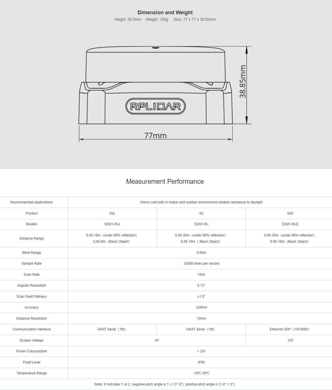 ["Excellent distance accuracy] Models: S2M1-RxL; Range radius: 59 feet; Power supply: 5 V; Sampling rate of 8-15 Hz; Power consumption > 2W; Communication interface: URAT Serial (1M); The height of the optical scan range of RPLIDAR S2L is only 0.59 inches, making embedding easier. Weight: 190 g, Size: 3.03 x 3.03 x 1.53 inches.