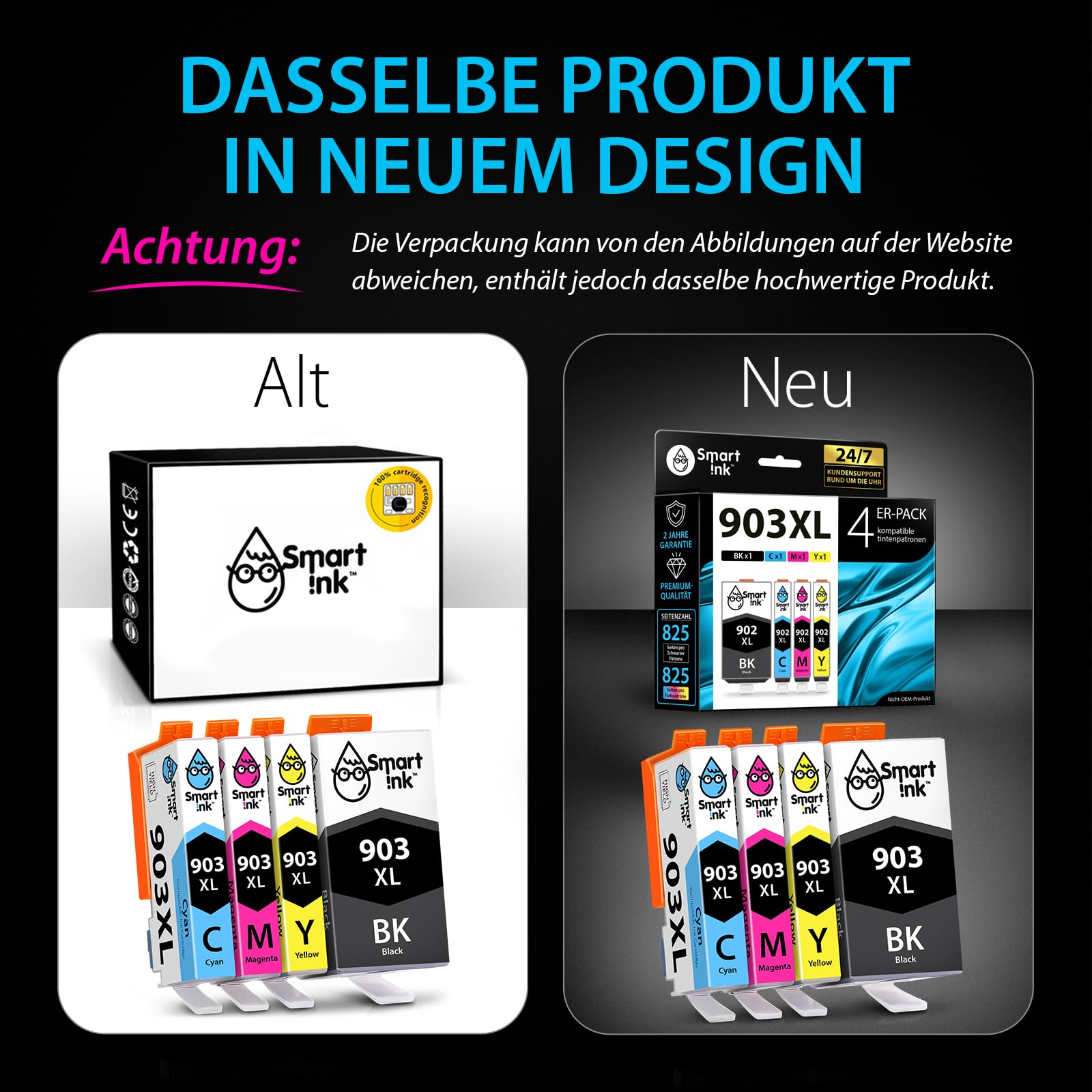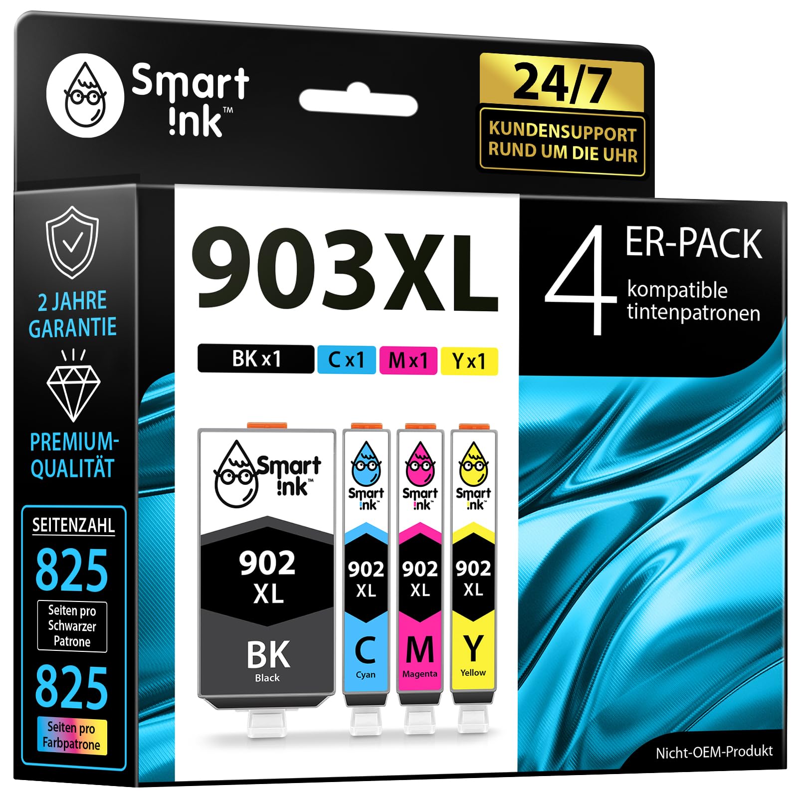 Smart Ink compatible printer cartridges as a replacement for HP 903 XL 903XL 4 Multipack (Black XL & Blue Red Yellow) with Advanced Chip Technology. Compatible with Officejet 6950 Officejet Pro 6960 6970 printers.