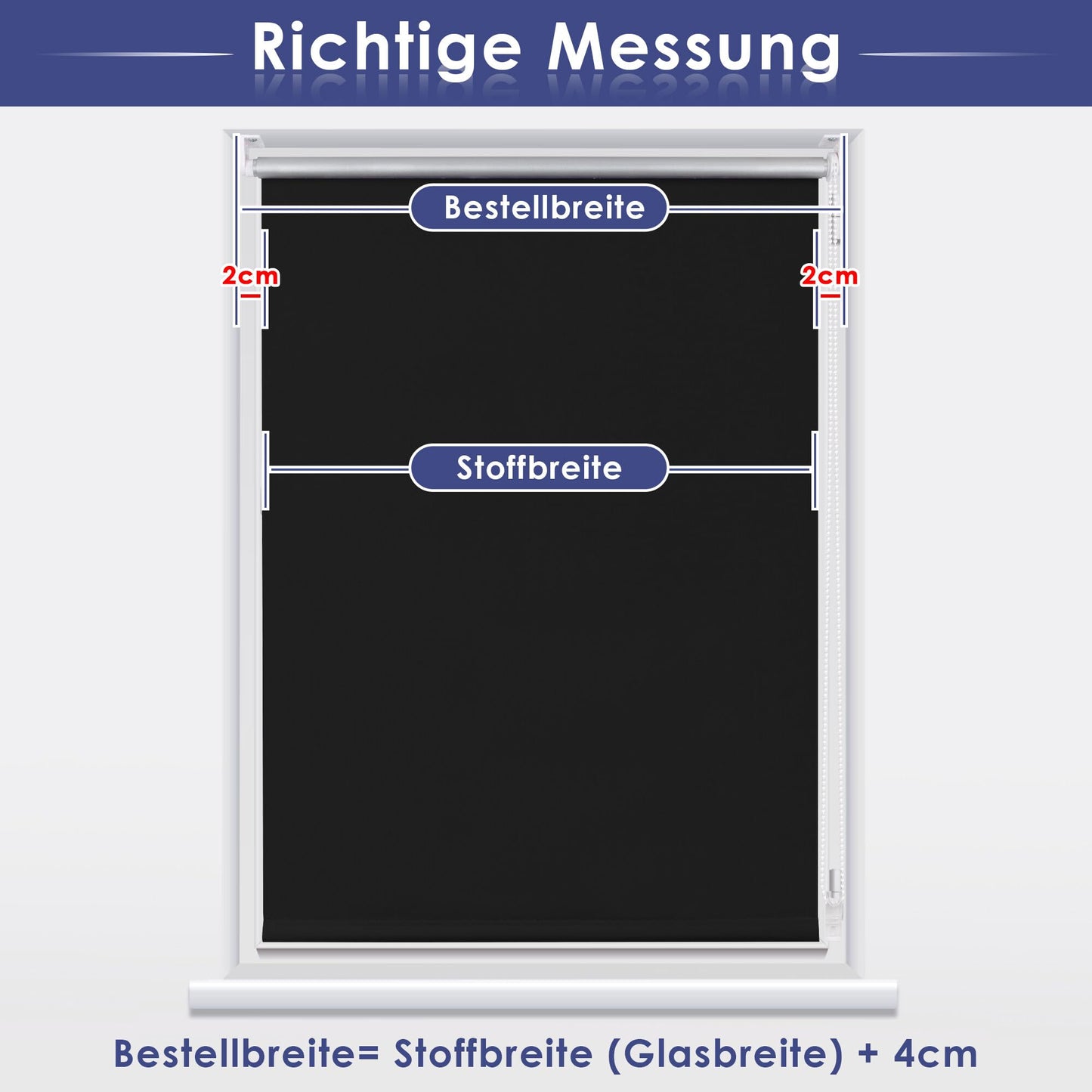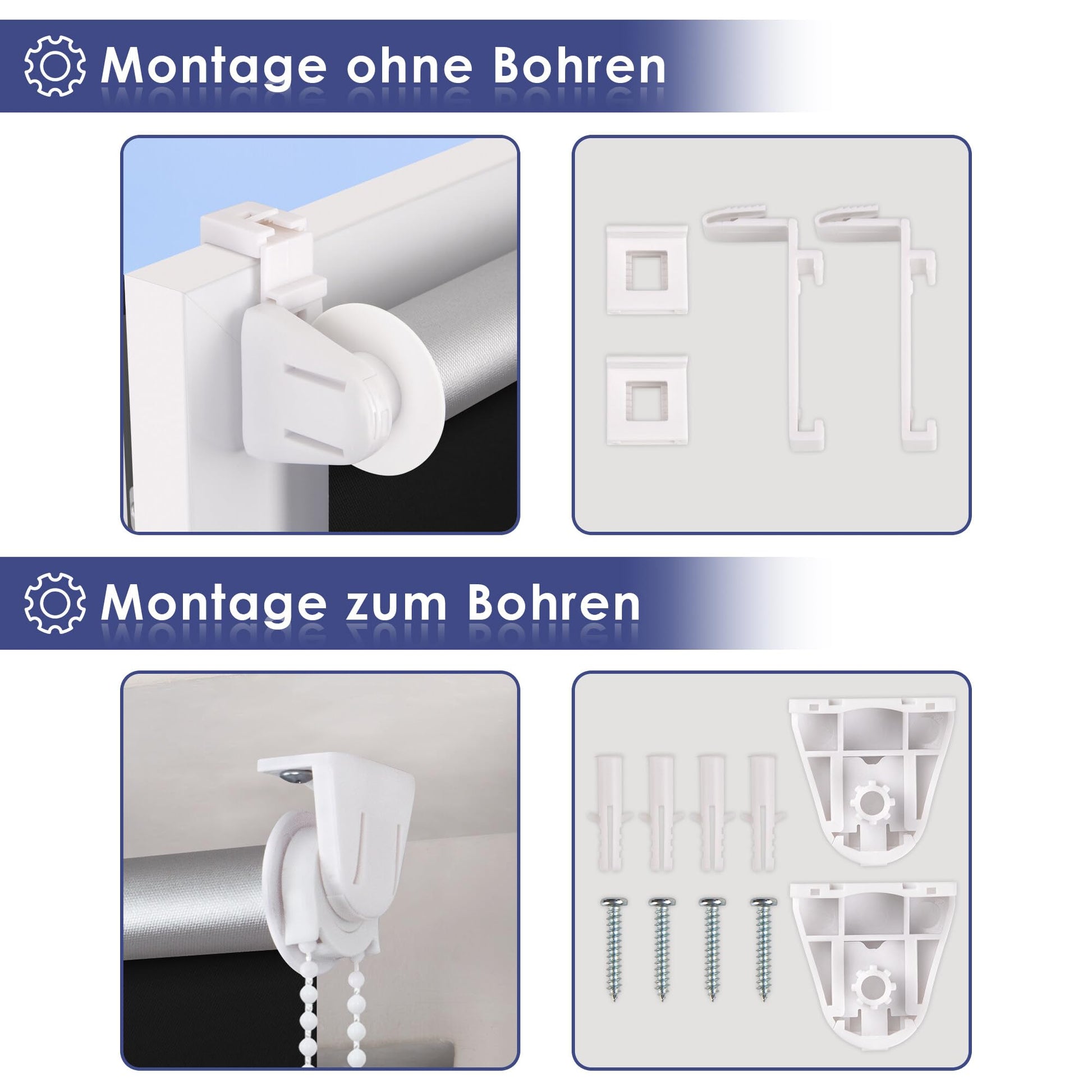["Material: The blackout roller blind is made of 100% polyester fabric with a silver thermal coating on the back. With OEKO-TEX certificate, non-toxic and not harmful to health. It is warm in winter and cool in summer. Its mold-resistant properties allow installation in humid rooms and are easy to clean and maintain","100% blackout and privacy: The blackout roller blind without drilling darkens the room and provides effective protection from sunlight and UV rays while protecting privacy. It is also a good sleep partner for complete darkness","Temperature regulation: With the special fabric, the roller blind without drilling provides additional protection against strong daylight and heat in summer. In winter, it can also reduce heat loss, saving you unnecessary heating costs. Whether at home/in the office, you need such a durable blackout roller blind","Installation without drilling or with drilling: Our thermal roller blind without drilling offers you 2 installation options: Without drilling (suitable window frame thickness: 15 to 23 mm) and ceiling mounting for drilling or wall mounting. With the included accessories, you can choose the installation that suits your needs. But the blackout roller blind is not suitable for roof windows and most wooden windows","Size: Order width refers to the total width of the blackout roller blind with accessories. The fabric width of the blind is approximately 4 cm shorter than the ordered width. For example: For a 66 cm window, a 70 cm wide blind should be purchased. But the fabric should not overlap the window handle","Chain pull: The chain pull can be installed on the left or right as needed. Thanks to the easily adjustable chain pull, you can fix the blind at any height and easily regulate the light entry. With continuously adjustable blinds, you can protect your privacy and still enjoy your time in a room without strong sunlight","Wide application: Blinds are suitable for all types of rooms, including offices, bedrooms, living rooms, bathrooms, children's rooms, balconies, patio doors, etc. The blind without drilling is also very suitable for rental apartments, as it does not cause damage to the windows when removed"]