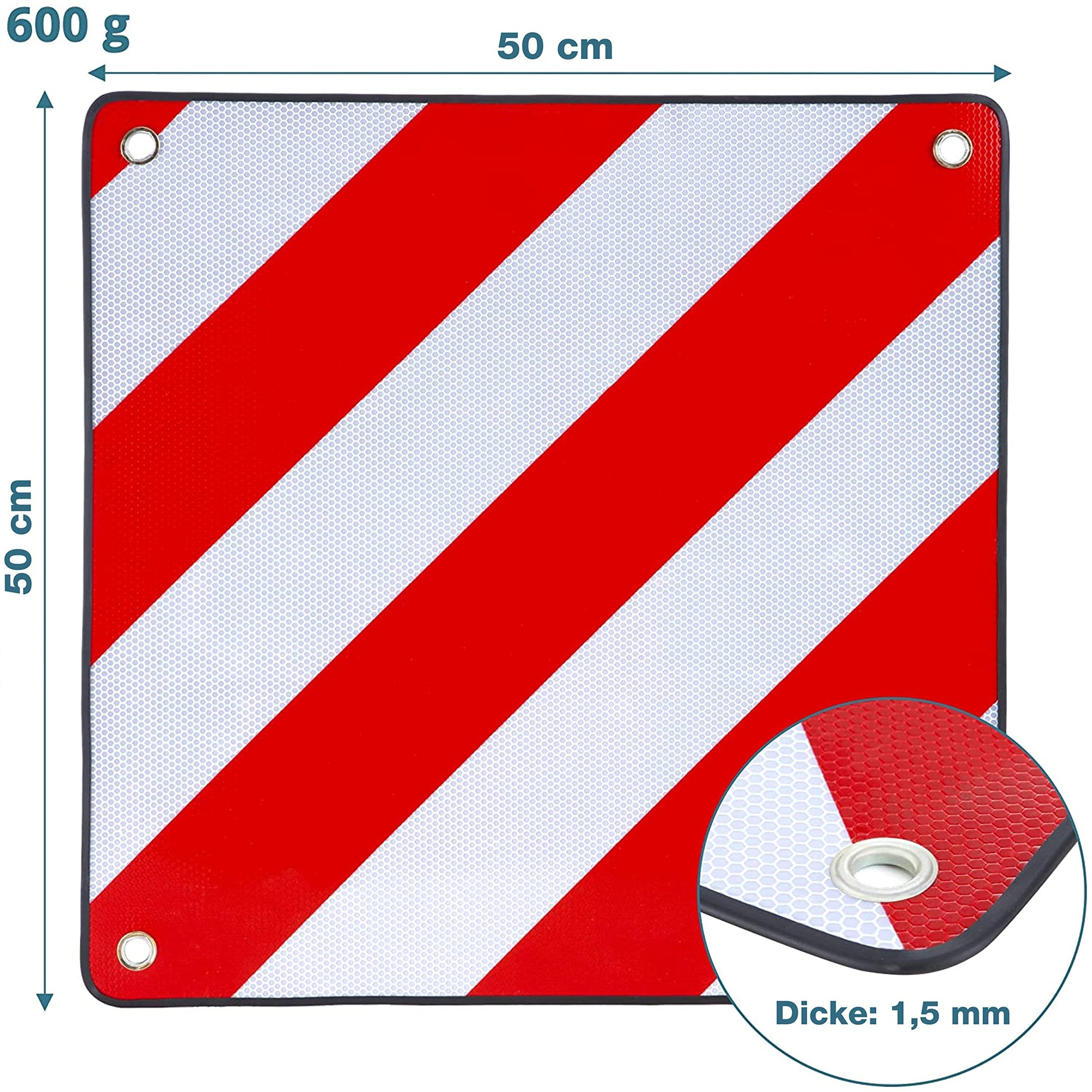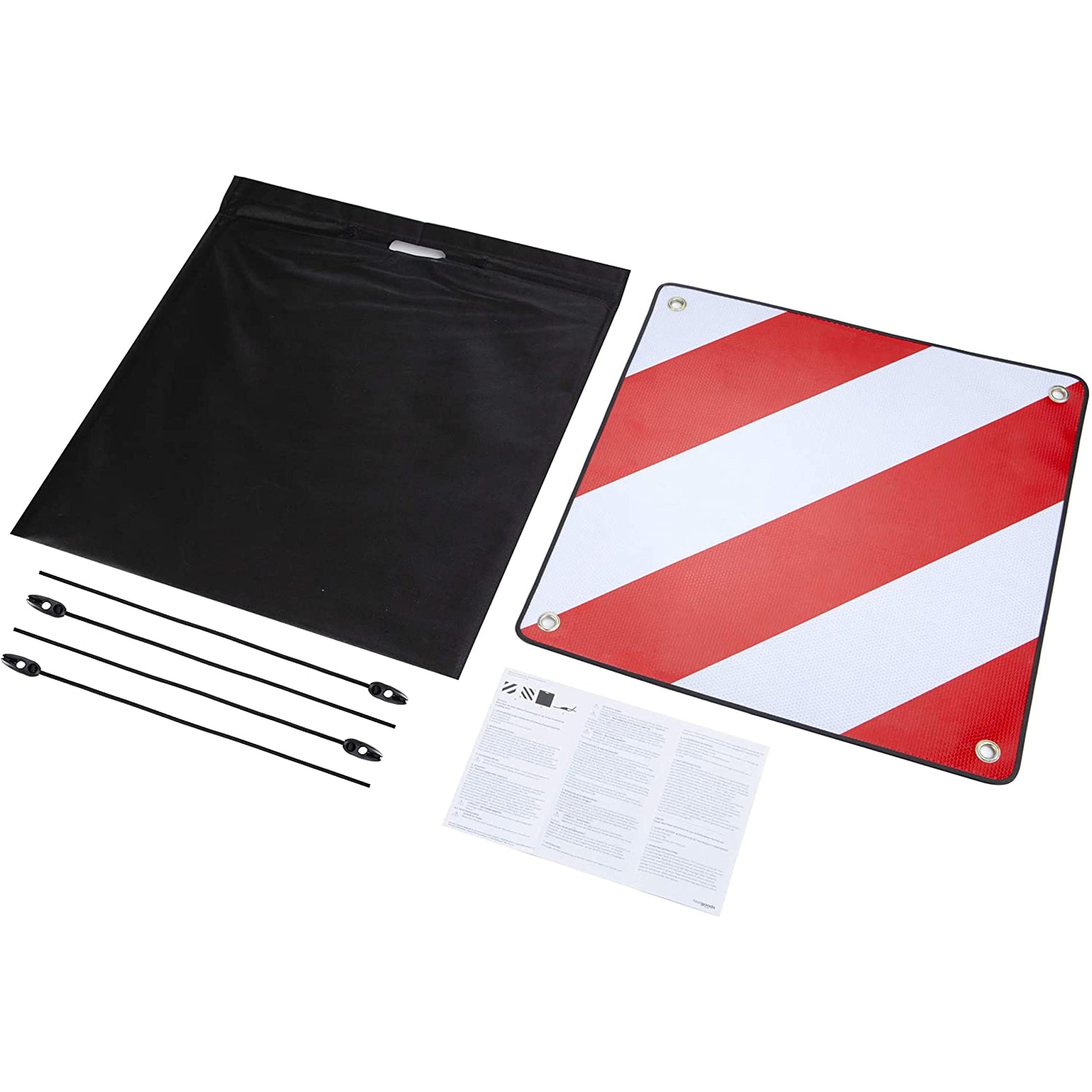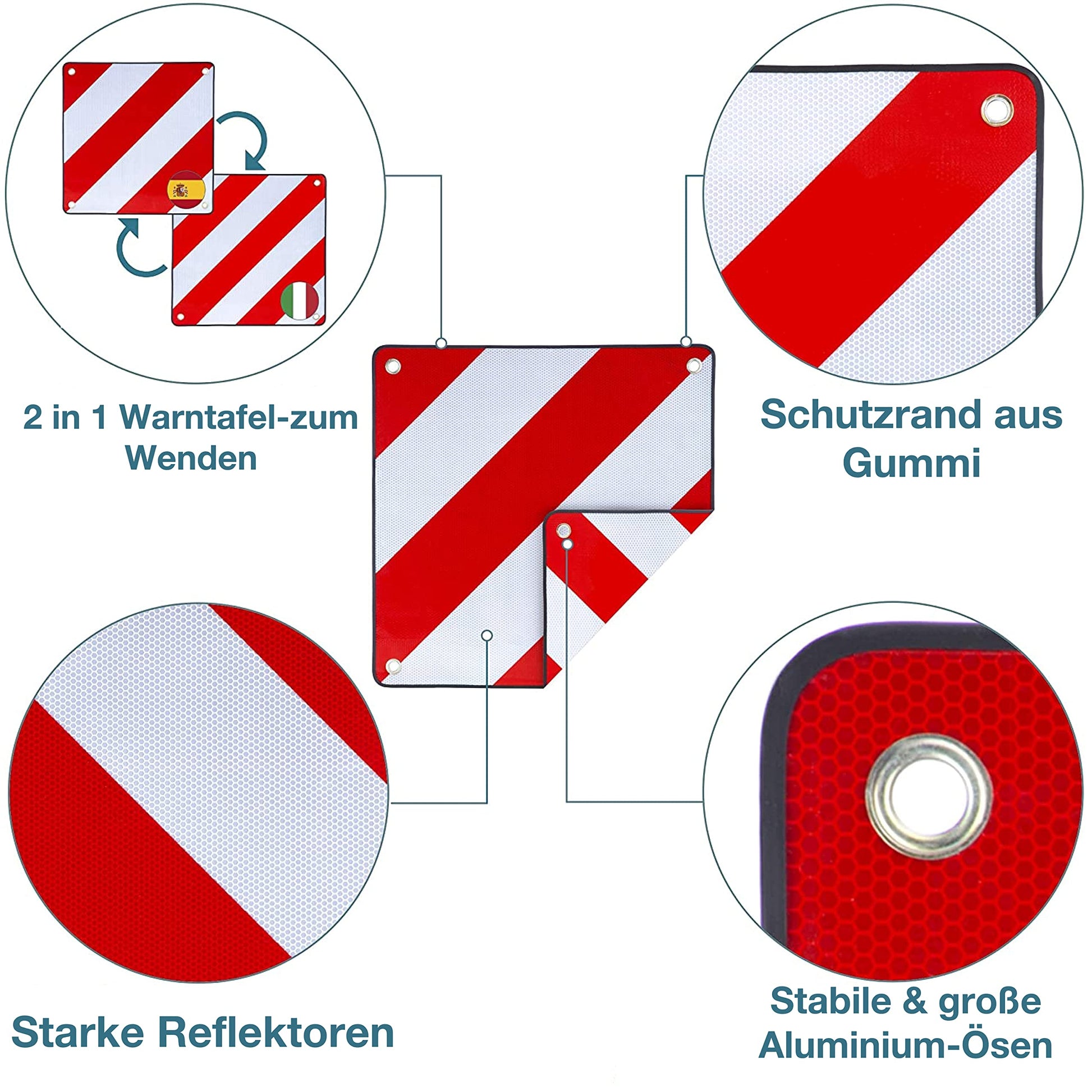 "2-in-1 Warning sign for Italy and Spain: This red and white warning sign is double-sided and complies with regulations. Ideal for bike racks, motorhomes, caravans, or luggage racks","Compliant Safety: The warning sign for bike racks in Italy and Spain meets all legal requirements. Perfect for motorhome accessories and safe towing","Robust aluminum construction: Made of 1.5mm thick aluminum, this warning sign is weatherproof and durable. A must-have for caravan accessories and safe driving in all conditions","Protection for vehicle and safety: The warning sign for motorhomes is equipped with a rubber protective edge to prevent injuries and paint damage. Includes a practical storage bag","Easy and Secure Attachment: The warning sign for bike racks comes with four rubber straps for quick installation. Perfect for motorhome gadgets and compliant travel in Europe"