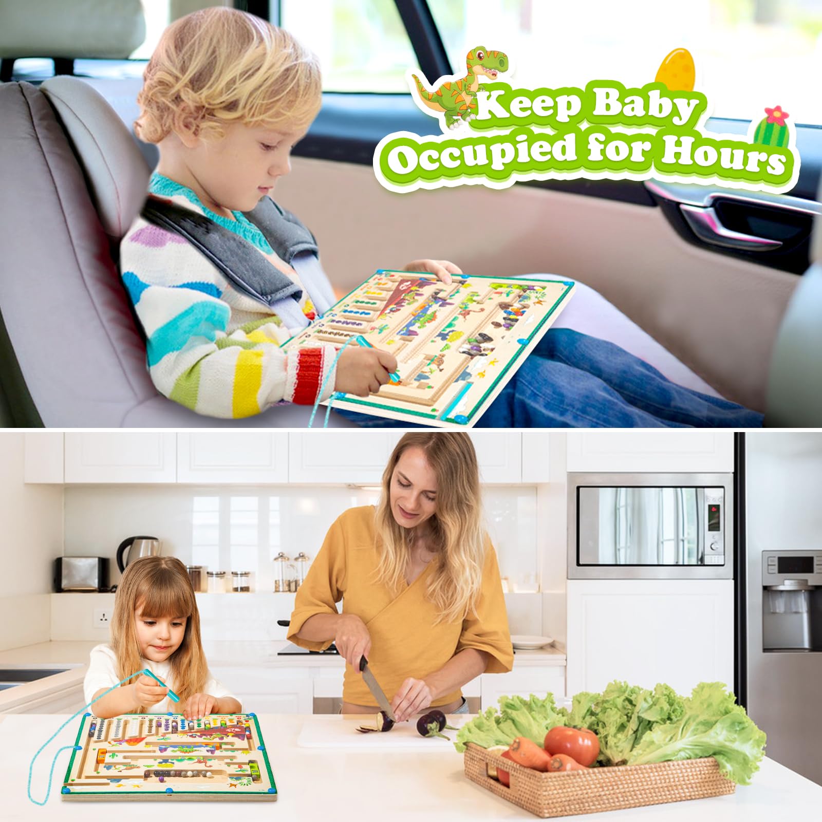 ["Learning game for toddlers: This magnetic toy offers two exciting game options: Basic level - the magnetic bead goes through the uninterrupted path; Advanced level - the bead overcomes the four obstacles on the way. The simple path is perfect for beginners, while the advanced path provides a greater challenge for older children.","Perfect fine motor skills toy: To achieve the game goal, the player must hold the pen correctly and think about how the balls move through the maze. An ideal sorting game for learning colors and numbers. Children's fine motor skills, hand-eye coordination, logic, and concentration are trained and promoted in an entertaining way.","Home & on-the-go games: With its bright colors and simple, yet entertaining game logic, this magnetic game provides lasting fun for little ones. Mom and Dad can cook, work, or relax while the kids are busy with the magnetic board. Perfect travel games for kids on long car rides or flights.","Safety: Made of high-quality wood and water-based paint, sturdy and durable. Smooth edges prevent scratches on hands. Transparent locking disc prevents choking hazards. The magnetism of the magnetic pen has been modified to ensure that it can accurately grip the beads. Size: 29.5x29.5cm","Ideal gift: An enthusiastic gift for girls and boys aged 3 to 6 for birthdays, Easter, Christmas, New Year, etc. Comes with 4 lovely stickers for DIY birthday or holiday wishes. Please feel free to contact us anytime if you have further questions."]
