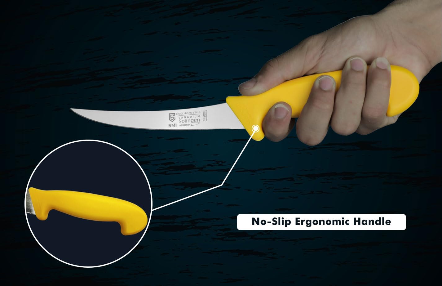 "✅ Ergonomic yellow handles: The boning knife set features handles made of durable yellow polypropylene, which are both comfortable to hold and non-slip. This provides a secure grip during cutting.",