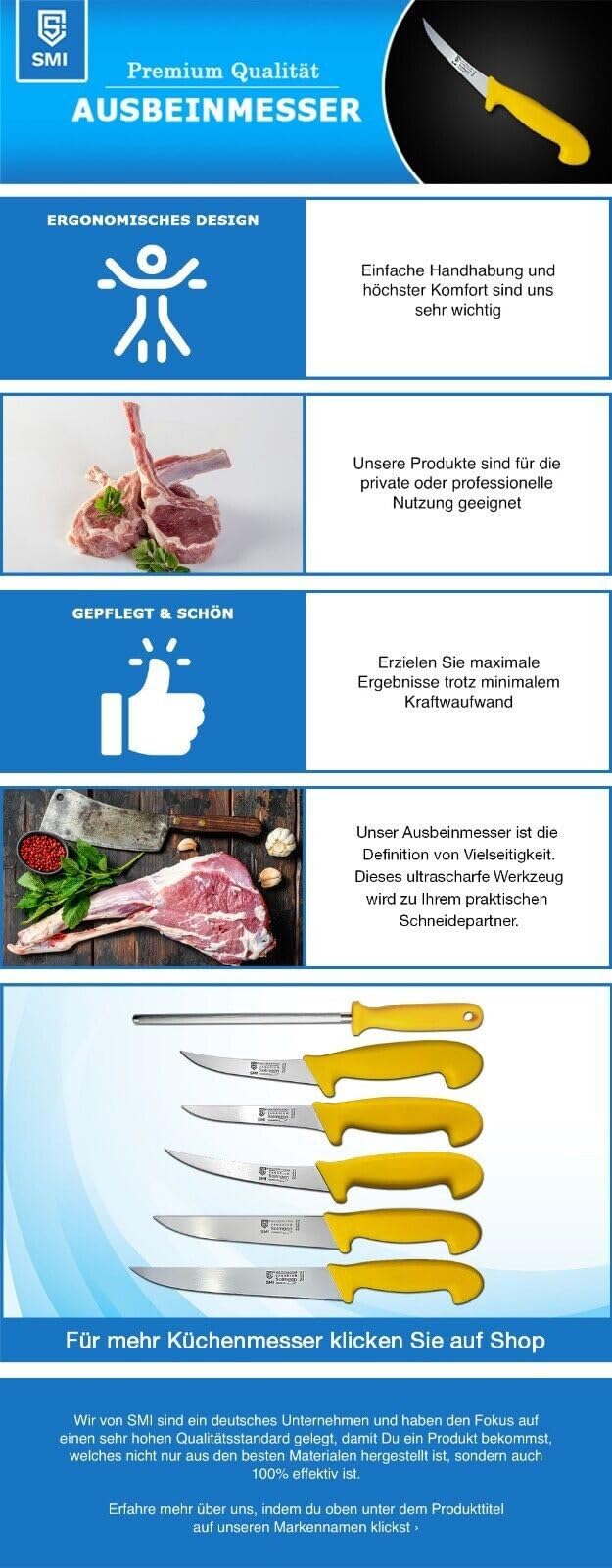 ["✅ High-quality SMI 6 Piece Kitchen Knife Set with Sharpening Steel / Boning Knife set: This comprehensive set from Solingen includes butcher knife, chef's knife, utility knife, and boning knife, along with a practical sharpening steel. Ideal for those who value quality and versatility in the kitchen.",