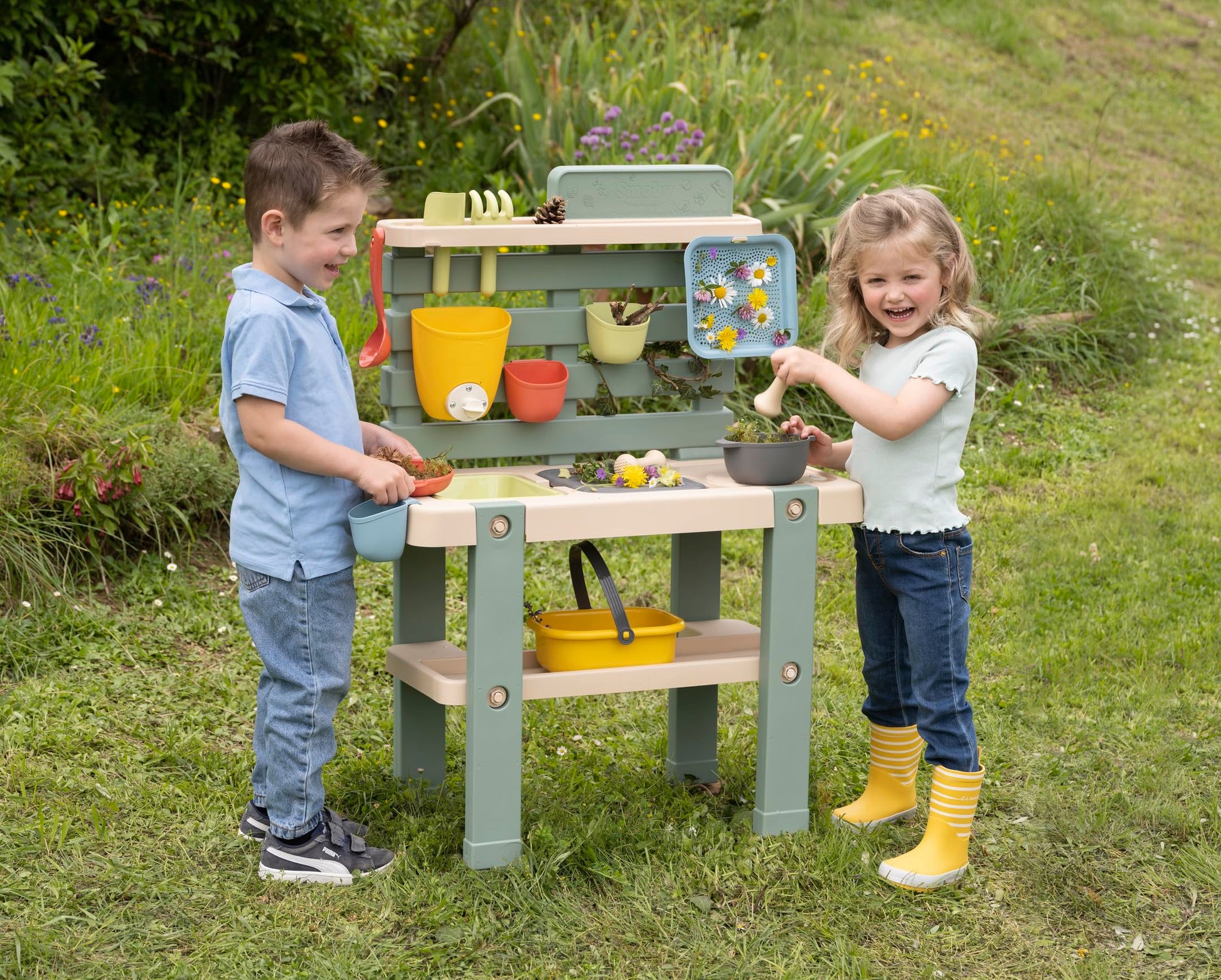 ["Mud Kitchen for Creative Play - Children aged 3 and up can create their own dishes and magical creations with sand, soil, flowers, and stones.","Plenty of accessories for realistic role-playing - With 11 accessories like pots, sieve, and spoon, children can cook, stir, sift, and prepare creative "nature dishes.","Durable and easy to clean - Made from recycled plastic, the outdoor kitchen is resistant to weather conditions and easy to clean.","Versatile play areas and storage space - Two large basins, a 1-liter water tank, removable containers, and an expandable work area offer various play options and organization.","Smoby since 1924 - Sustainable and innovative: Made from recycled and recyclable materials, the Smoby Life collection combines environmental awareness and quality - lovingly made in France."]