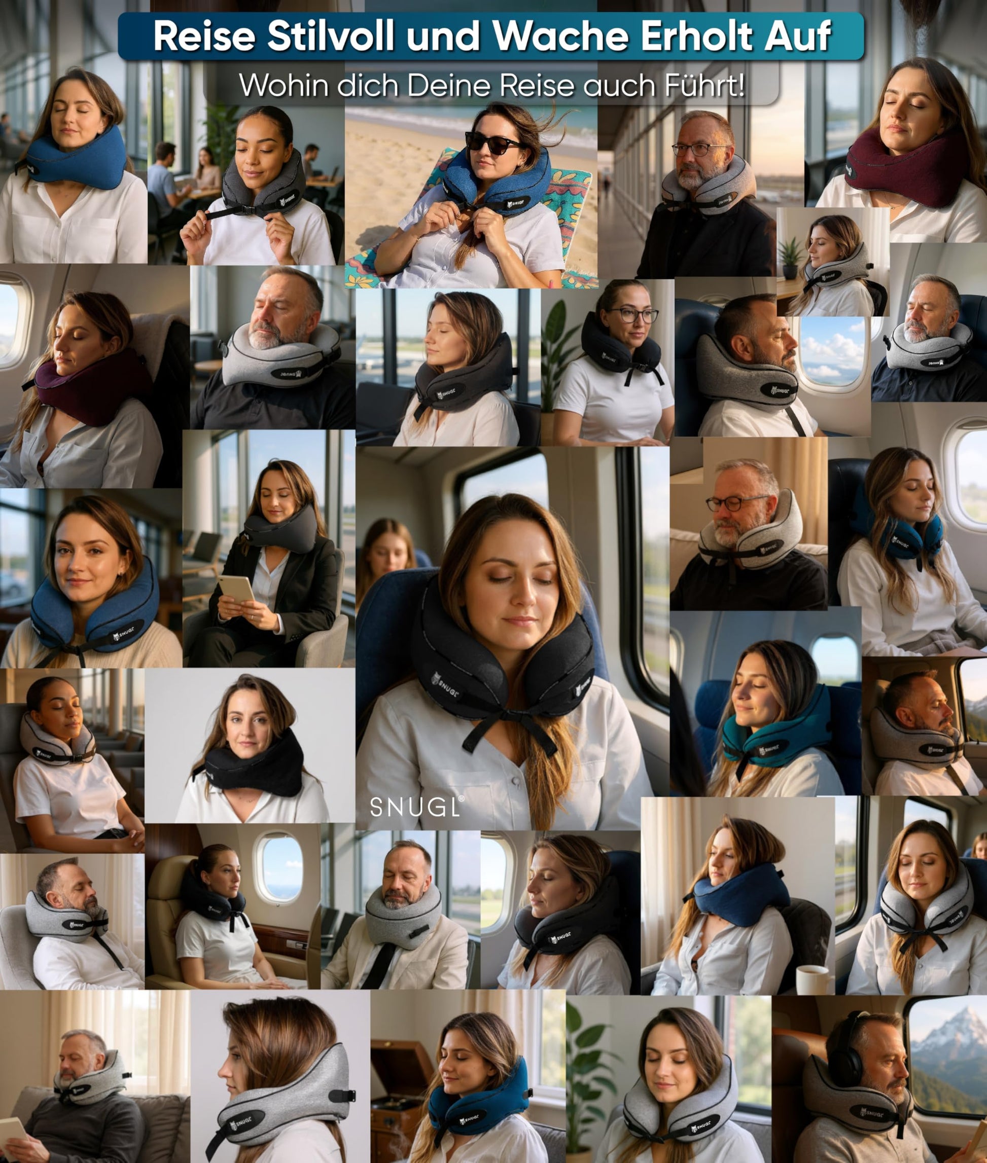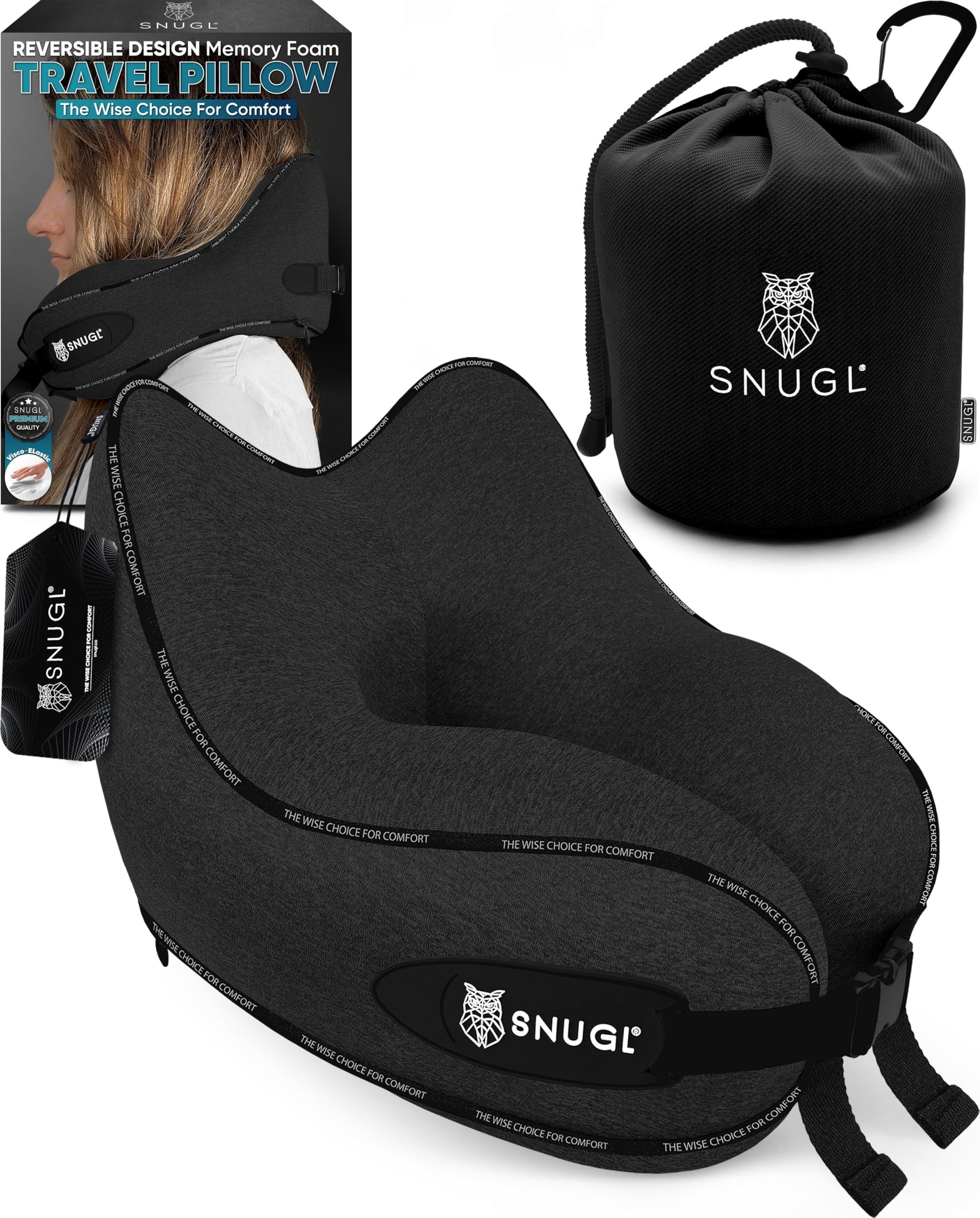 ["MAXIMUM COMFORT: Experience the next level of relaxation with our SNUGL travel neck pillow. The soft memory foam molds to your neck shape and individual sleep position. Ideal for long trips on planes, cars, or buses. Ensuring you arrive at your destination relaxed and pain-free.","BREATHABLE & WASHABLE: At SNUGL, we don't compromise on hygiene and comfort. The breathable and skin-friendly cover of our neck support pillow ensures optimal air circulation, prevents overheating, and is completely washable. Keeping your travel pillow always fresh.","INCLUDES HANDY BAG: The neck pillow can be compressed to 70% of its size and stored in the included bag. Easy to carry in luggage or simply attach with the included carabiner hooks. Nothing will stand in the way of your next adventures.","ADJUSTABLE FIT: You determine the comfort. The two adjustable straps provide a custom fit to your individual needs. Secure hold and unique comfort with our ergonomic travel neck pillow. Making travel time fly by.","60-DAY RETURN POLICY: At SNUGL, we promise quality and customer satisfaction. Test our unique travel pillow and see for yourself. If you're not 100% satisfied, we offer a 60-day refund. We love traveling and want you to continue doing so!"]