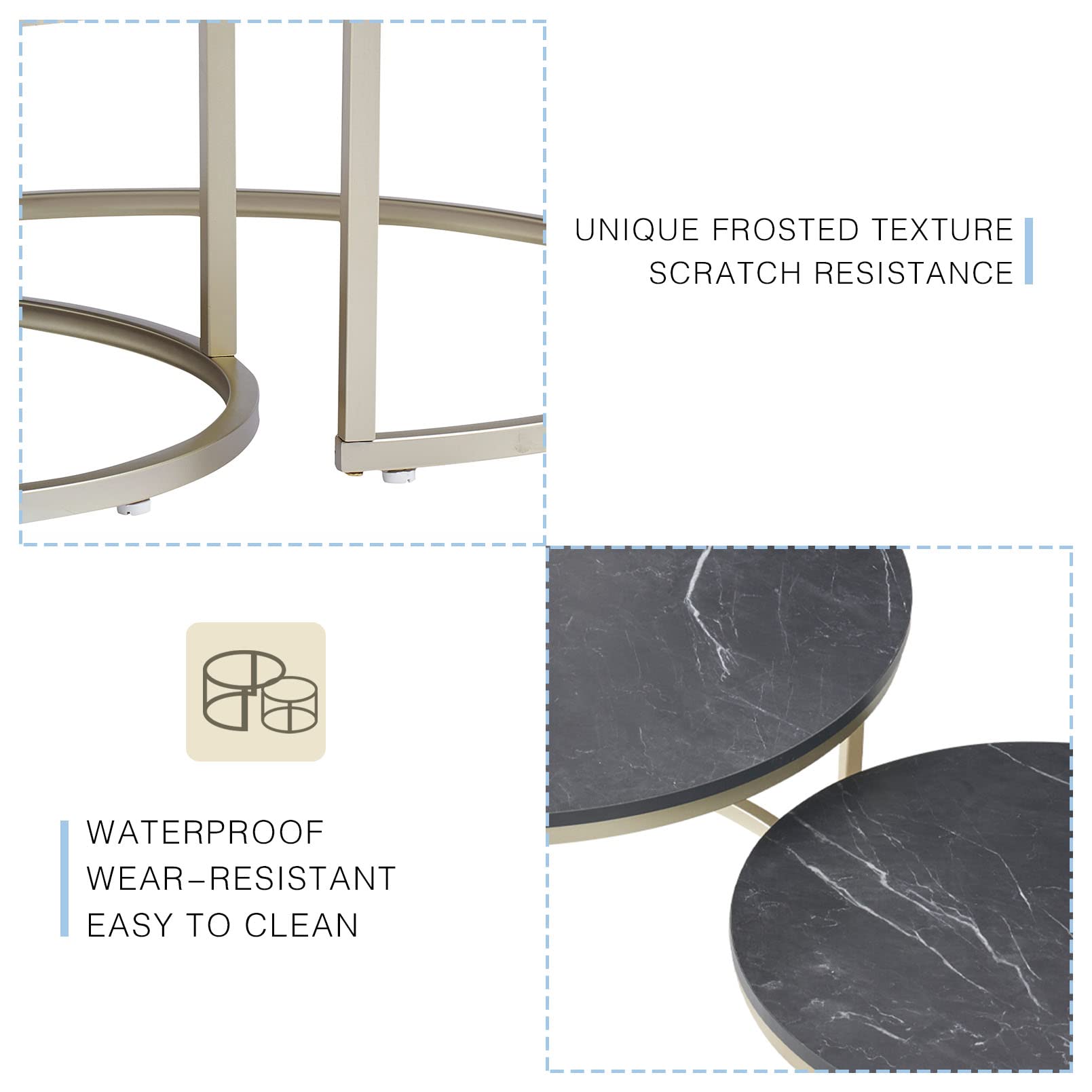 4. High-Quality Material: We have selected a waterproof MDF imitation marble tabletop for our coffee table, which is lightweight yet durable. The steel metal frame is stable and sturdy, no shaking. The non-slip foot pads prevent the coffee table from scratching the floor.