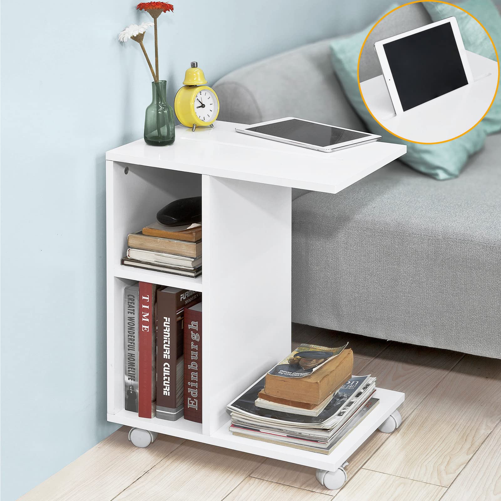 SoBuy C-shaped sofa side table with 2 storage shelves & tablet holder, modern coffee table on wheels for living room, White FBT48-W