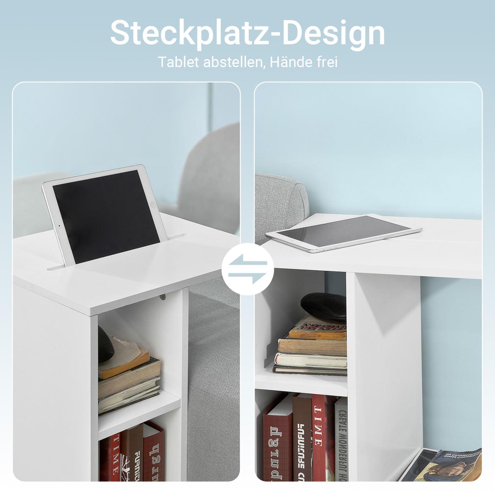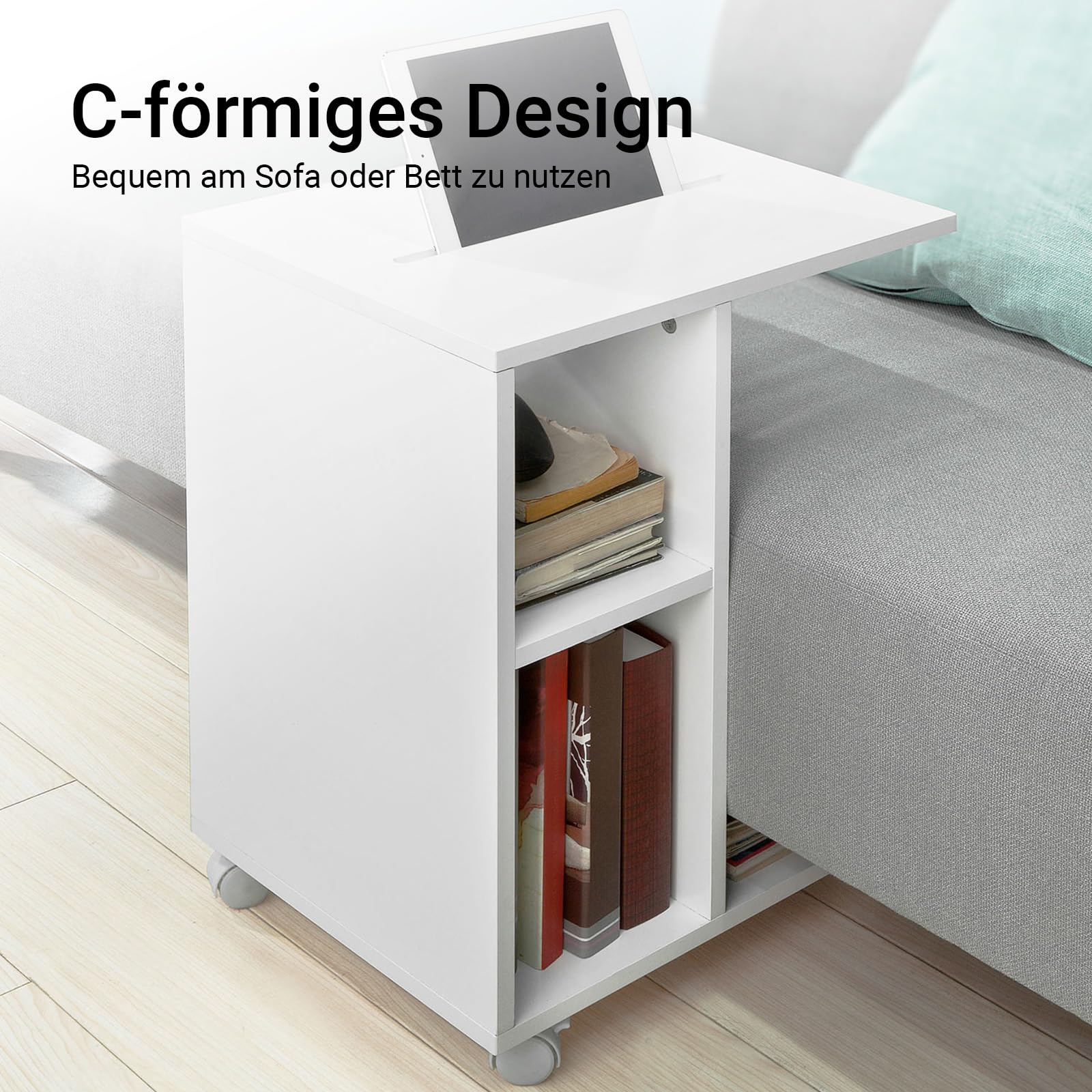 ["C Shape Design] The creative 'C' design allows the open end to be inserted into furniture, expanding the surface area or providing additional storage space. Ideal as a side table for any home or office.","Spacious Storage] With two open compartments, this side table offers plenty of space for books, magazines, papers, remote controls, and more, keeping everything easily accessible.","Practical Tablet Holder] The tabletop features a built-in groove to securely hold your tablet or mobile phone, providing added convenience for daily use.","Sturdy & Stylish Construction] Made of high-quality MDF with a smooth white finish, this table combines durability with a sleek, modern look and is a versatile addition to your living room, bedroom, or office.","Easy Mobility & Assembly] Equipped with four wheels (two with brakes), this table is easy to move and position. Delivered flat-packed with detailed instructions for quick assembly." ]