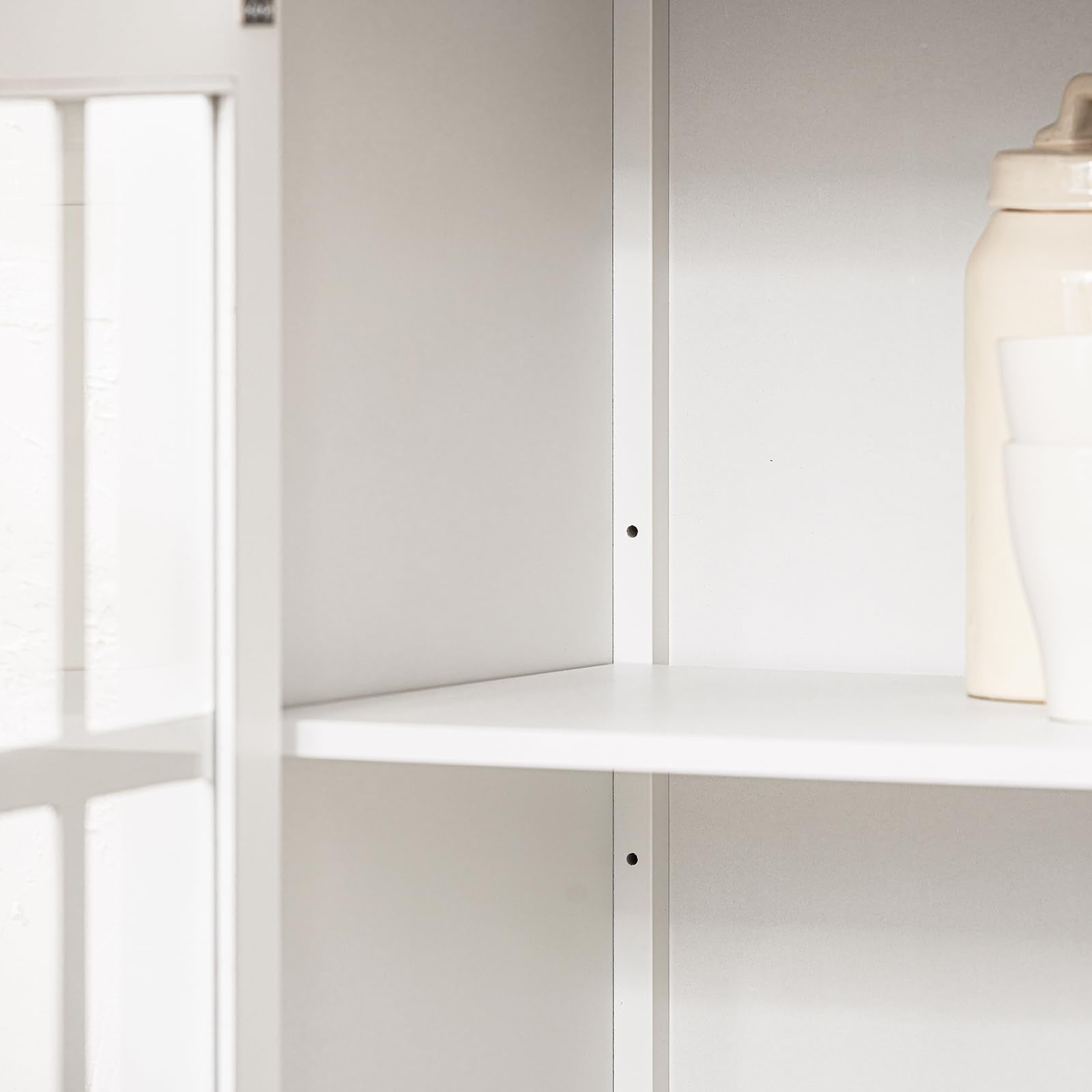 Plenty of storage space with a drawer in the upper area, 1 adjustable height (2-level) shelf behind the door