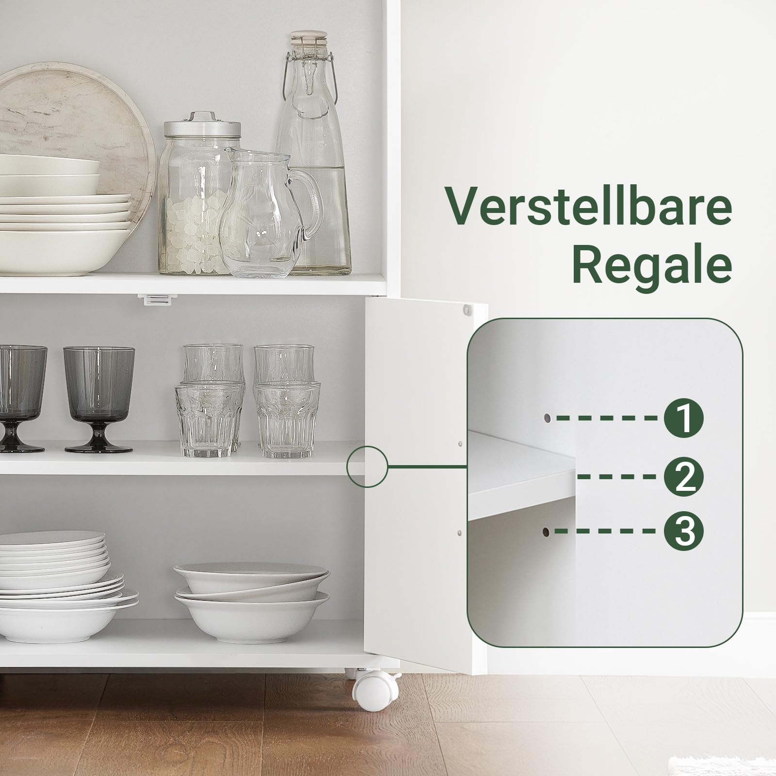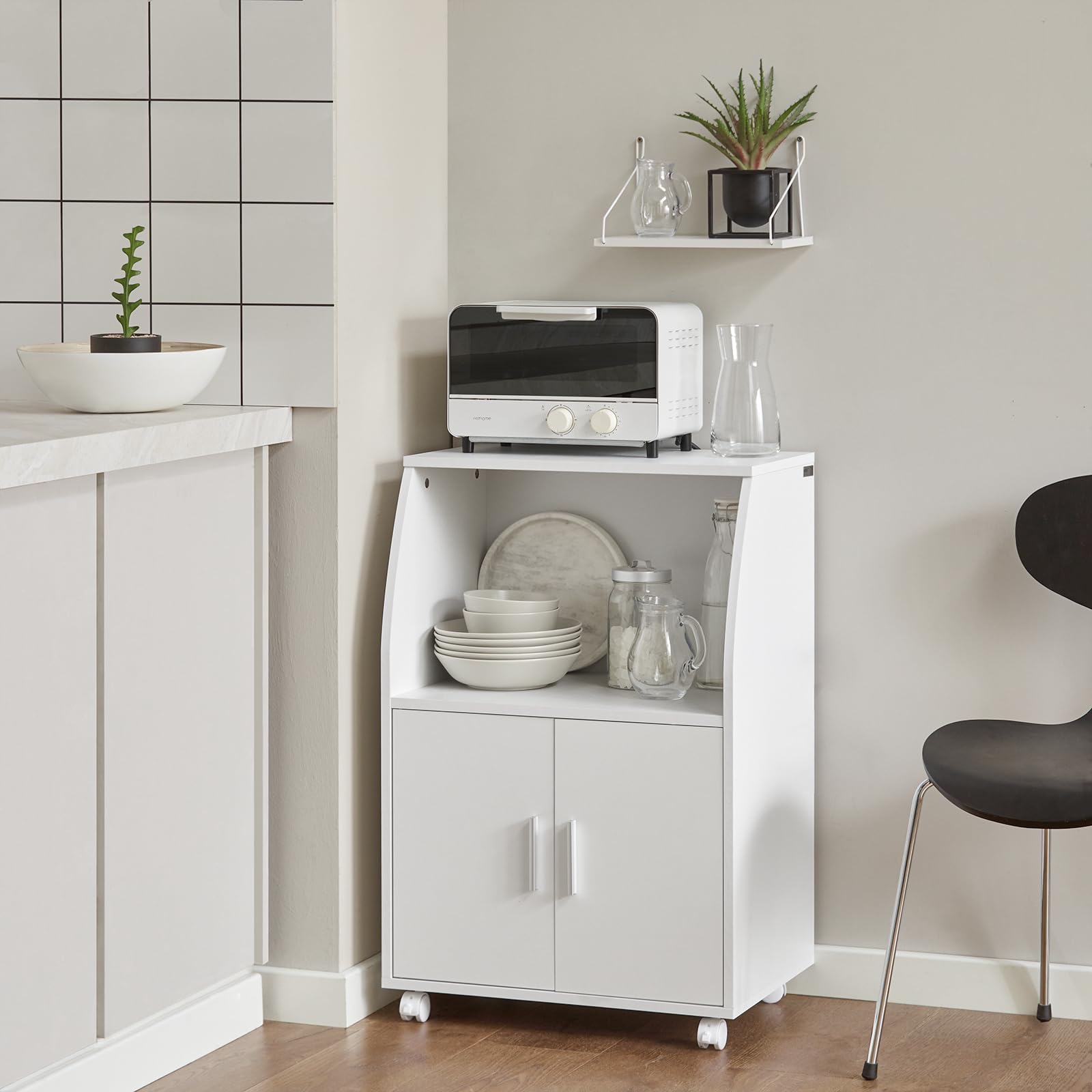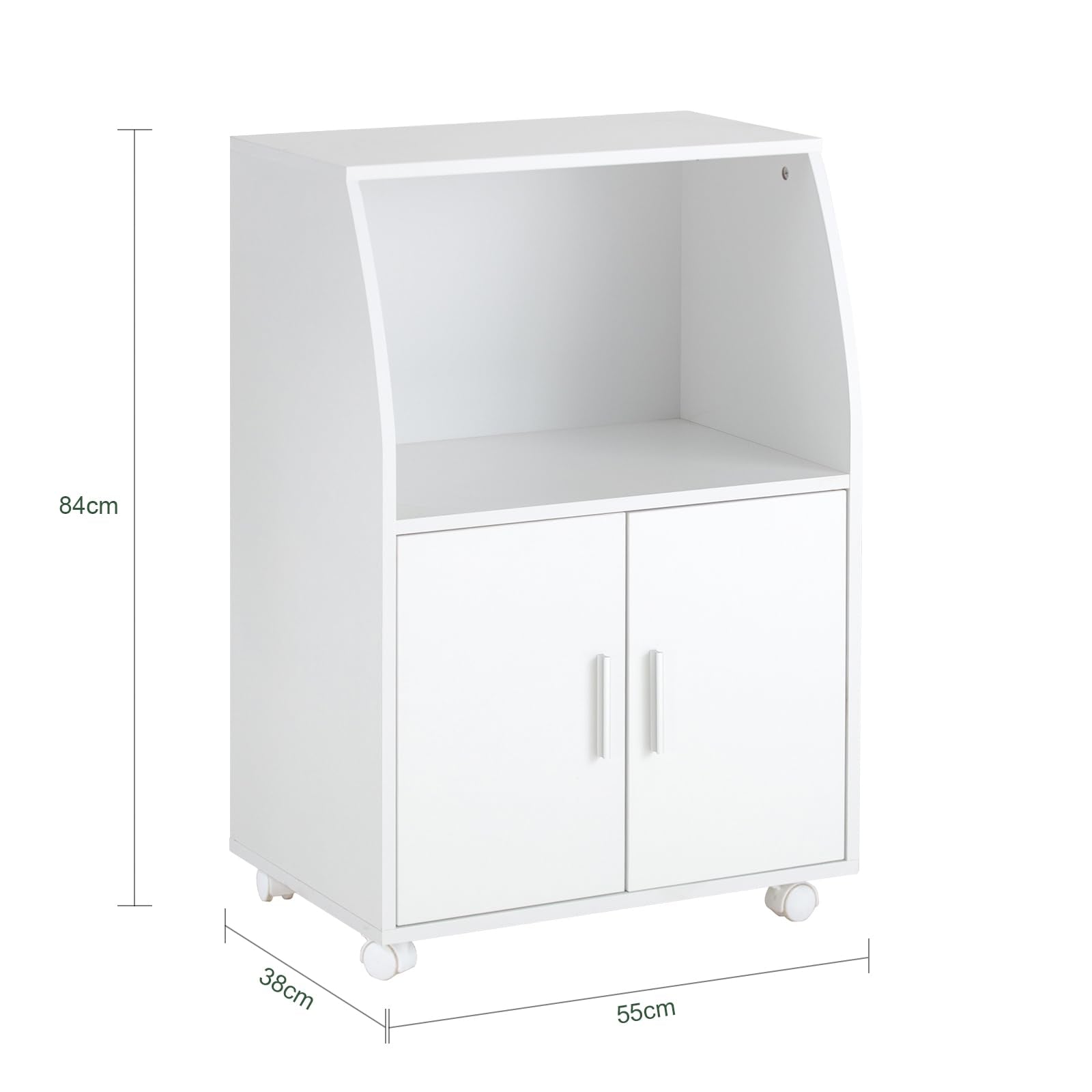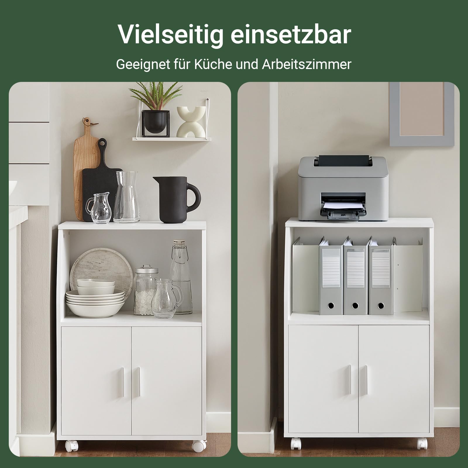 ["COMPACT SIZE FOR MAXIMUM EFFICIENCY]: With its space-saving dimensions of 36x23x16 inches, this rolling kitchen cart fits perfectly in small spaces yet provides generous storage space for kitchen tools, supplies, or printers","[HEIGHT-ADJUSTABLE SHELVES]: Behind the double doors, there is a flexible shelf that can be adjusted individually - ideal for storing tall bottles, large pots, or files","[MOBILE & STABLE]: Equipped with 4 smooth-rolling wheels, 2 of which are lockable, the serving cart can be easily moved and securely positioned - perfect for flexible use in the kitchen, office, or living space","[VERSATILE USE]: Whether as a microwave stand, printer table, coffee station, or additional storage space for a home office, this cart effortlessly adapts to various requirements and living styles","[MODERN, SIMPLE DESIGN]: The white finish and clean lines blend discreetly into any environment - a stylish organizer that combines functionality with aesthetics"]