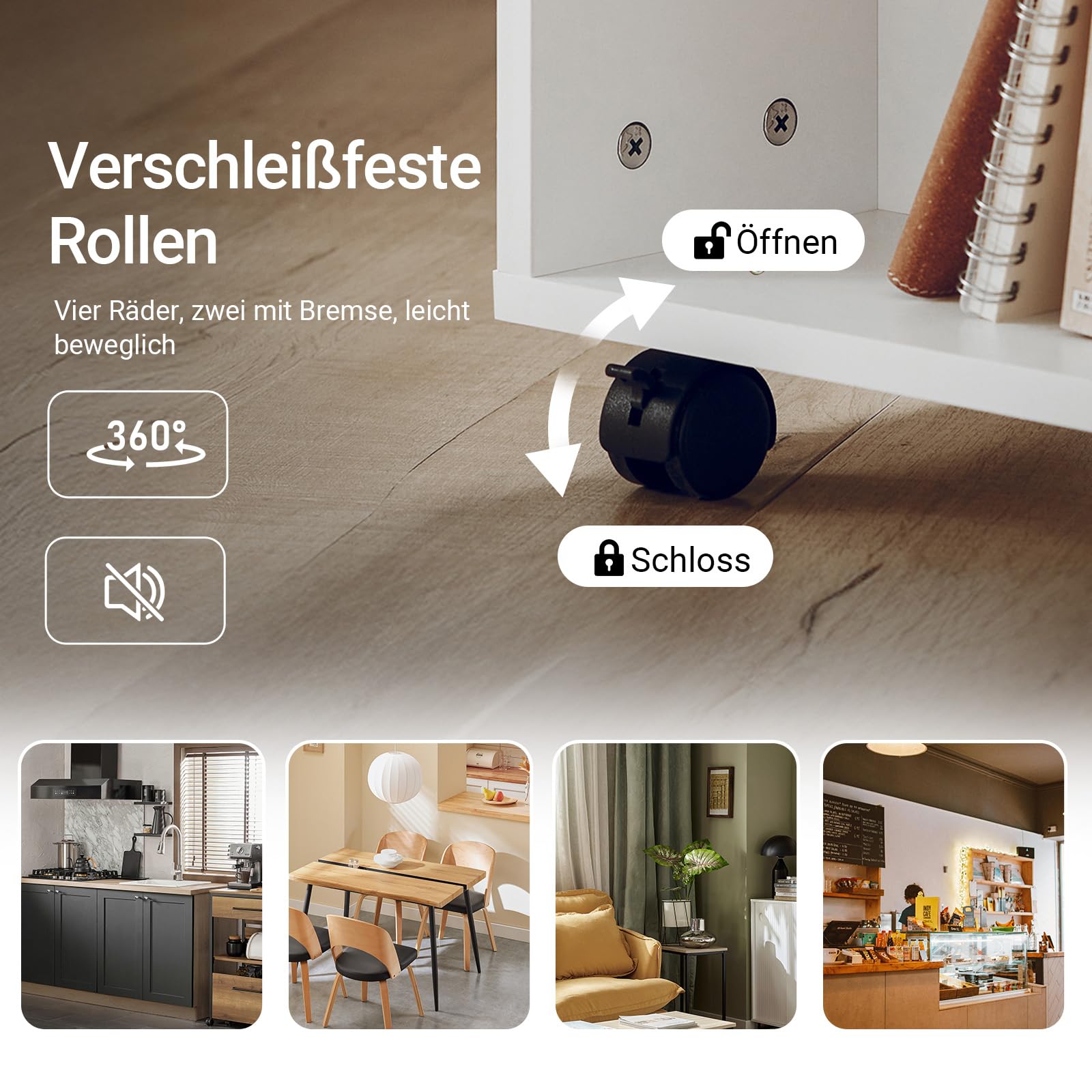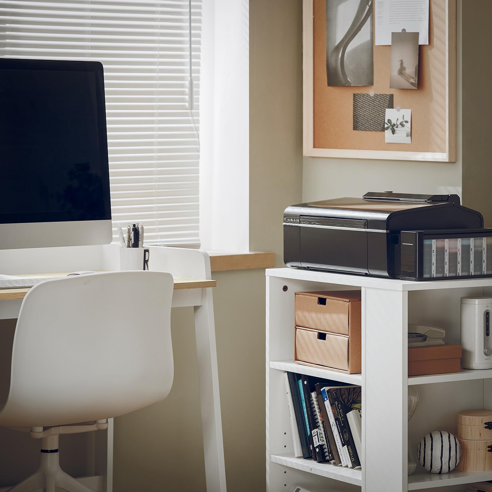["[Modern design & compact size] In elegant white, this cabinet measuring 60x75x35 cm fits perfectly under any desk. Its simple and modern design harmonizes with any decor, whether in the office or at home. Package dimensions 78x48x18 cm","[Maximum load capacity & stability] Our printer stand with wheels is made of sturdy chipboard with melamine coating and can hold up to 132 lbs. Ideal for heavy printers and other equipment, stable and durable even with daily use","[Versatile & flexible storage compartments] With 7 open compartments, including an adjustable shelf, the rolling cabinet offers plenty of space for paper, files, office supplies, and decorations. Perfect as a desk cabinet or shelf","[Easy to move & securely fixable] Thanks to the 4 smooth-rolling wheels, including 2 with brakes, the printer cabinet can be easily moved and securely fixed in place. Convenient for the office, home office, or living room","[Simple assembly & easy maintenance] The printer stand is delivered disassembled with clear instructions. Quick assembly and easy-to-clean surface make it the ideal rolling cabinet for efficient work"]