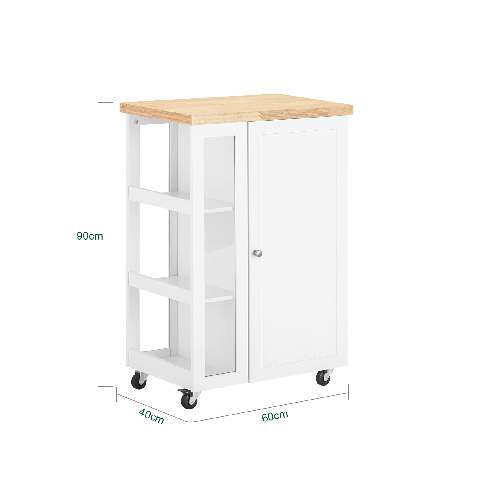 The kitchen cart has four sturdy rubber wheels (2 of which are lockable), making it easy to move on any surface."
