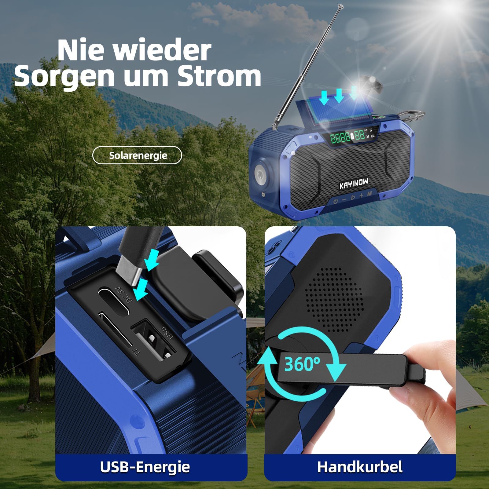 Solar crank radio with Bluetooth speaker, phone charging function, and bike mount. IPX5 waterproof and portable. Emergency AM/FM radio with 5000mAh battery. Perfect for camping and outdoor activities with built-in flashlight and SOS feature.
