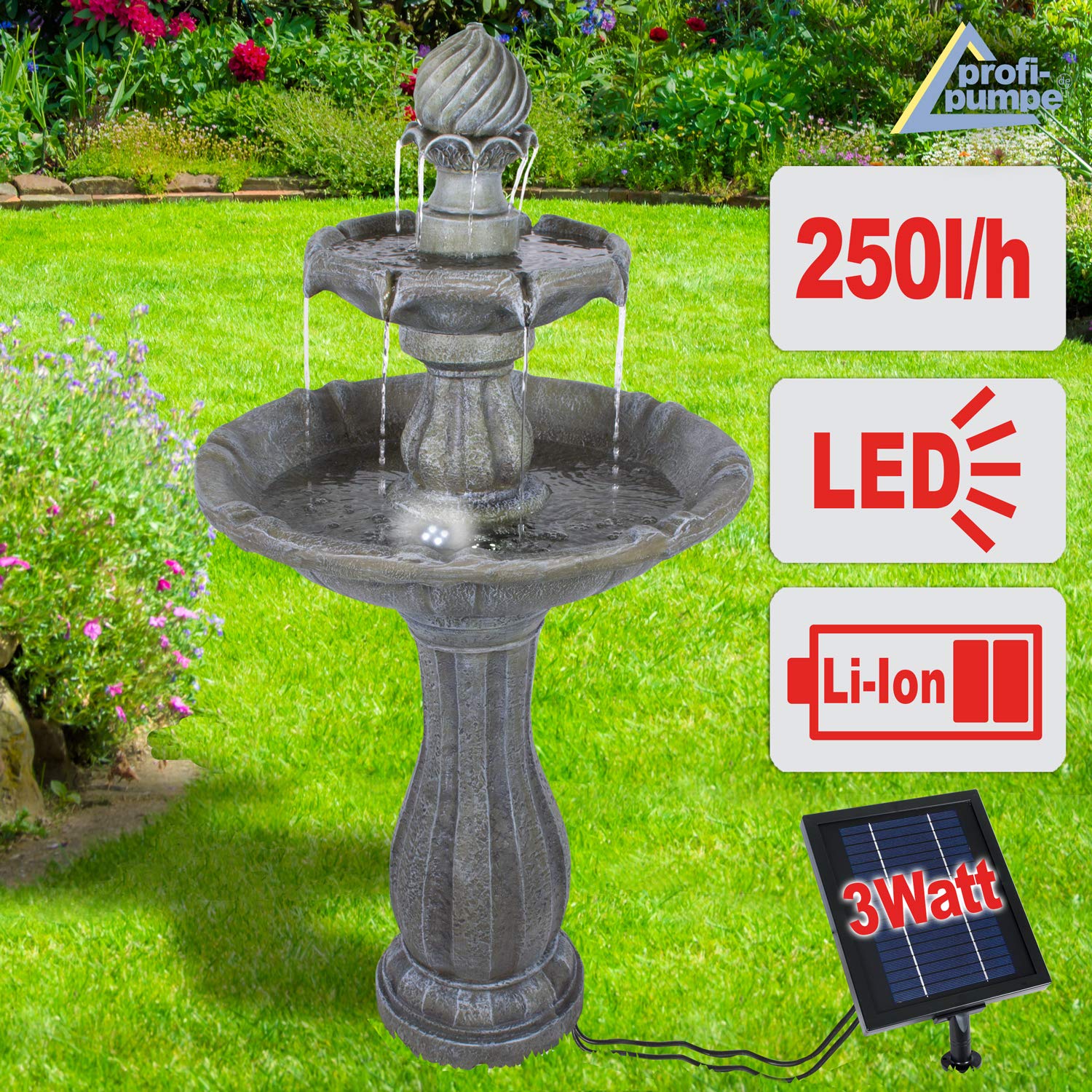 ["High-quality, solar-powered outdoor pump system - with LED lighting and reliable battery. The perfect eye-catcher in the garden! Day and night operation!", "Solar panel for best function freely positionable and easy to optimize | high-quality solar panel in stable break-resistant FRAME with a power of 3 watts. Solar-powered garden fountains can be positioned independently of the 230V socket at almost any location in the garden. Annoying cable pulling is eliminated. Trip hazards are avoided. No 230V cables in the garden - fewer hazards.", "Incl. submersible pump with INTEGRATED FILTER (protects the pump, easy to clean)", "Day and night operation through solar and battery operation / Incl. pump / LED ring", "Great eye-catcher! Plug-and-play solar pump system - ready for immediate use! The soothing sound of water in your own garden, on the balcony, or on the terrace creates a pleasant microclimate and, of course, a great atmosphere and relaxation from everyday life.", "Note: Frost can cause damage to the garden fountain and pump. In case of frost danger, the garden fountain and pump must be emptied, flushed with clear water, and stored dry. Then you will enjoy it for a long time!", "You can find the matching solar set in our shop category: Fountains & Cascades with ASIN: B0D87FCP5H"]