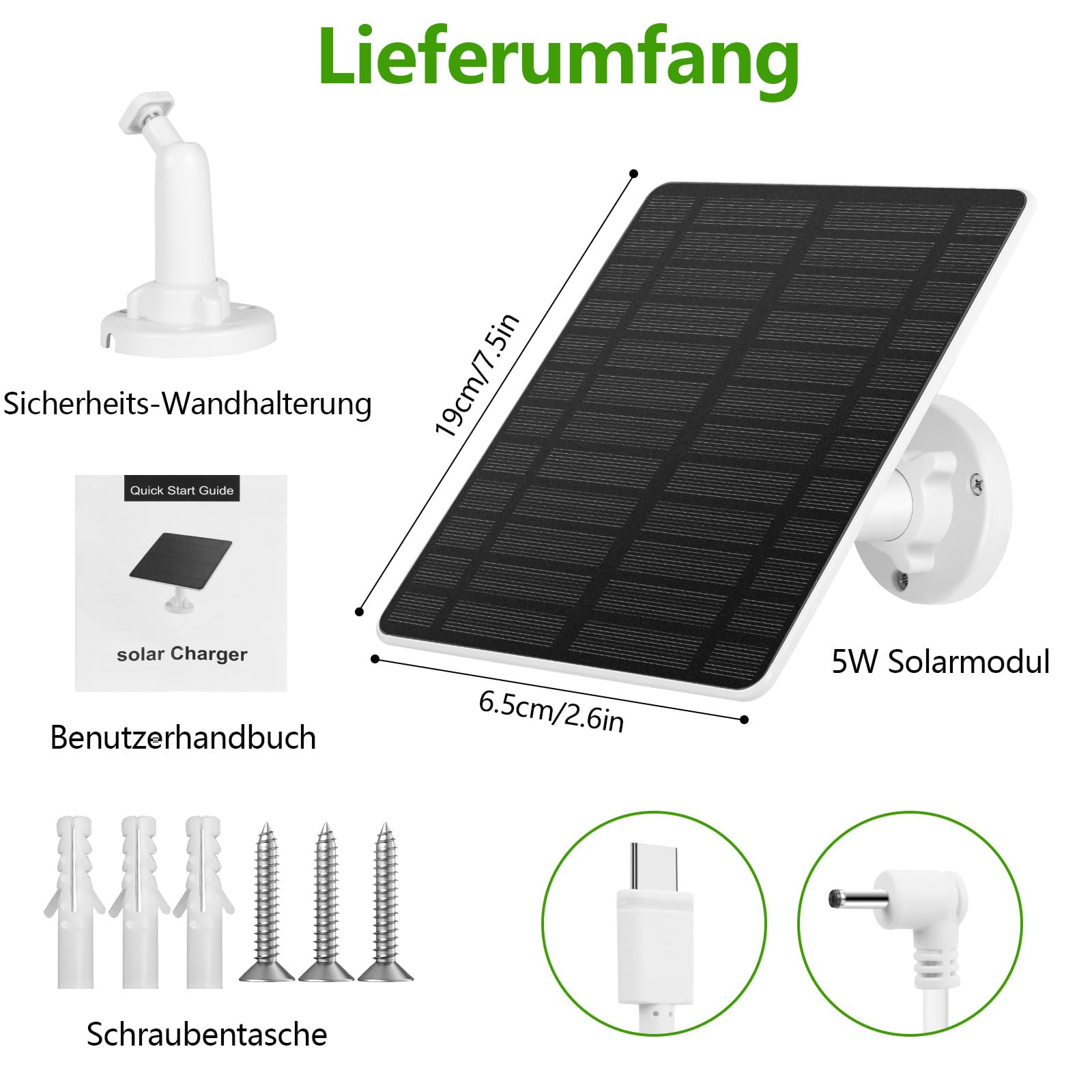 ["【Compatibility】 The GuKKK Solar Panel for Ring Camera is compatible with the Ring Stick Up Cam Battery and the Spotlight Cam Battery. A hollow plug-to-USB-C adapter is included, and the solar panel is also compatible with the Spotlight Cam Plus (USB-C port) and Spotlight Cam Pro (USB-C port). The solar panel is not suitable for Ring cameras without built-in batteries.","【Efficient Charging】 The spotlight camera's solar panel is made of monocrystalline silicon and has a charging efficiency of up to 20%, so you don't have to worry about the solar panel not working in inadequate light. Simply expose it to sunlight for a few hours to fully charge the Ring camera's battery quickly. By preventing overcharging, overheating, overvoltage, and short-circuiting, your device is fully protected during the charging process.","【Easy Installation】 You can install the 5W solar panel outdoors anywhere. Simply drill a hole in the wall, install the 360° adjustable wall mount, position the solar panel in direct sunlight, and then connect the 4-meter long charging cable to the 3.5mm DC charging port of the Ring camera battery. This allows you to choose the best angle and receive enough sunlight without constantly recharging the battery of your Ring camera.","【IP65 Waterproof】 With IP65 water and dust protection, it can continue to charge even in rain, snow, and at night. It can withstand bad weather, is easy to clean, durable, and suitable for outdoor use. The operating temperature range is -20°C to 50°C.","【Package Contents】: 2 * Solar Panel, 2 * Adjustable Wall Mount, 2 * Hollow Plug to USB-C Adapter, 6 * Screws, 2 * User Manual."]
