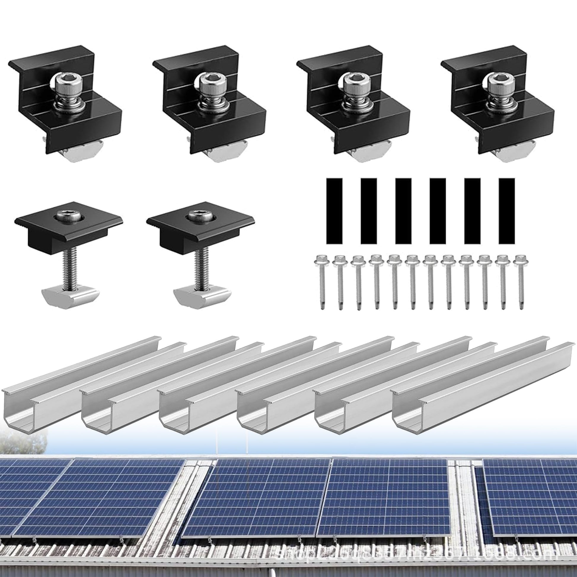 Complete PV module mounting set: Includes 6 x 120 cm mounting rails (silver), 4 x end clamps, 2 x middle clamps, 12 x stainless steel screws, 6 x rubber strips - for a stable and secure installation."