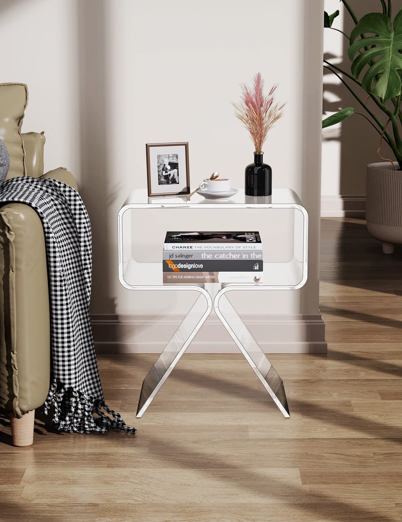 ["Small table: small, compact, shorter than the traditional table with edge in the picture. Please check the size before buying 39 x 30 x 45 cm", "Applicable scene: bedside table, magazine table, coffee table, temporary table, etc. Potted plants, candles, picture frames, magazines, and more look stylish and organized on this coffee table", "Modern design: The one-piece design of the high-quality acrylic plate, light transmittance exceeds 92%, making the space more fashionable. This beautiful table is the ideal decoration", "Stable and practical: The triangular support of the table legs, the tabletop is flat and wide, and you don't have to worry about shaking or falling off. A minimalist design that blends perfectly with any decor", "No need to assemble: It can be used directly without complications and seamless corners are easier to clean"]