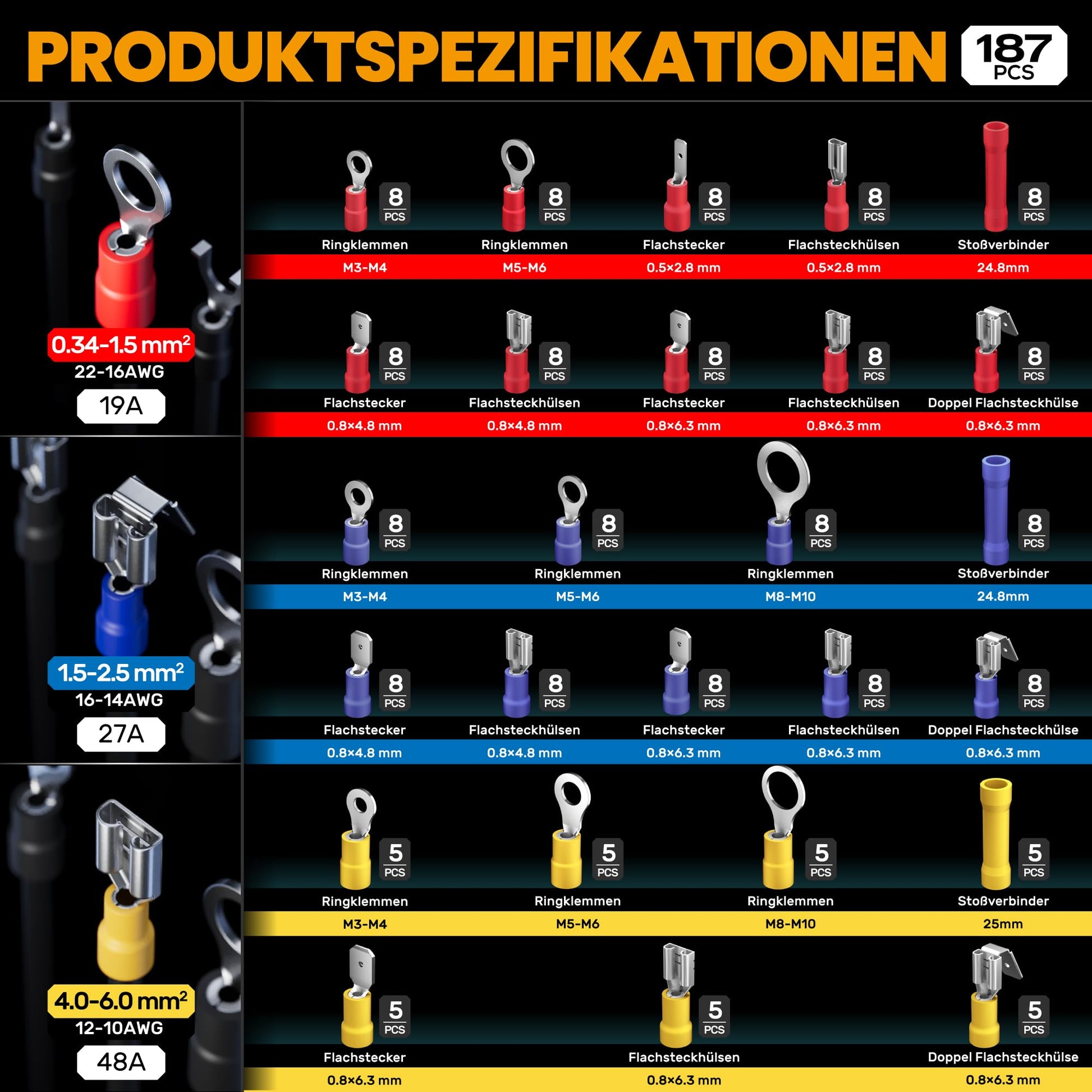 ["Crimping tools: Crimping pliers feature an efficient ratcheting mechanism and highly precise crimping jaws. Has adjustable crimping force and quick release function. Crimping range 26-10 AWG", "Ergonomic handle: The crimping tool has an ergonomic handle design that provides a comfortable grip, facilitates operation, reduces work intensity, and is suitable for long-term use", "26 sizes: 187 pieces of insulated cable shoes for 26-10 AWG cable. Including ring terminals; female spade terminals; branch female spade terminals", "Material: Cable shoes are made of tinned copper and a PVC insulation sleeve, ensuring excellent conductivity and high corrosion resistance. The PVC jacket has insulating and flame-retardant properties", "Portable kit: Specially designed double-layer portable storage box for easy transport and organization, ensuring that the tools remain neat and easily accessible, ideal for professional technicians and DIY enthusiasts"]