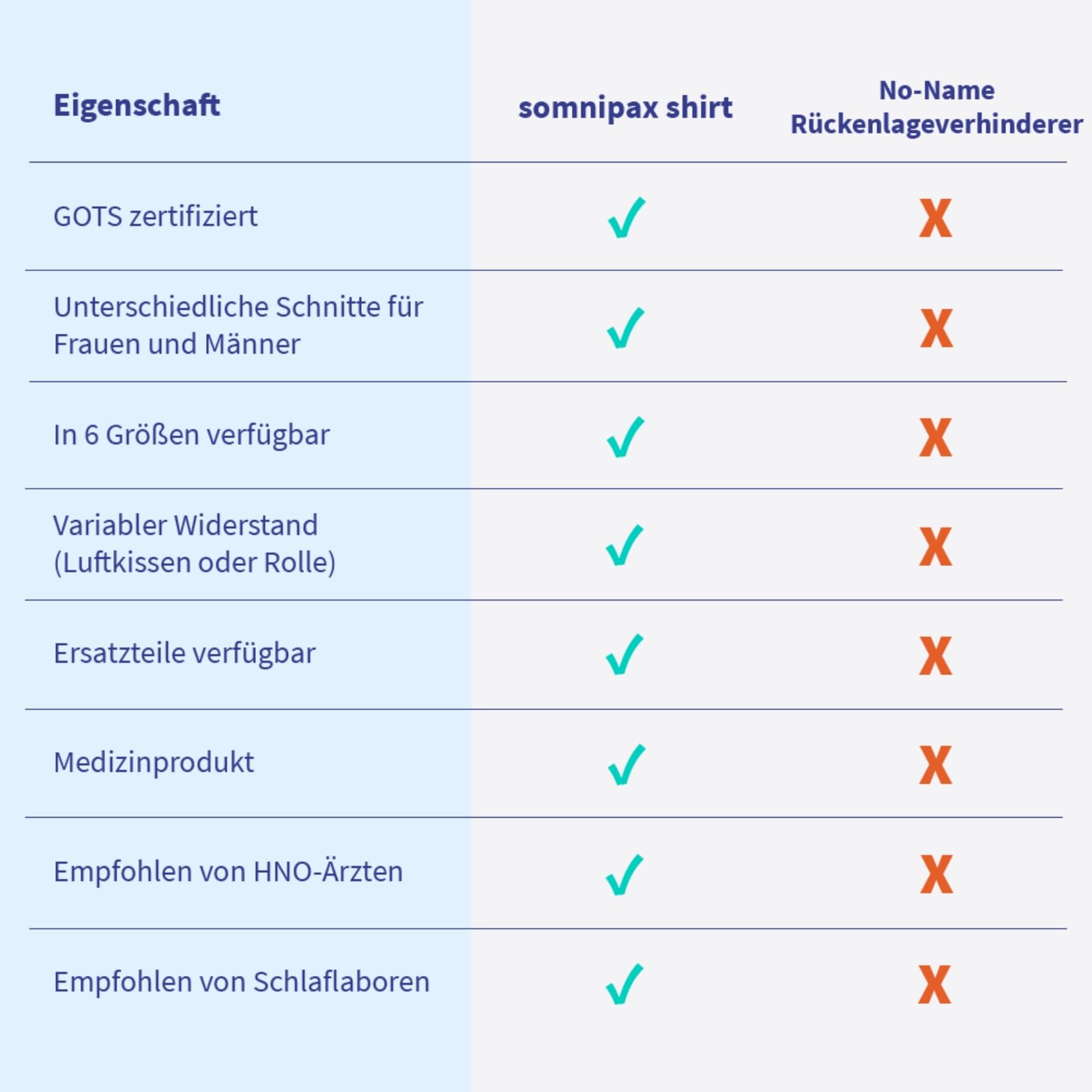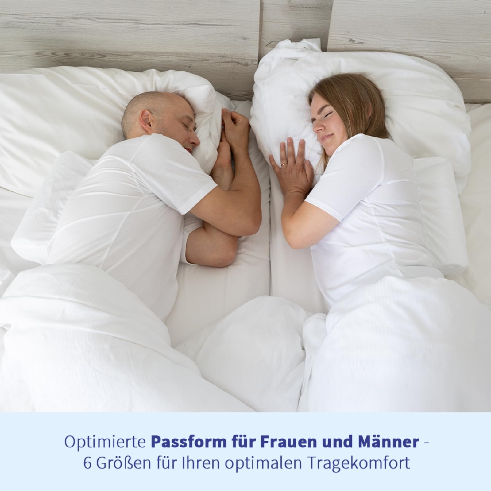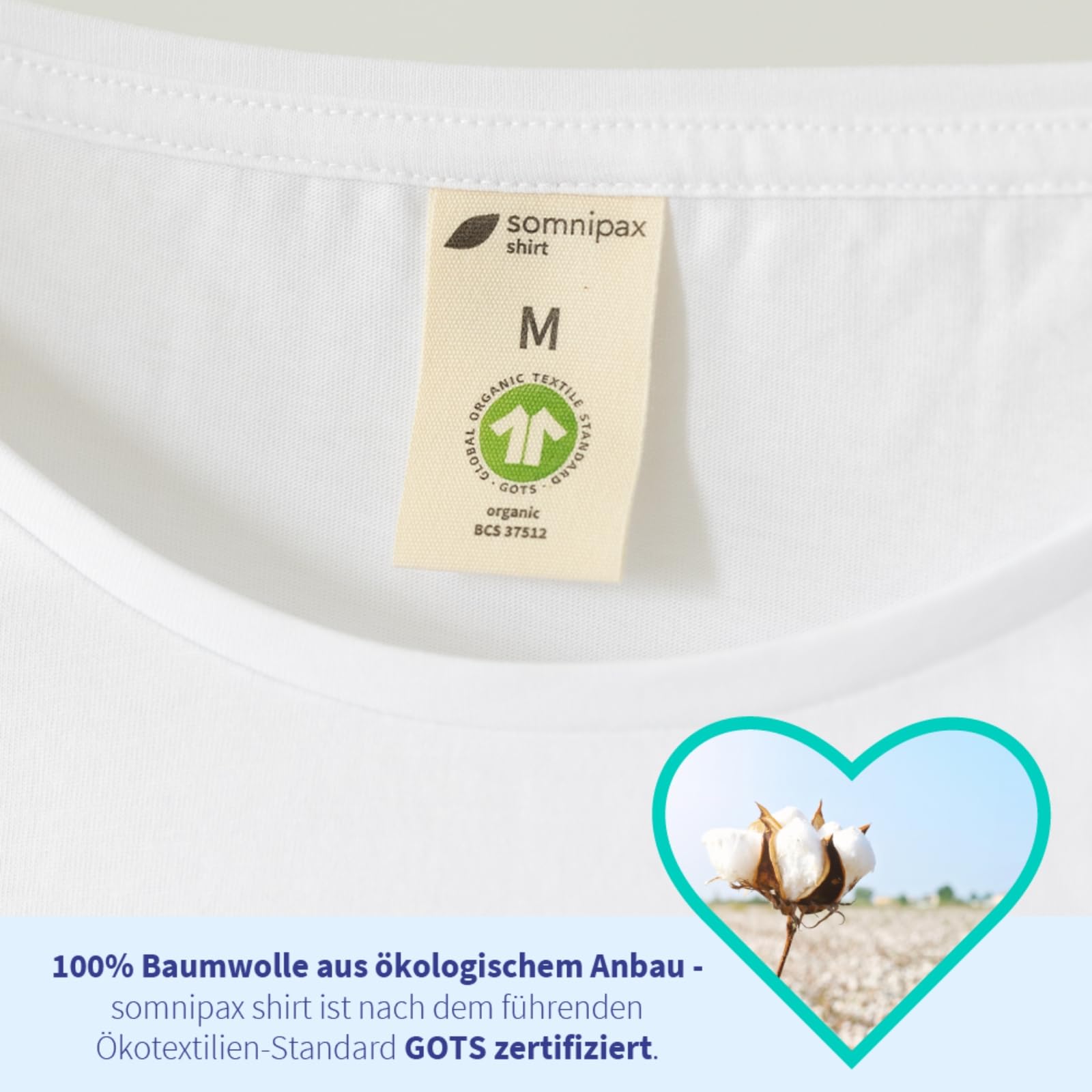 ["EFFECTIVE: Can help CPAP patients with position-dependent sleep apnea to lower CPAP therapy pressure by sleeping on their side. Also an excellent anti-snoring shirt for beginners, helps with back sleeping-related snoring and position-dependent sleep apnea (mild/moderate).", "STABLE AND COMFORTABLE: The firm foam roll keeps you stable in a supine position. Shirt made of 100% organic cotton is pleasantly soft. No annoying straps and clips, no sweating, no cutting into the arms.", "INDIVIDUAL: the perfect shirt for every user. Different cuts for women and men; available in common clothing sizes (XS – XXL for women, S-XXXL for men).", "DISCREET: Anti-snoring shirt has a classic T-shirt shape with a V-neck (men) or round neck (women). Easily combinable with sleepwear. You practically don't feel like you're wearing a medical device.", "ORGANIC: Shirt is certified according to the leading ecological textile standard GOTS. T-shirt material: 100% cotton (from controlled organic cultivation). Made in the EU."]