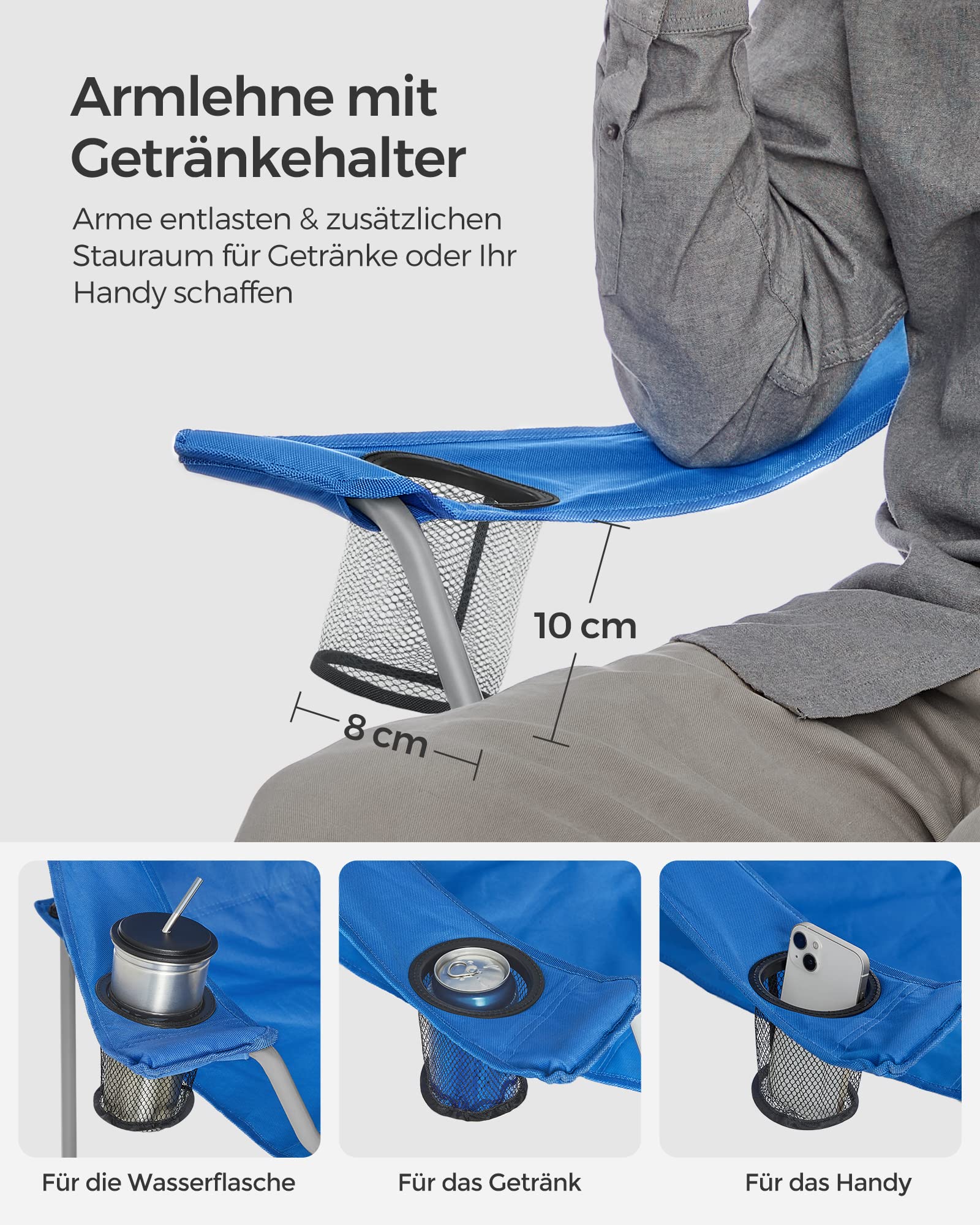 ["Comfortable sitting position. Backrest height: 54 cm, seat size: 42 x 42 cm (D x W), distance between seat and floor: 43 cm. This ergonomic fishing chair is designed to provide optimal seating comfort.","150 kg weight capacity. Steel frame, tubes with a wall thickness of 0.8 mm - very stable; 600D Oxford fabric with water-resistant coating - extra wear-resistant and durable. The camping chair can support up to 150 kg.","Compact & portable. The compact folding chair weighs only 2.6 kg and can be folded and stored in the included transport bag (Folded size: 13 x 90 x 13 cm), making it easy to place in the car or hang on the backpack.","Practical to use. Simply unfold the beach chair for use - no complicated assembly. Additionally, the chair has a cup holder to store your drink, phone, water bottle, or other small items.","Suitable for various scenarios. These 2 foldable camping chairs meet different needs - fishing by the river, sunbathing on the terrace in the afternoon, hiking or watching football, all no problem"]