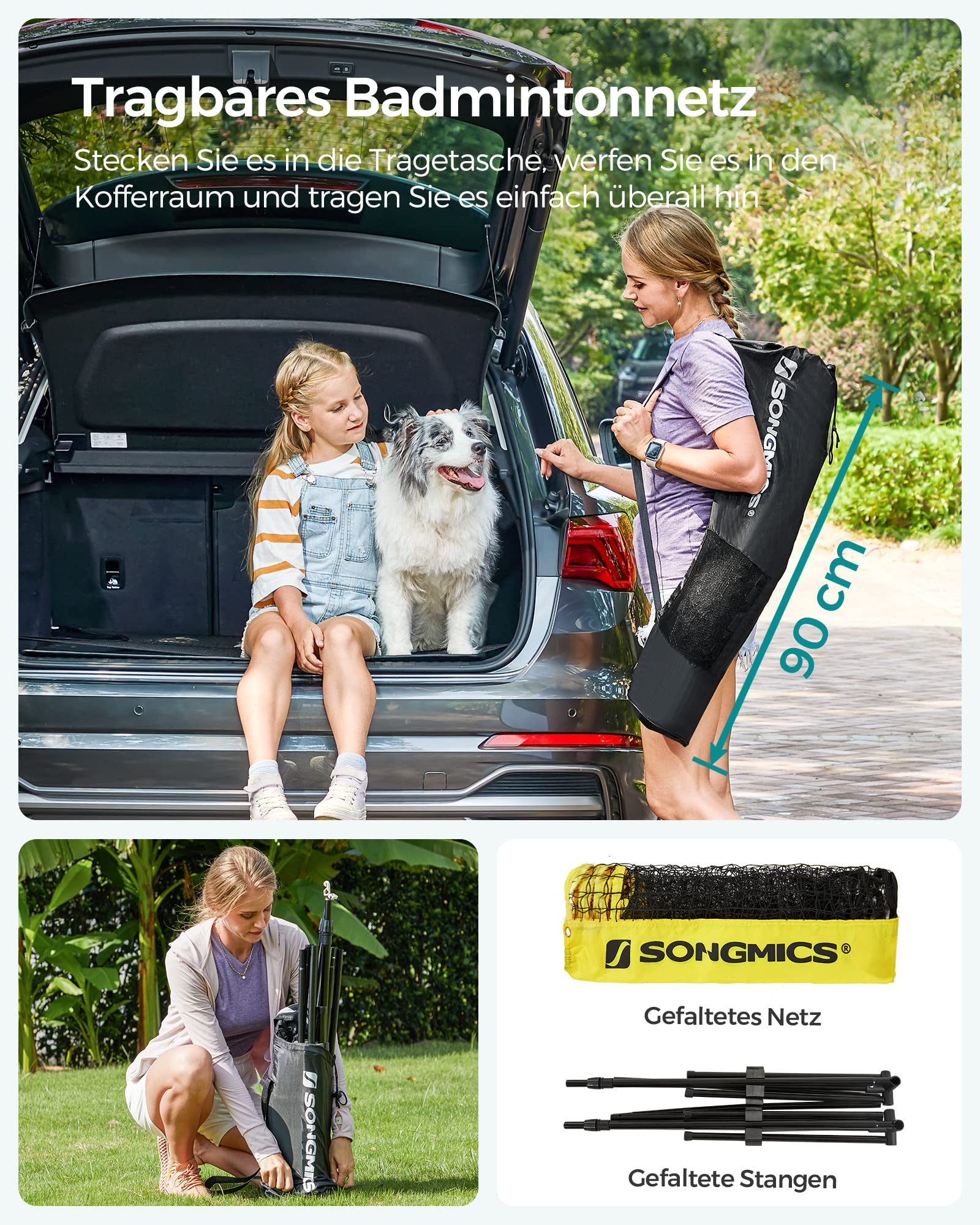["Suitable for many sports] The markings on the posts allow for easy height adjustment between 35.4 inches and 61 inches. This net is suitable for Badminton, Beach volleyball, and Tennis.","Portable] Fold and store this badminton net in its included 35.4 x 7 inch carrying bag, put it in the trunk of your car, and you're good to go! You can take it anywhere","Versatile] Set it up in your garden, at the beach, or on the lawn to play with your loved ones. This portable volleyball net is truly convenient","Sturdy Structure] Thanks to the triangular bases and 4 metal pegs, the structure of this tennis net is stable and can withstand wind","Durable] The 0.8mm thick poles are coated with rust-proof coating. The net is tear-resistant due to the 3-strand PE rope and will last for many years. Once installed, the top of the net is perfectly tensioned"]
