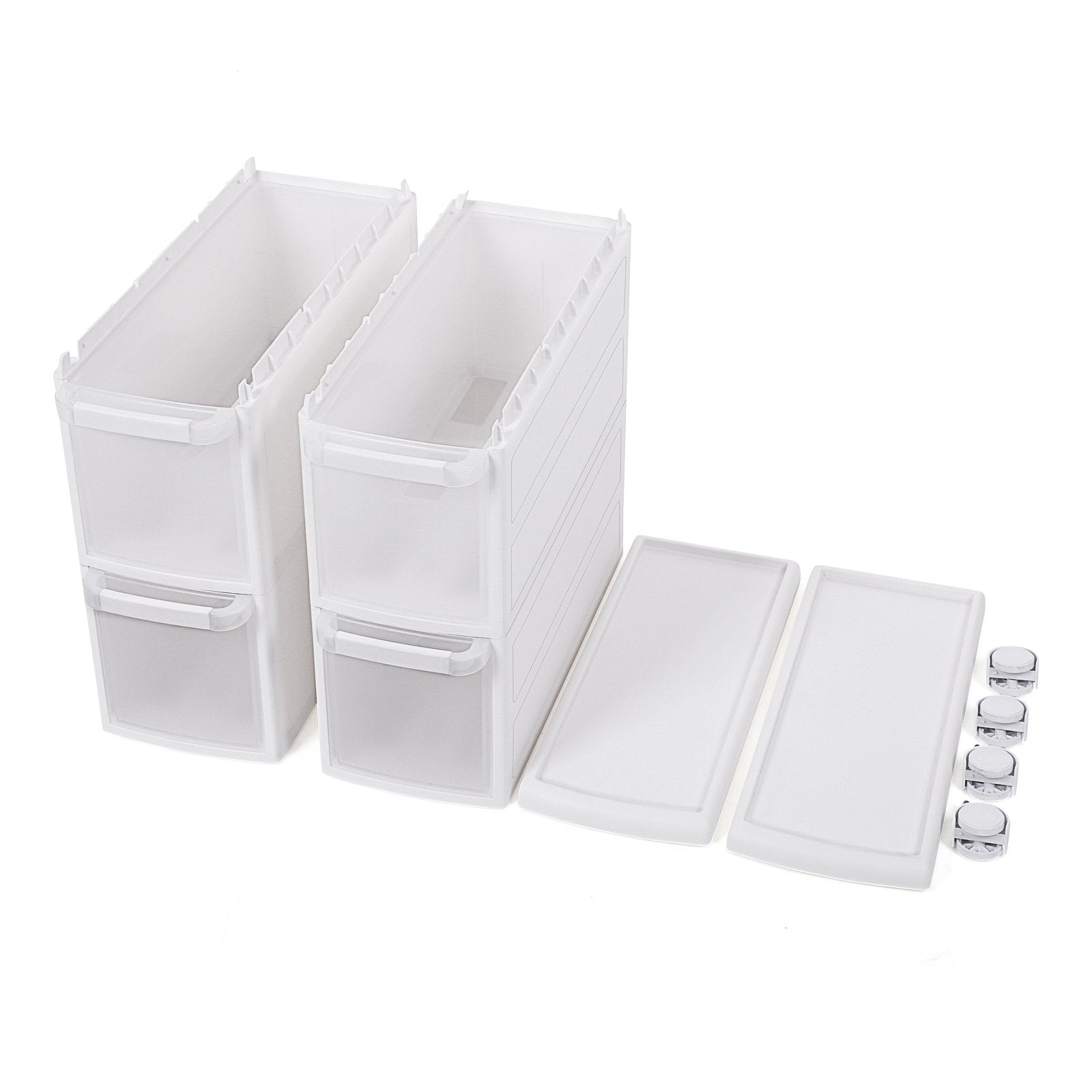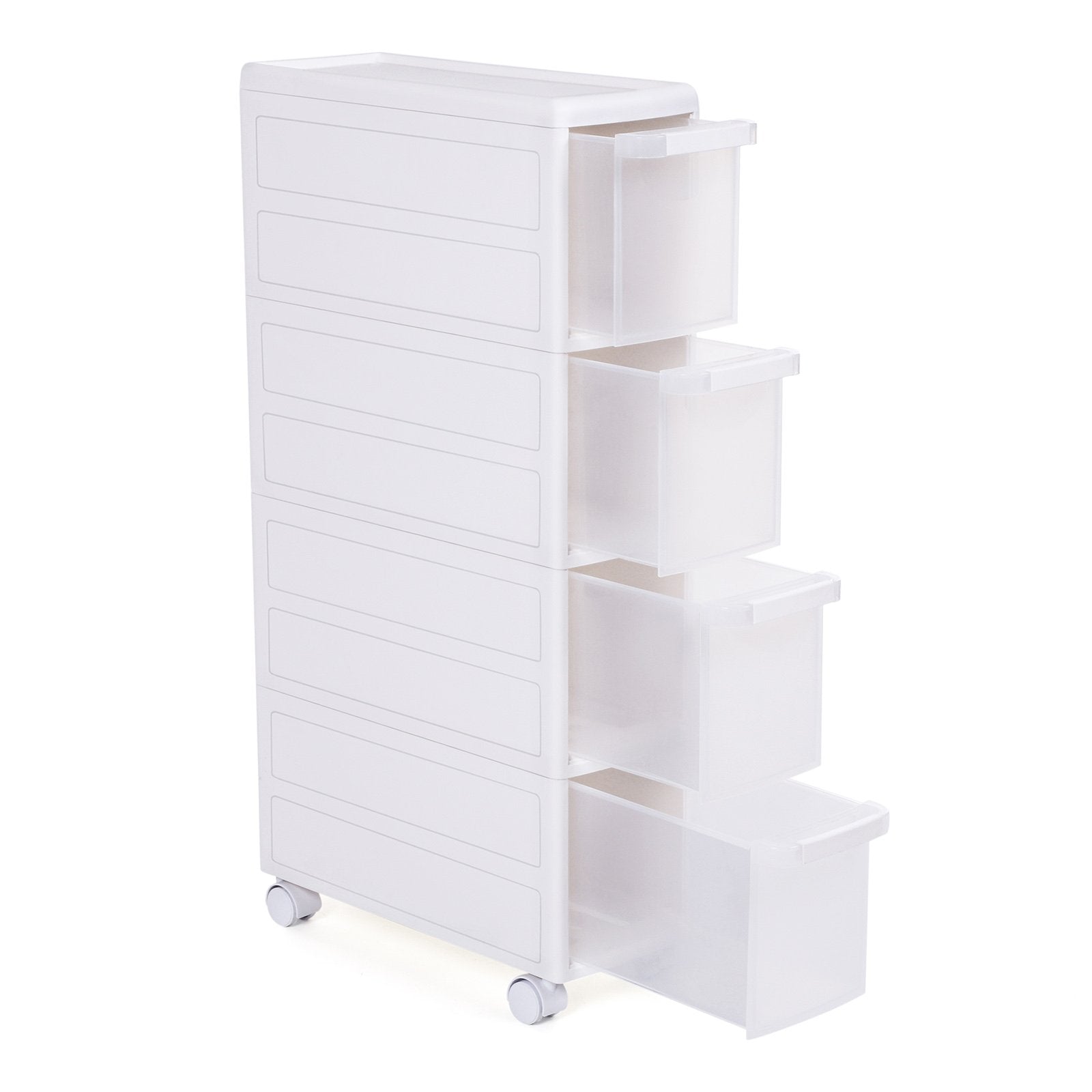["4 levels flexible adjustable - As needed, the 4-compartment storage shelf can be fully utilized or a single drawer can be removed and used separately","The niche shelf can be installed in kitchen niches between the sink, refrigerator, wall, or in the bathroom between the sink and shower or bathtub with its slim design (18 x 84.5 x 46 cm, W x H x D) and provides useful storage space with 4 drawers, the top plate also serves as an ideal storage location","Easy assembly and good packaging - Quick assembly without tools; the sturdy packaging ensures that the shelf arrives in perfect condition","Easy movement - With 4 wheels, the niche shelf can be easily and conveniently pulled in all directions and quickly pulled out for cleaning hidden corners","Versatile - With a beautiful white look, the utility cart is perfect for storing various items like spices, bottles in the kitchen; shampoo, shower gel, bath towel in the bathroom, toilet paper or room spray next to the toilet"]