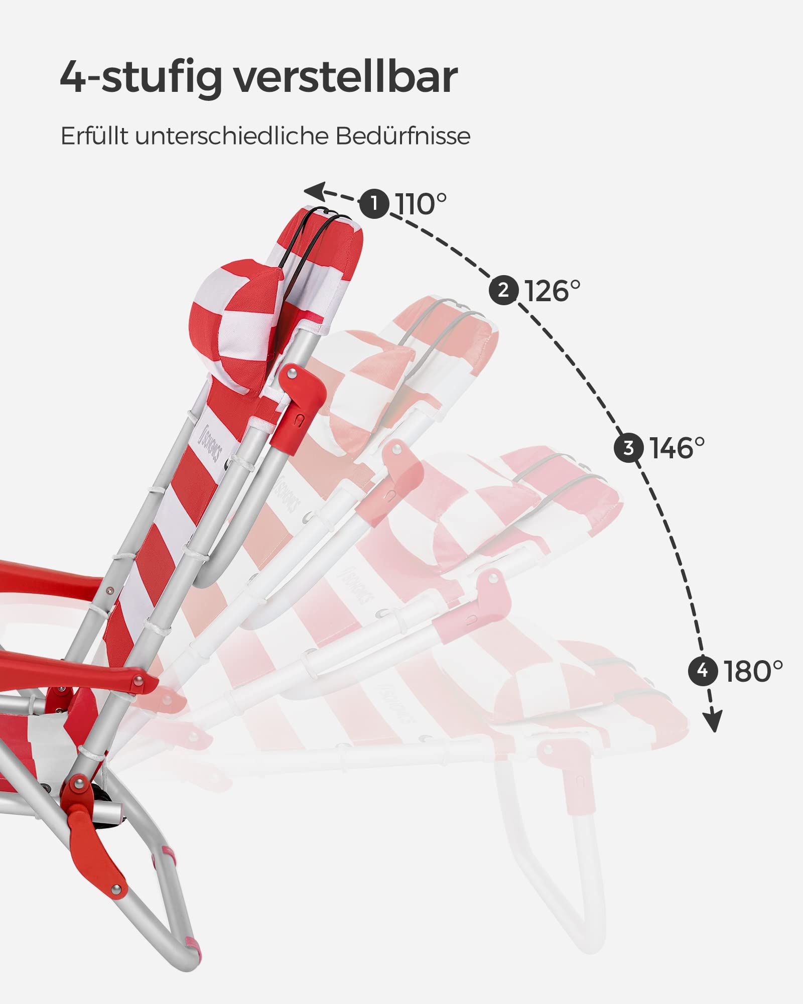 SONGMICS beach chair, camping chair, foldable, with shoulder strap, adjustable backrest, headrest, armrest, 2 side pockets, red and white GCB062R01