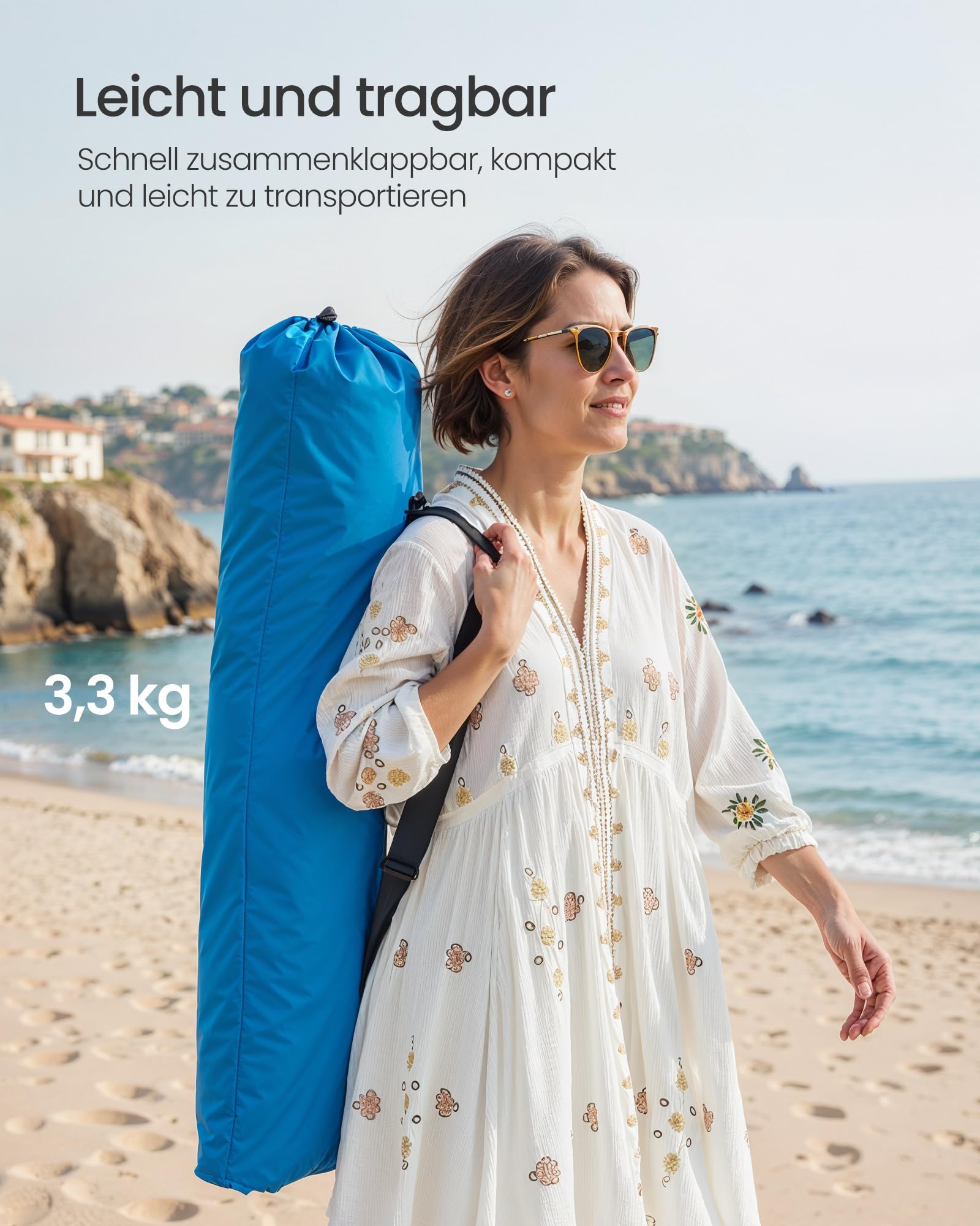 "Folding & portable: This beach chair can be easily and quickly folded and stored in the included bag. Just throw it over your shoulder and you're ready to go. Large non-slip foot pads: Thanks to the foot pads, you don't have to worry about the stability of the camping chair. They also increase the contact area with the ground and prevent the chair from sinking in mud or sand. Comfort is a priority: With the high backrest, you can fully relax your body; the foam-covered armrests provide more comfort for your arms. Versatile: The blue portable folding chair is not only suitable for the beach, but can also be taken camping, hiking, traveling, and fishing. Sturdy & durable: The 600D Oxford fabric is durable, tear-resistant, and suitable for outdoor use; furthermore, the frame is made of high-quality steel tubes and can support up to 150 kg."
