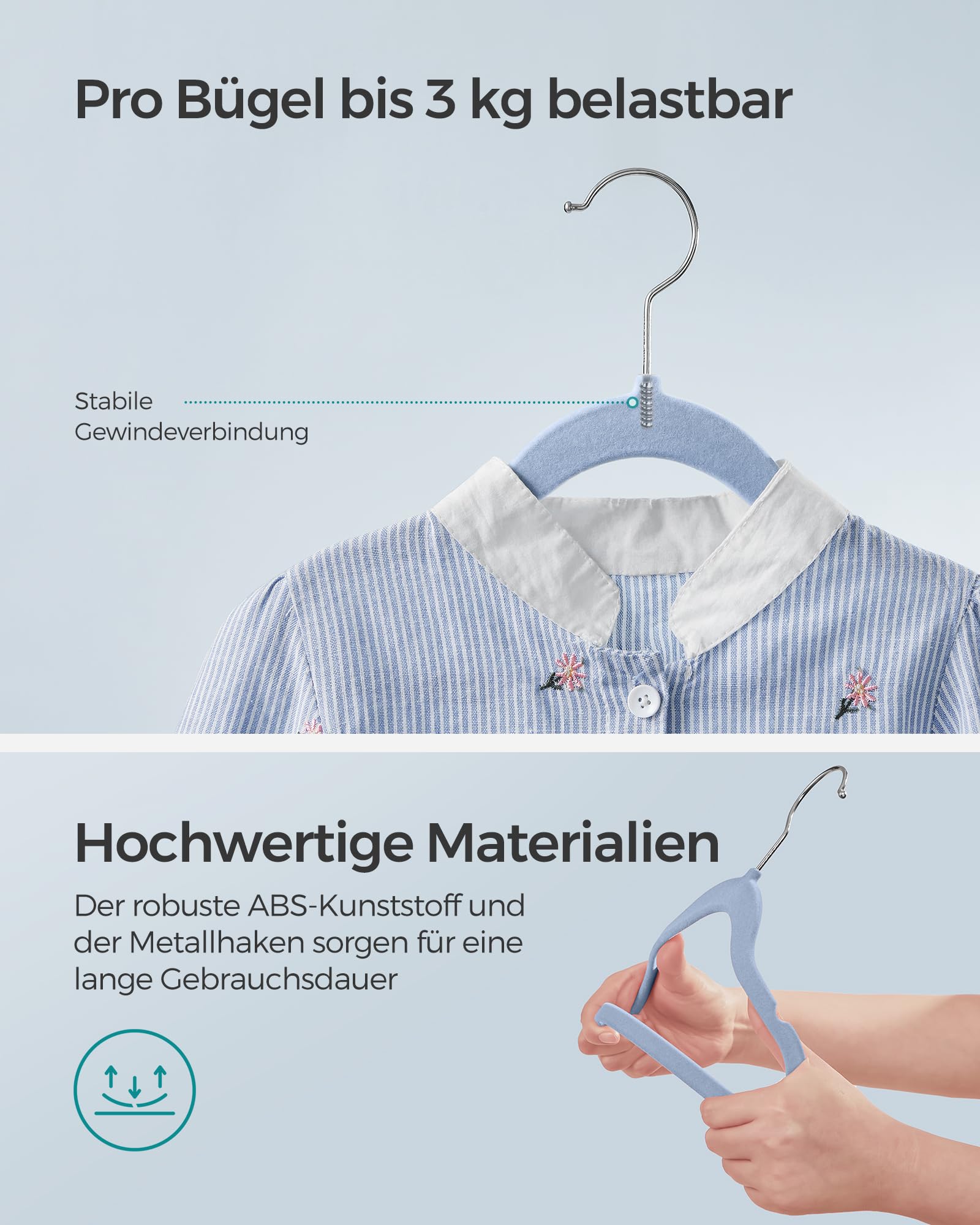 "Durable and sturdy! Each velvet hanger is made of high-quality ABS plastic and metal hooks and can hold up to 3 kg. Whether it's children's winter jackets or heavy jeans, these children's hangers can handle any clothing."