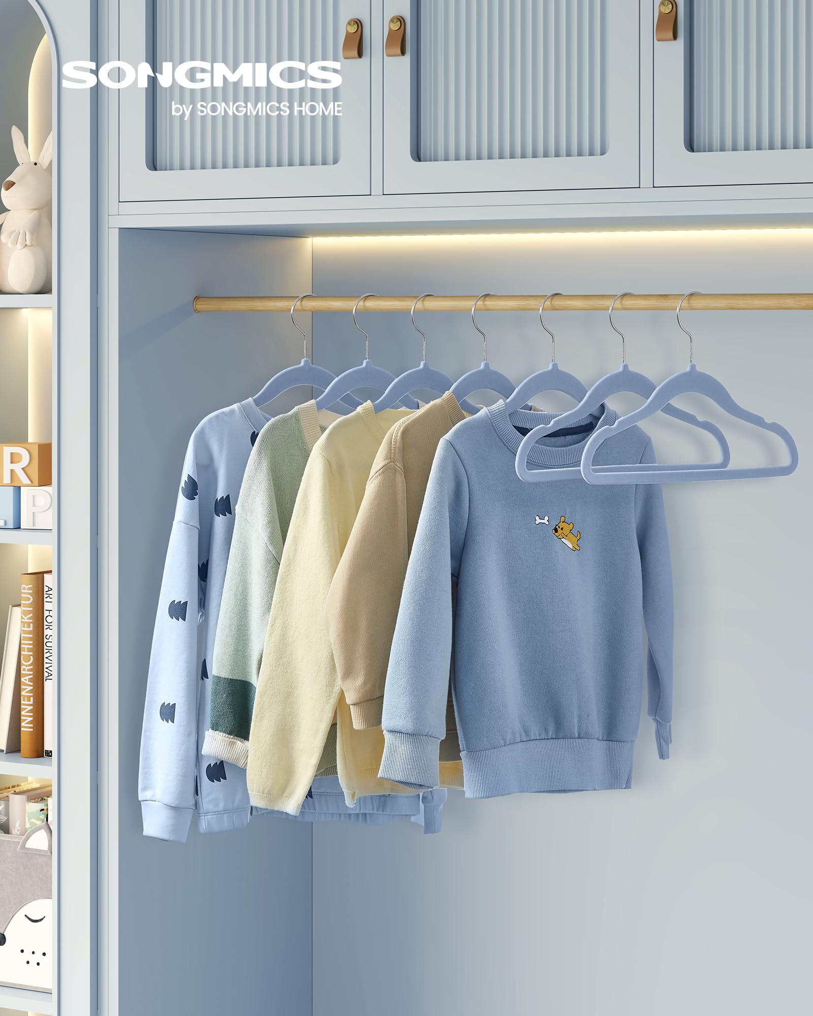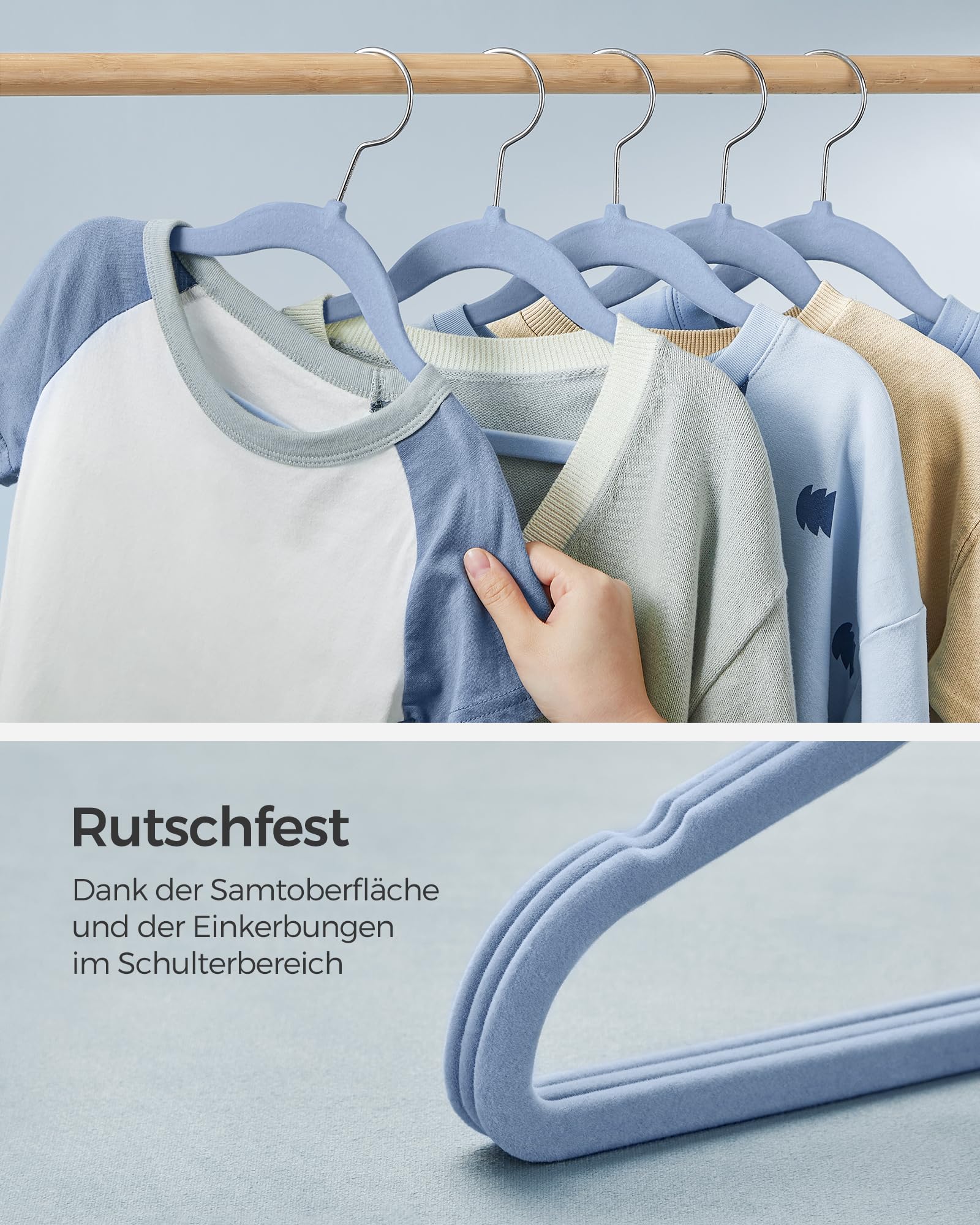 SONGMICS Children's Hangers, Set of 50 Kids Hangers, Baby Hangers, Velvet Hangers, 360° Rotating Hook in Silver, Space-saving, Non-slip, for Wardrobe, Pale Blue CRF027Q05