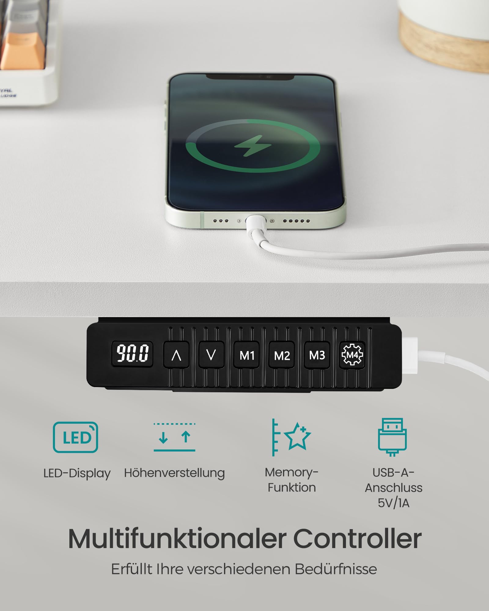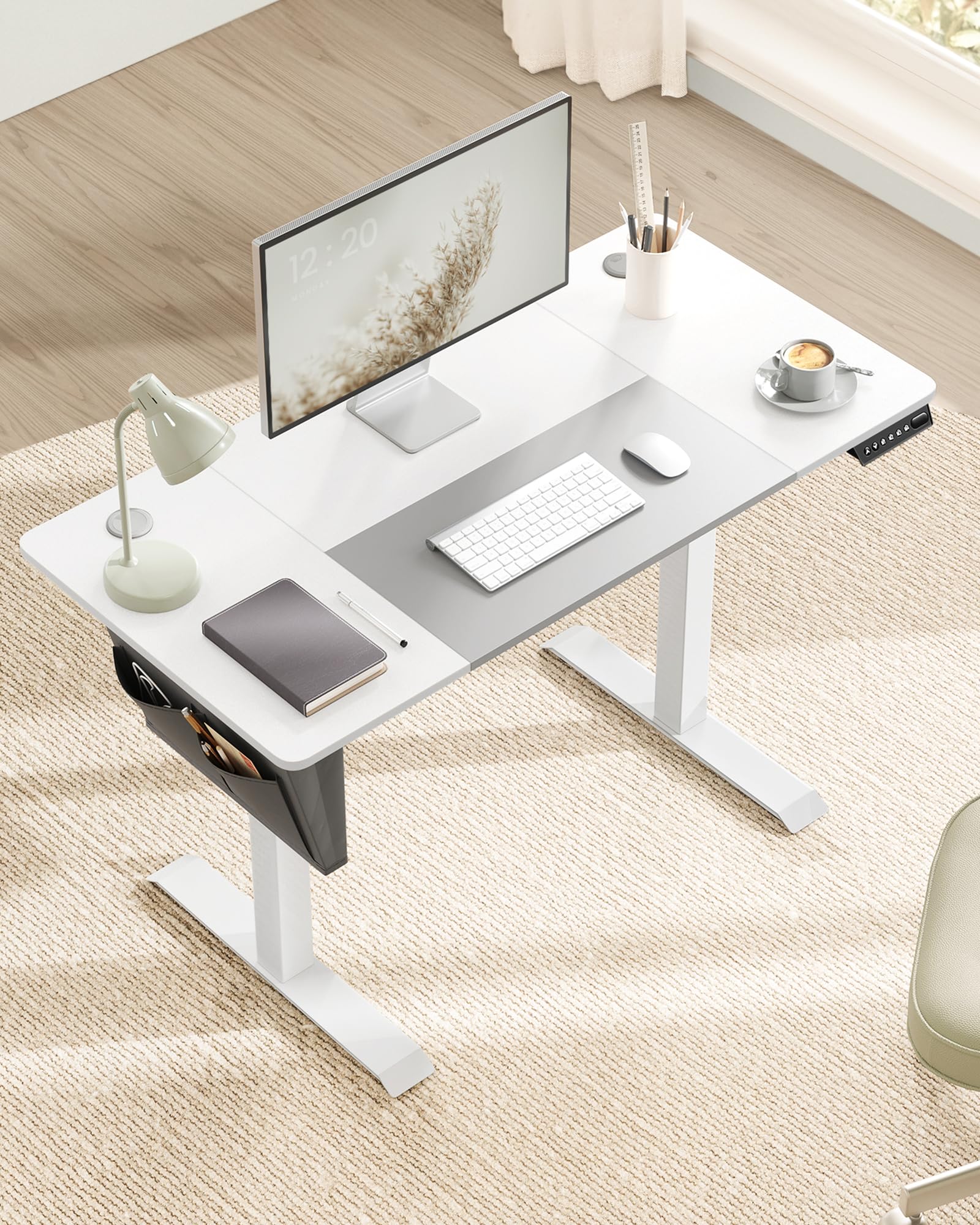 ["Promote healthy posture: Adjustable between 28.3 and 47.2 inches in height, switch between sitting and standing; also, the table can store 4 heights as quick settings","Good quality: With a sturdy steel frame and thick tabletop, this table can hold up to 154 lbs; high-quality motor for smooth and quiet adjustments (< 48 dB)","All in order: 2 cable holes for good cable management; stylish fabric organizer for storing small items; large hook for bag or headphones","Stylish & practical: This tabletop with different colored surfaces is attractive; the middle part in leather look not only brings style but also improves mouse glide","Easy assembly: With detailed instructions and labeled parts, you can easily assemble the height-adjustable desk to save time and energy"]