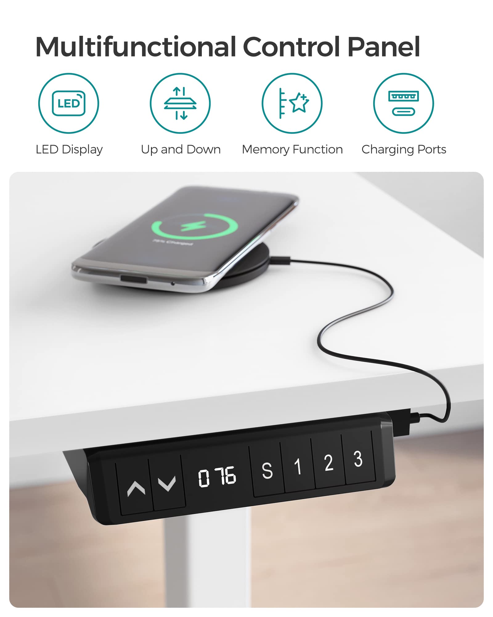["[Adjustable Height] This table base is height adjustable (28-46 inches), suitable for people with a height of 3.6-6.4 feet. Sit or stand? Find the ideal posture to relieve your body and learn or work efficiently","[Stable & flexible] Thanks to the steel structure, this table stand is stable and can support up to 176 lbs; the adjustable feet compensate for uneven surfaces and protect the floor from scratches, they can also be replaced by 4 wheels for easy transportation","[No Noise] With a high-quality motor, it guarantees a quiet and smooth height adjustment, the adjustment speed is 25 mm/s, the noise level is low (< 50 dB), so you can continue working or learning undisturbed","[Practical Design] Save 3 heights with the buttons; charge your devices with USB and TYPE-C ports; there is also a collision protection system","[Adjustable Table Base] This sturdy steel table base is adjustable in length from 33 to 51 inches, making it suitable for a variety of tabletops (43-63 inches long, 24-32 inches wide)"]