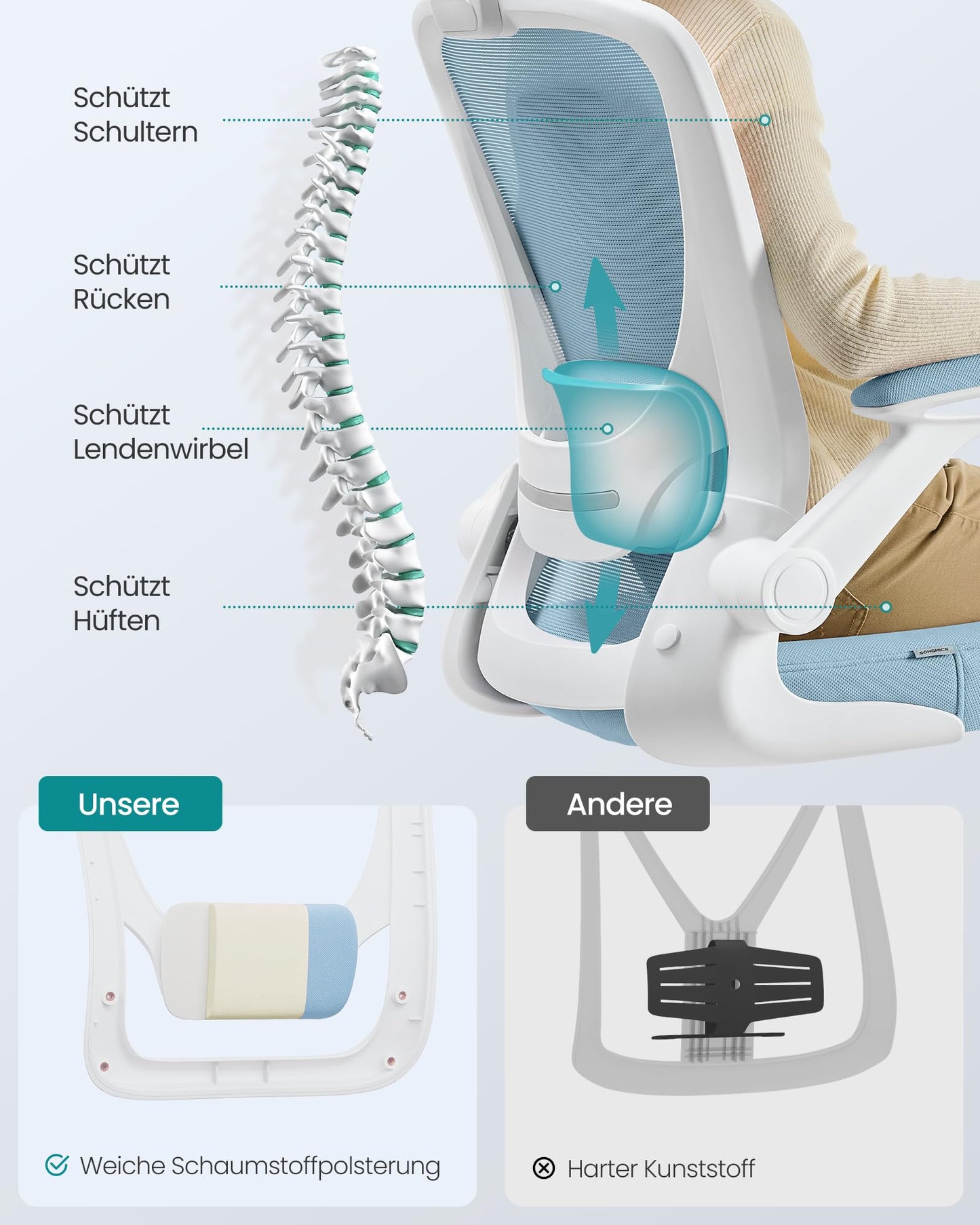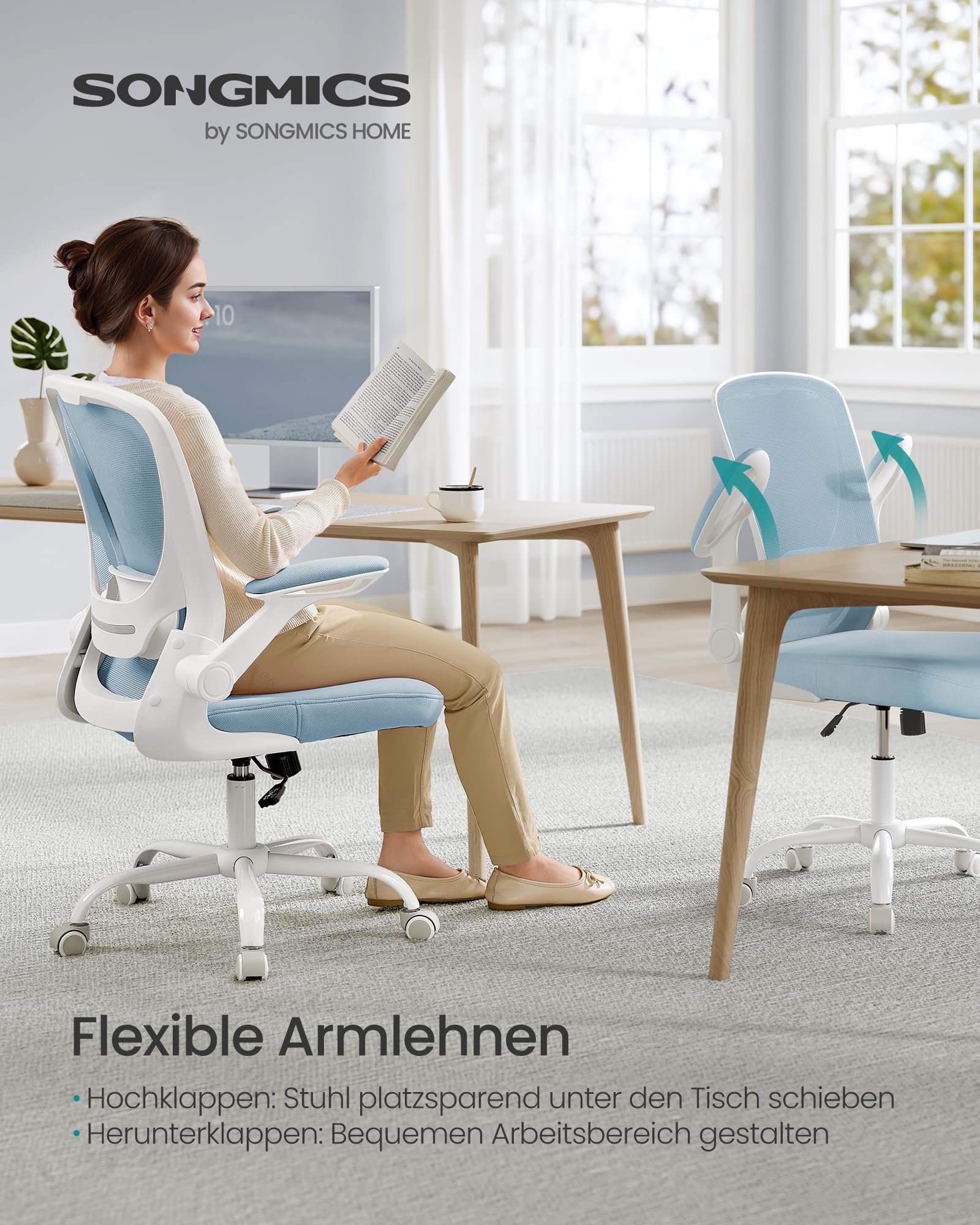 SONGMICS ergonomic office chair with mesh, lumbar support, rocking function, 53 cm wide seat, foldable armrests, for work and bedroom, students, misty blue OBN037Q01