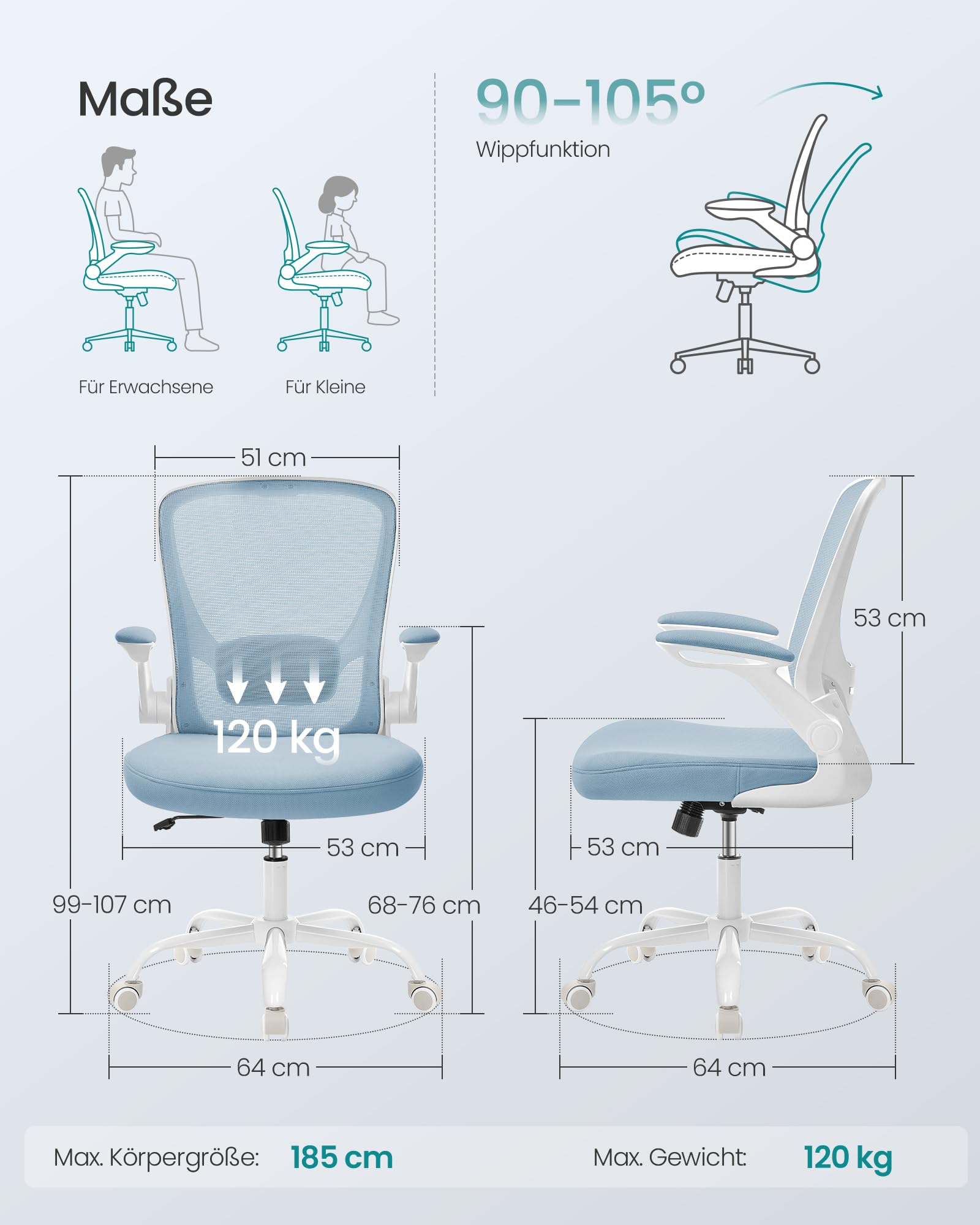 ["Ergonomic design] The S-shaped backrest hugs your body closely, and with the height-adjustable lumbar support, your back is well supported and fatigue effects are reduced","[Flexible & space-saving] The seat height is adjustable (46-54 cm) for your various needs. For relaxation, the 90-105° rocking function can be activated. The armrests are foldable to store the chair space-savingly under the desk","[Comfortable sitting] The 8 cm thick high-quality foam and the 53 cm large, soft seat cushion relieve pressure on the hips during all-day work; the mesh fabric is breathable, so you won't sweat even after sitting for a long time","[Robust and stable] With the high-quality gas lift cylinder and the stable metal base, this office chair supports up to 120 kg and provides strong and stable support","[Durable universal casters] The nylon casters are wear-resistant and have passed the 100,000-cycles test for the components. They also protect your floor from scratches","[Easy assembly] Thanks to the easy-to-understand instructions and the labeled parts, you can quickly assemble the desk chair"]