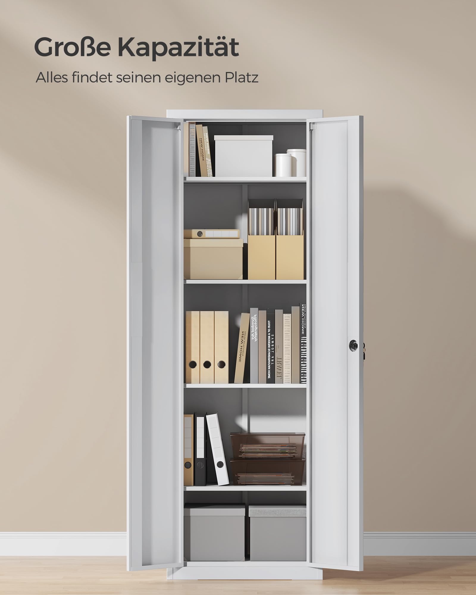 ["【VERSATILE】Use this metal cabinet in your home office to store files and documents and create an organized workspace or in the storage room to store tools, books, etc. and hide clutter","【HIGH LOAD CAPACITY】This filing cabinet (40 x 60 x 180 cm) is made of high-strength steel and each shelf can hold up to 25 kg. It is strong and durable and will accompany you for many years","【ADJUSTABLE SHELVES】The 4 shelves of this multipurpose cabinet are adjustable in height, allowing you to store items of different sizes","【MADE OF METAL】This utility cabinet is made of powder-coated and rust-resistant steel, keeping oil and fingerprints away. The surface is easy to clean and stays like new even with regular use","【STEEL LOCK】The steel lock is rust-free, sturdy, and wear-resistant, providing a high level of security to protect your personal items"]