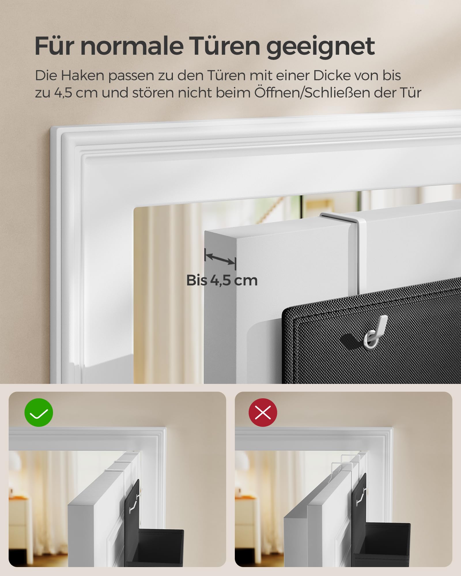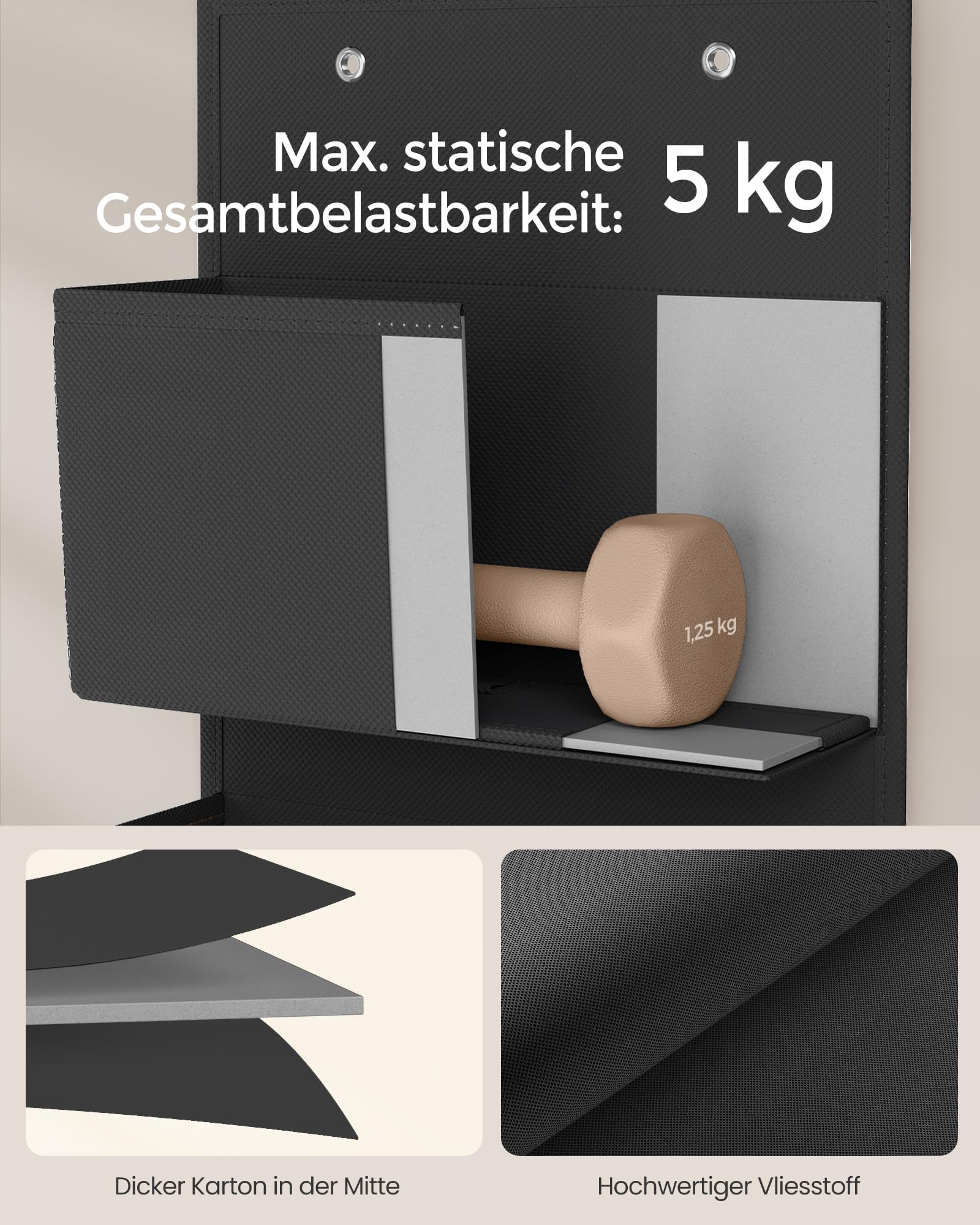 ["Use the space behind the door by hanging this organizer with four 12 x 33.5 x 17 cm pockets and create additional storage space when space is limited", "[Versatile] Each wall organizer with four 17 cm high compartments fits in the nursery to store diapers, in the bathroom to store toiletries, in the bedroom to organize underwear, or in the kitchen to hold utensils", "[Sturdy & durable] Each closet organizer is made of 80 g/m² non-woven fabric, with the front, bottom, and back reinforced with cardboard. The organizer can hold up to 5 kg (each pocket up to 1.25 kg)", "[Easy to hang] The hooks of the organizer are suitable for doors up to 4.5 cm thick, and the curved ends of the hooks prevent it from falling off. Thanks to their compact size, the hooks do not interfere when closing the door", "[Foldable & space-saving] When not in use, you can remove the hooks, take out the bottom plates, fold the door organizer, and store it in a corner – practical hanging storage!"]