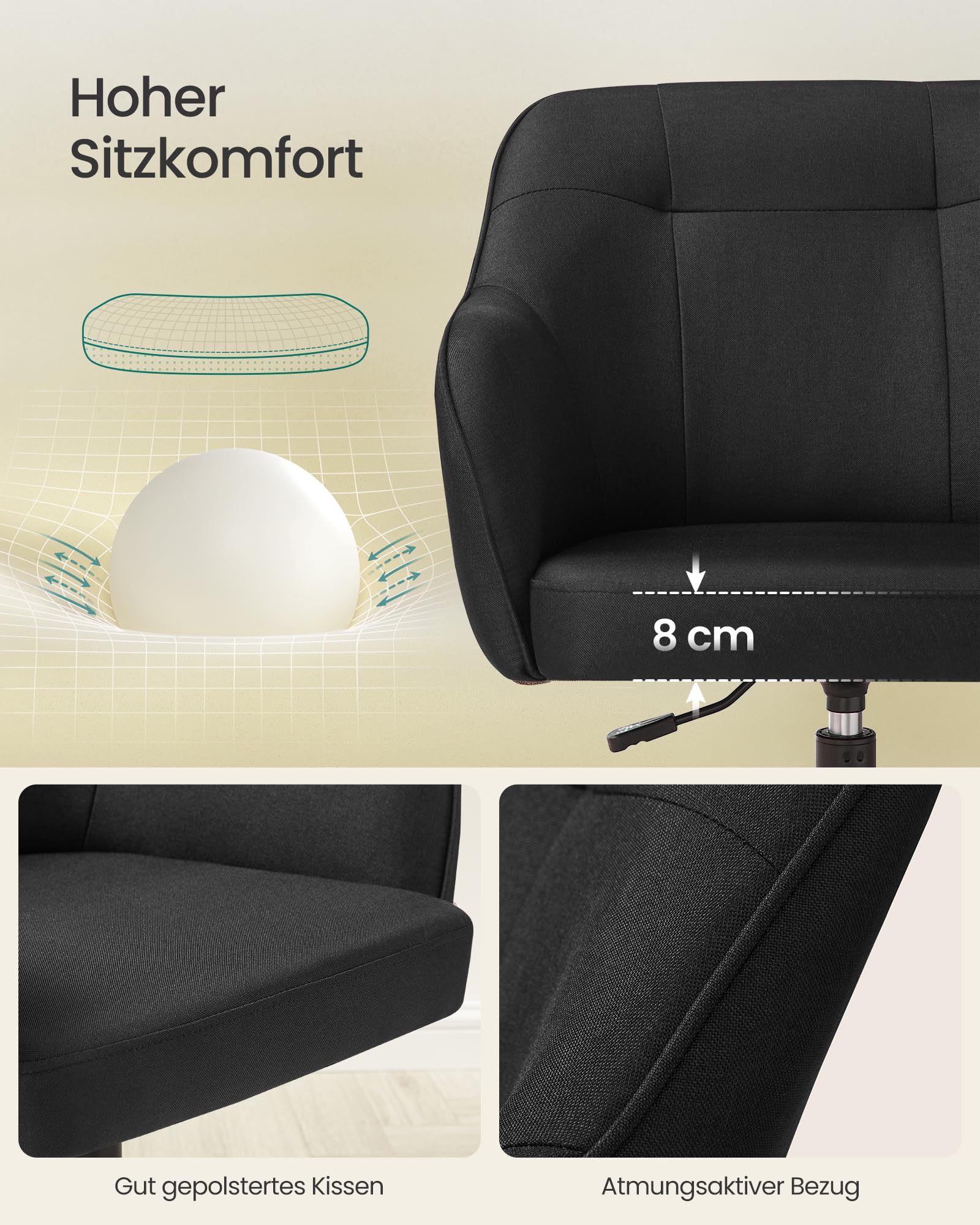 ["This swivel chair is well padded and features a curved, integrated backrest and armrests; it not only provides high seating comfort, but also adds a modern style to your home","The seat with foam padding combined with a curved backrest and armrests relieves your body. Everything is designed for high comfort","Attach the base plate with screws at the bottom of the seat, install the gas lift cylinder and the casters - in just a few steps the computer chair is ready to use","The surface of the work chair made of cotton-linen blend fabric is skin-friendly and breathable, allowing your body to "breathe" even during long periods of sitting","Capable of supporting up to 110 kg, providing stable and reliable support"]