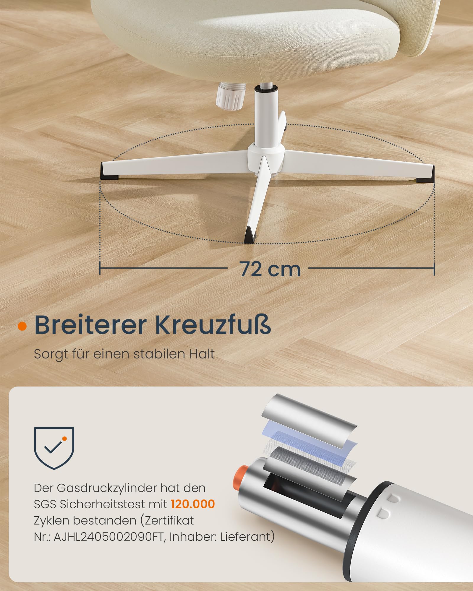 ["【MODERN STYLE】The unique crossed base combined with modern design gives the desk chair a touch of elegance, making it easy to integrate into your room","【HIGH COMFORT】With a 26.4 inch wide seat and 13.8 inch high backrest, the white swivel chair provides high comfort. And with foam padding, the 3.9 inch thick cushion offers soft support","【BREATHABLE】The office chair covered with cotton-linen blend fabric is comfortable on the skin and breathable, keeping you cool even during hours of sitting","【STURDY & SAFE】The 0.1 inch thick mechanical base plate provides high stability. The 28.3 inch crossed base passed the static pressure test with a load of 2,505 lbs. The gas cylinder has been tested by SGS for maximum safety","【FLEXIBLE USE】The 90-105° rocking function is ideal for relaxing. The seat is adjustable in height by 3.1 inches, allowing you to take a comfortable sitting position and leg stance"]