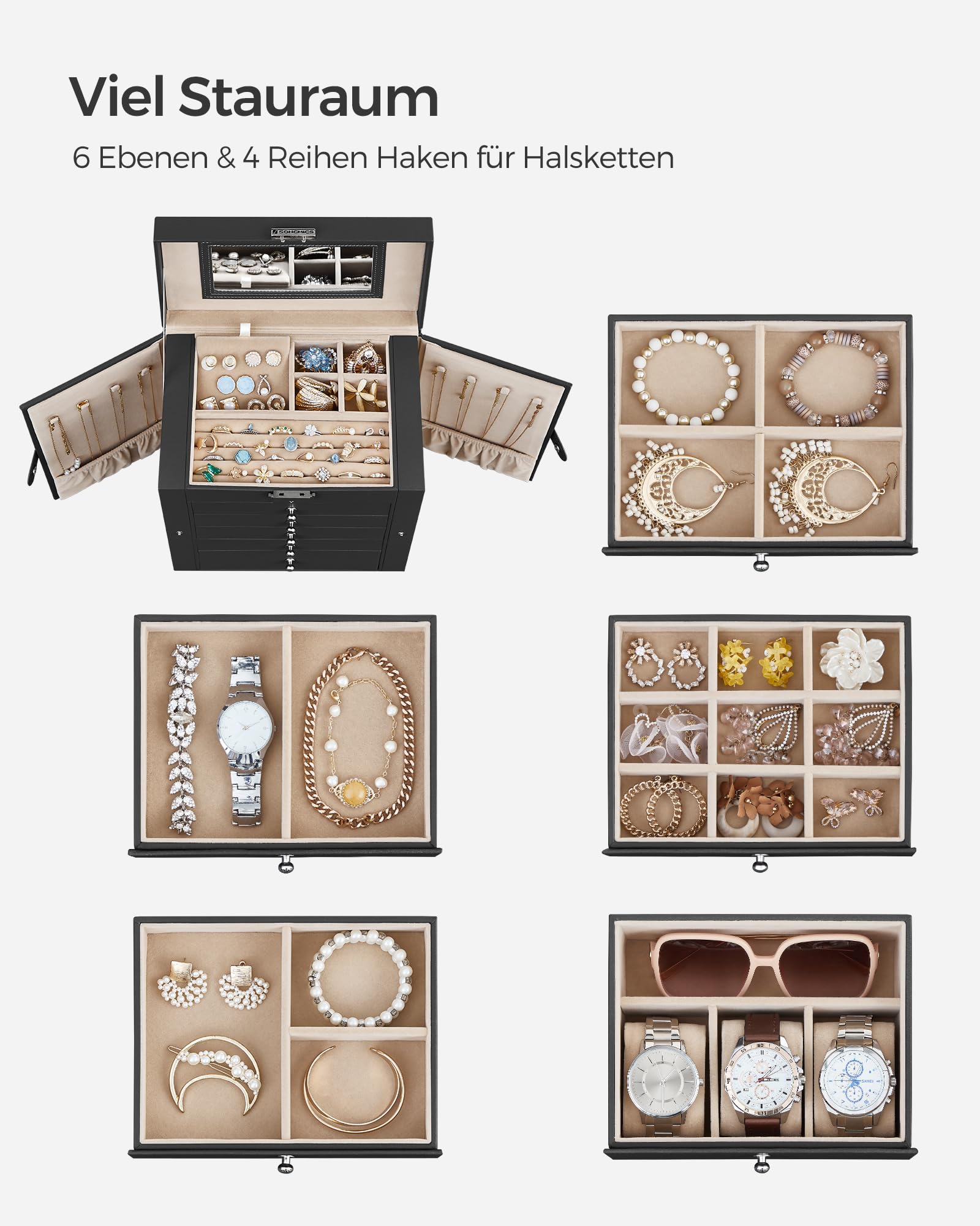 SONGMICS Jewelry Box 6-Tier, Jewelry Case with 5 Drawers, ample storage, interior mirror, lockable, jewelry storage, gift for your loved ones, for watches, black JBC152B01