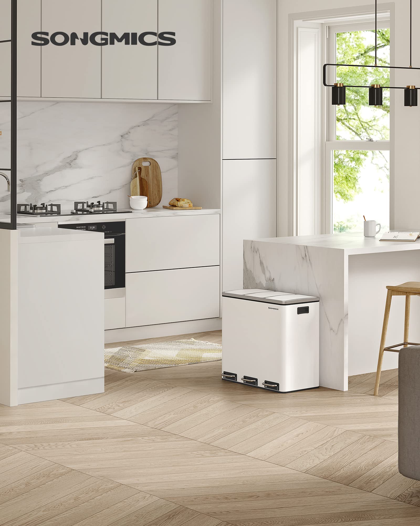 ["Waste Sorting Made Easy] With this trash can with three 18-liter compartments, you can easily sort your trash, such as packaging waste, organic waste, and residual waste","Rust Resistant] The kitchen trash can is made of steel and is rust resistant. Simply wipe the surface of the pedal bin for easy cleaning","[Softclose Lid] The lid of the kitchen trash can closes slowly, quietly, and gently, preventing unpleasant noises","[Modern Design] Clear lines, elegant cloud white color - this waste separation system looks modern and fits perfectly with other furniture and appliances","[Easy to Open and Empty] Simply step on the pedal to open the lid of this waste bin without touching it with your hands. The inner bins can be easily lifted and emptied thanks to the metal handles","[What You Get] 1 trash can with 15 garbage bags. Small note: The garbage can is suitable for SONGMICS garbage bags KRB020A02"]