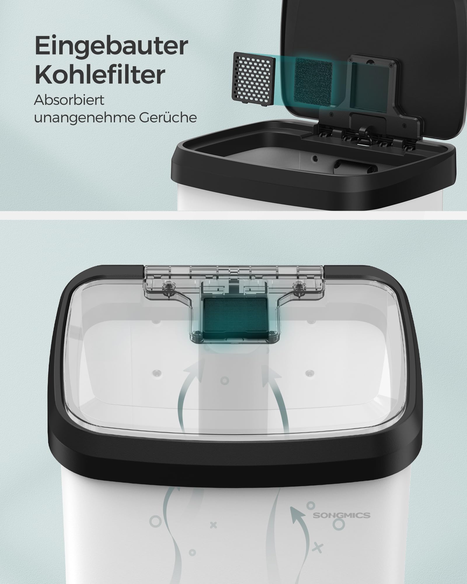 ["Thoughtful details"] The carbon filter in the lid absorbs unpleasant odors, keeping your kitchen smelling fresh. Included in the package are 15 trash bags (11-13 gallons) that perfectly fit this kitchen trash can.
